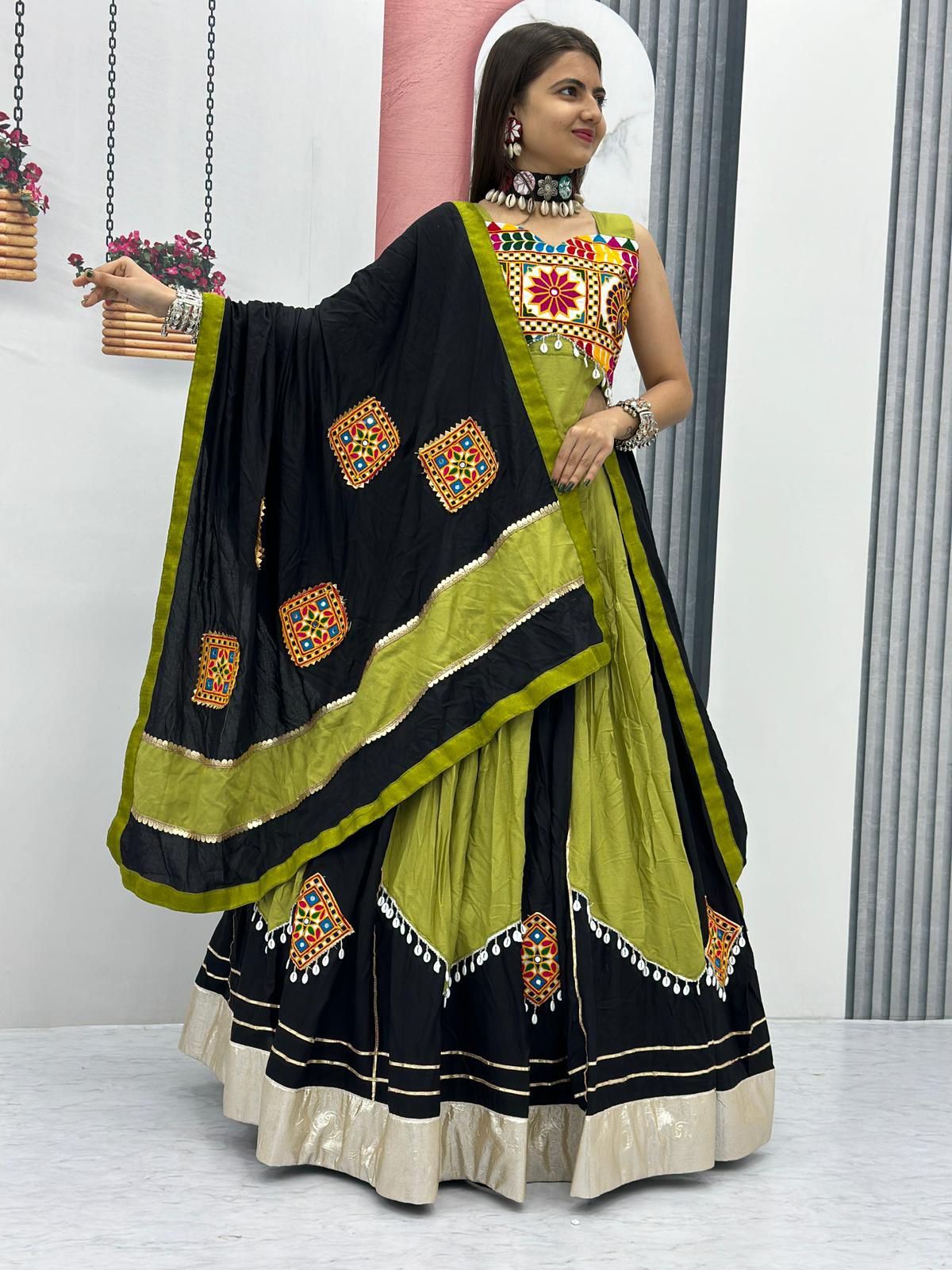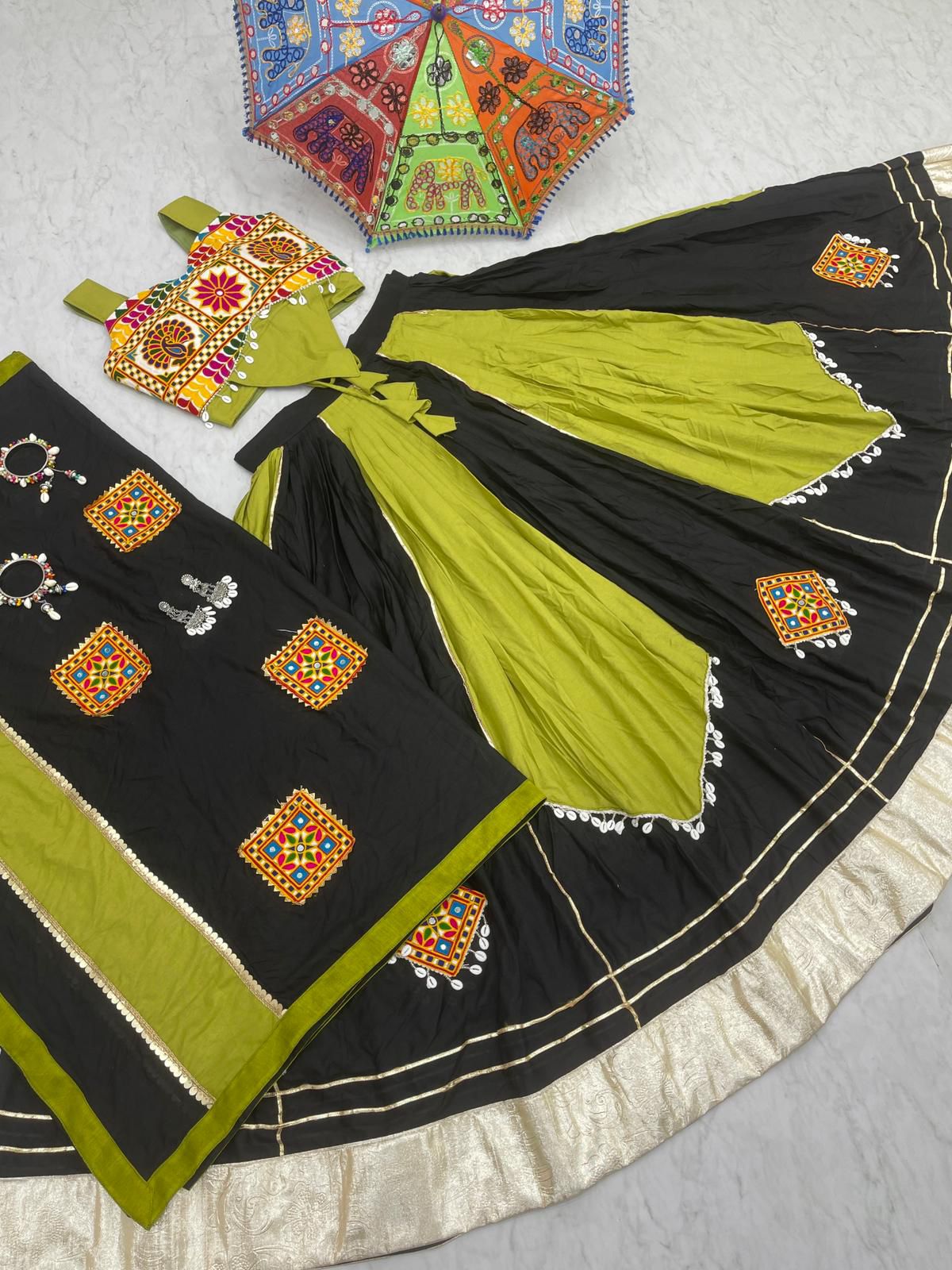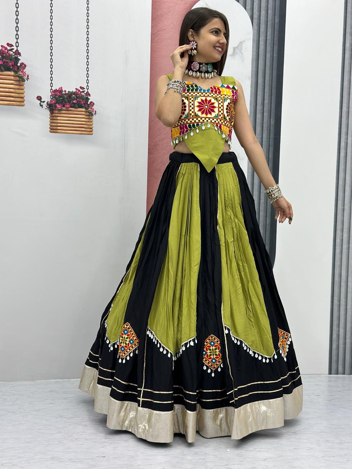 - Fabric Detail: Lehenga : Pure Cotton Heavy Gamathi Work With Embois Patta Canvas Patta, Size : 44 Apx, Flare : 6 Mtr, Inner : Micro Cotton , Blouse : Pure Cotton Gamthi Work Attached Extra Sleev, Inner : Micro Cotton , Dupatta : Pure Cotton Gamathi Work, Cut : 2.30 Mtr , Size : M Up To L Margin Xl Up To 2Xl Margin Fully Stitched
