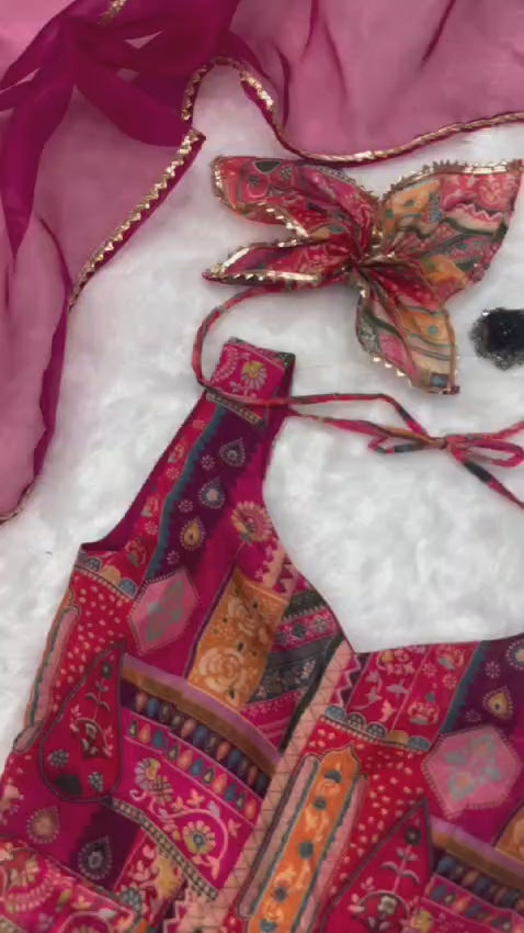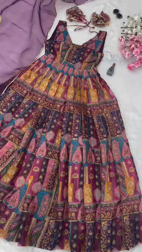 - Fabric Detail: Top : Pure Jimmy Organza Silk Digital Printed Padded, Length : 52 Apx, Flare : 8 Mtr, , Dupatta : Organza Silk With Designer Lace, Size : 34,36,38,40,42 Margin Available For 44