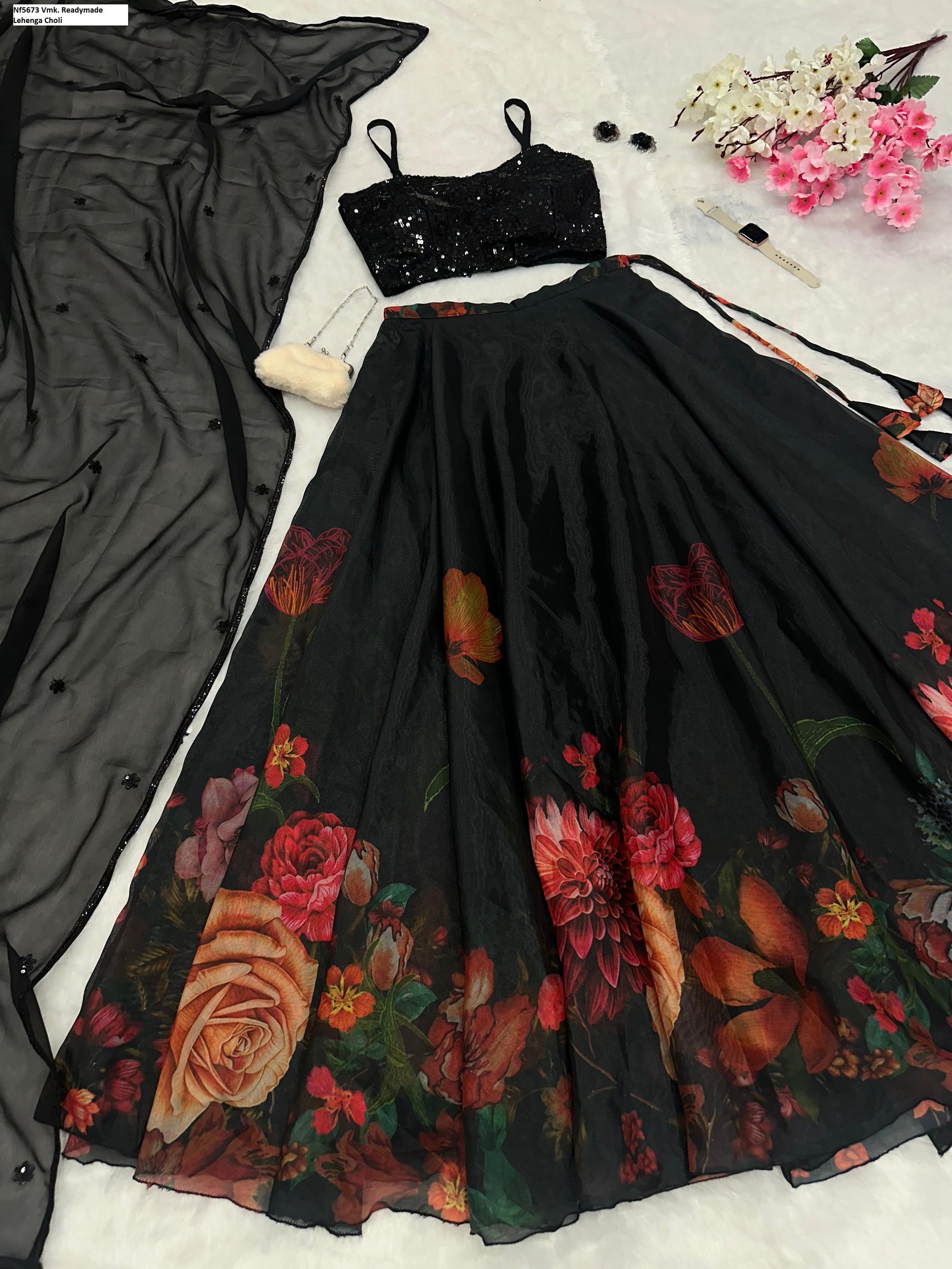 Fabric Detail: Lehenga : Pure Jimmy Organza Silk Floral Printed With Canvas Patta, Flare : 8 Mtr , Blouse : Georgette Sequence Work Designer Fully Stitched Size 38 Padded, Dupatta : Georgette Embroidery Sequence Work With Lace Border ,