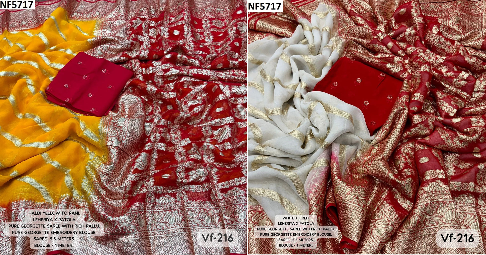 - Fabric Detail: Saree : Pure Georgette Leheriya Designs Beautiful Zari Woven Hand Dying Made In Two Combinations, Cut : 5.5 Mtr , Blouse : Pure Georgette With Sequence Work, Cut : 1 Mtr Unstitched , ,