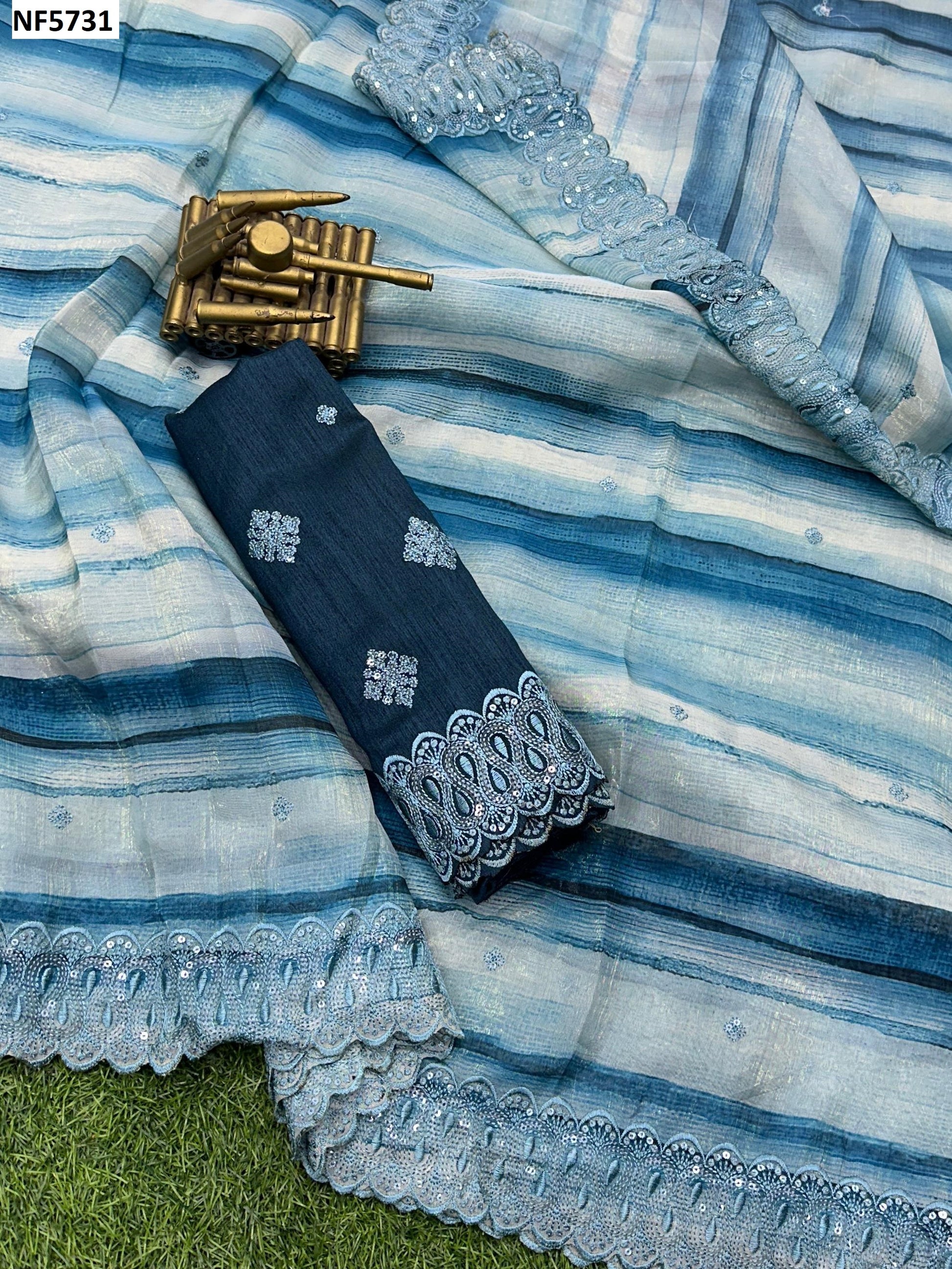 - Fabric Detail: Saree : Soft Fendi Organza Satin Digital Print And Sequence Work, Cut : 5.5 Mtr , Blouse : Mono Banglori Tone To Tone Thread Works With Sequence, Cut : 1 Mtr Unstitched , ,