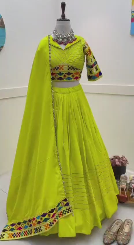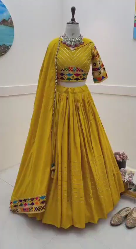 - Fabric Detail: Lehenga : Flex Cotton Embroidery With Mirror, Length : 42 Apx, Flare : 4 Mtr, Size : 44 Free Size Latkan Available , Blouse : Flex Cotton Embroidery With Mirror, Length : 15 Apx, Sleeves : 10 Inch, Neck Collar Padded Attched, Dupatta : Flex Cotton Embroidery With Mirror, Length : 2.2 Mtr , Size : L To 2Xl Free Size Extra Marging
