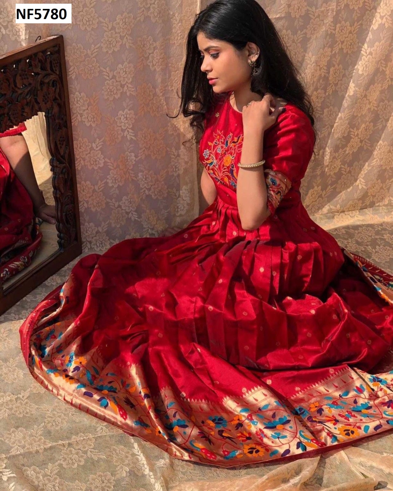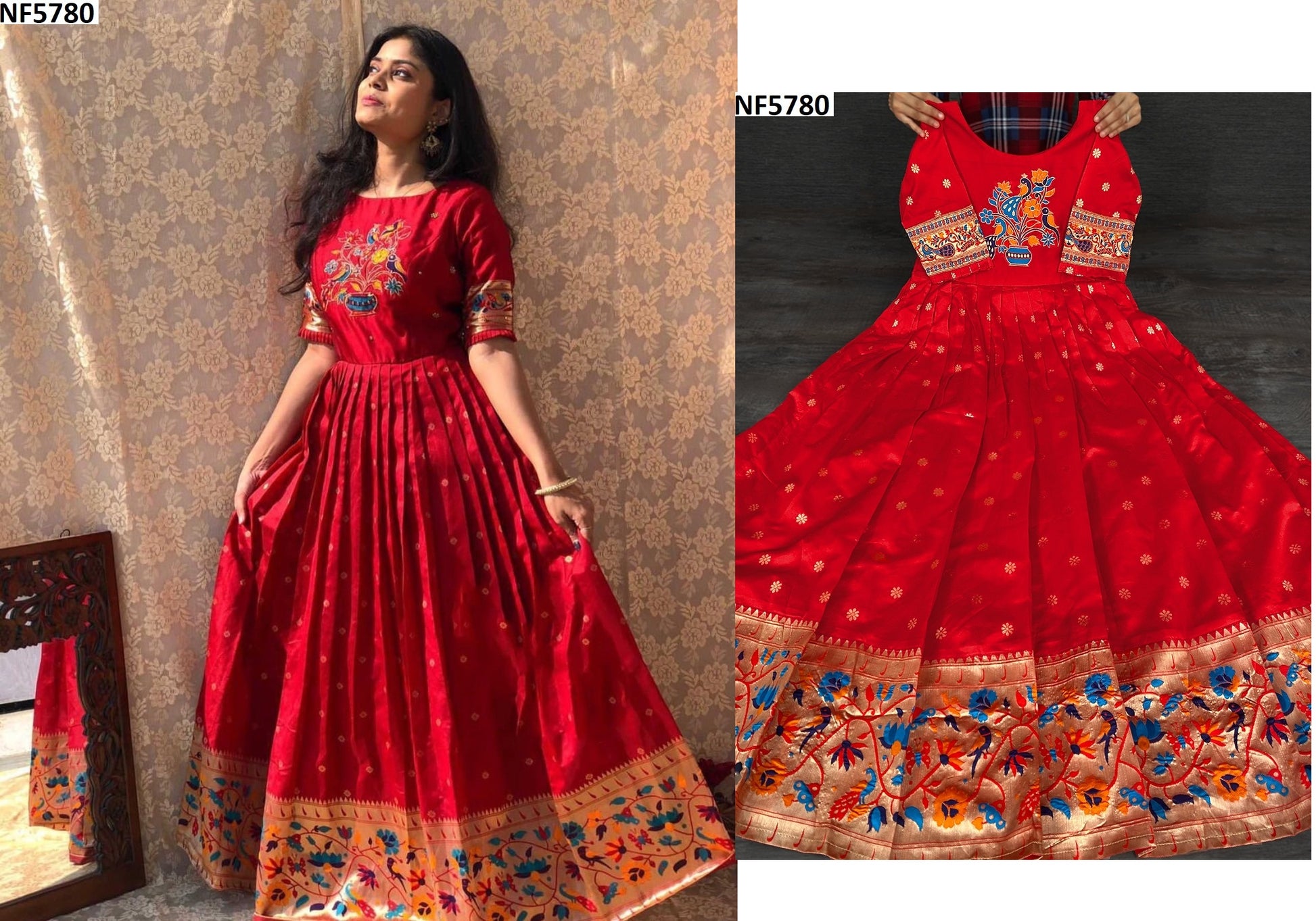 - Fabric Detail: Jacquard Silk Paithani Silk Linning Full Up To Bottom, Length : 57 Apx, Sleeves : 11 Apx, Waist : 38 Apx, Flare : 3.4 Mtr, , , Size : 40 Inside 2 Inch Extra Margin Available So You Can Adjust Support Up To 42 For Your Body Comfort