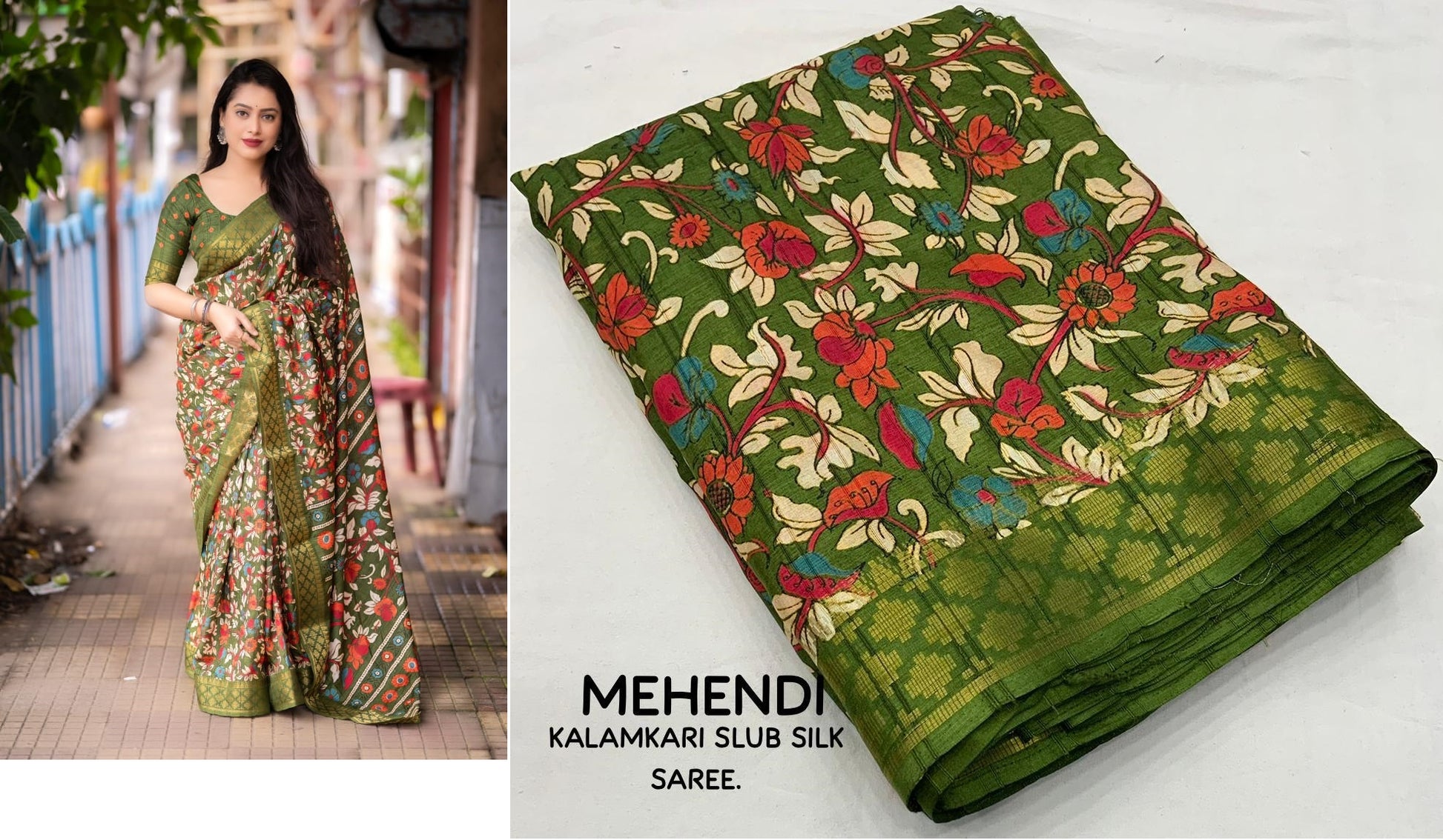- Fabric Detail: Saree : Soft Slub Silk Kalamkari Printed With Jacqurad Woven Zari Border, Full Length : 6.30 Mtr , Blouse : Running Slub Silk , ,