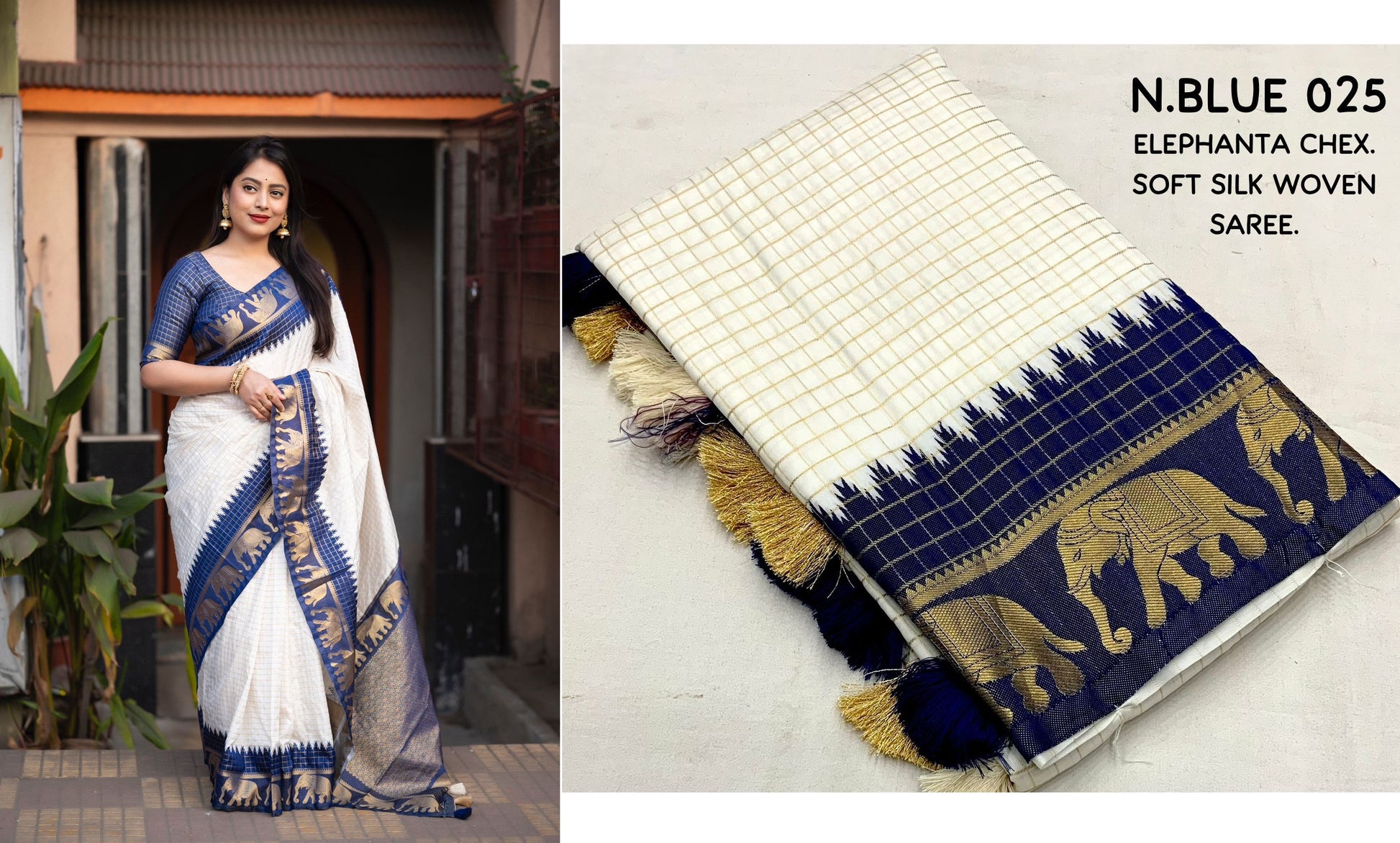- Fabric Detail: Saree : Soft Silk With Zari Woven Chex And Elephant Border And Rich Pallu Tassels On Pallu, Cut : 5.5 Mtr , Blouse : Perfectly Matched Runing, Cut : 1 Mtr Unstitched , ,