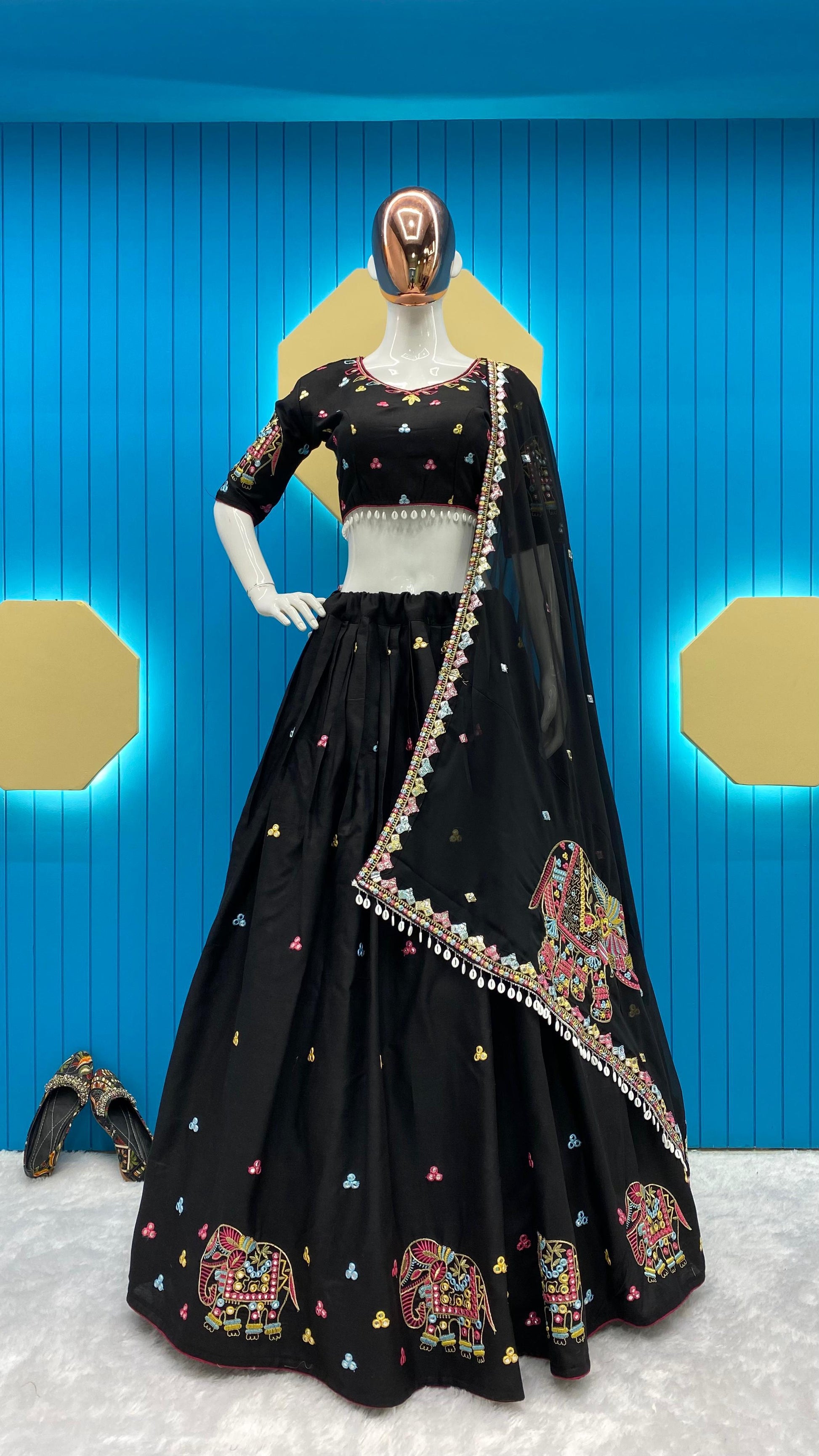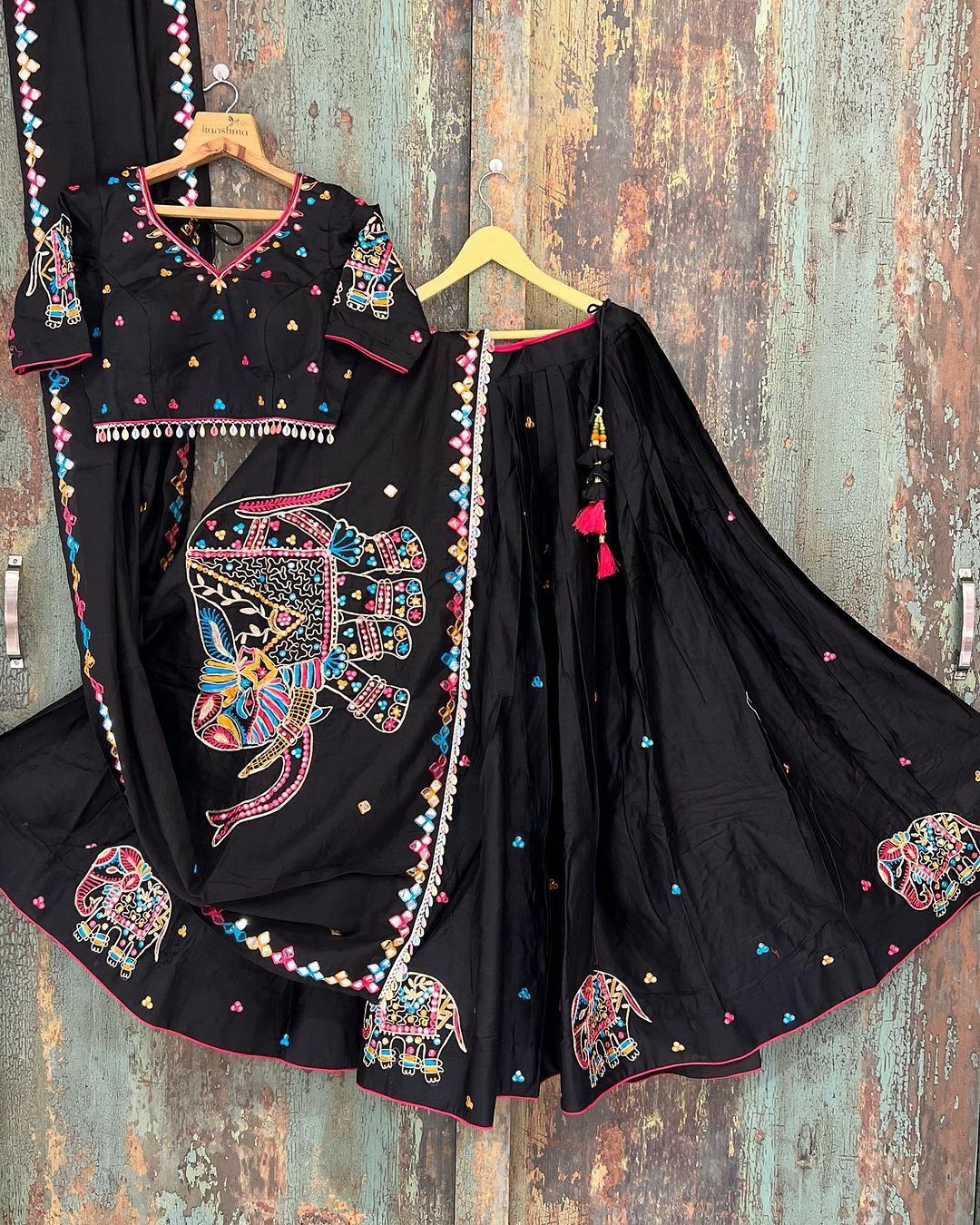 - Fabric Detail: Lehenga : Cotton With Paper Mirror Embroidery Work, Length : 42 Apx, Flare : 3 Mtr, Inner : Micro , Blouse : Cotton Embroidery With Paper Mirror And Kodi Lace Work Front Back And Sleeves Work, Cut : 1 Mtr Unstitched , Dupatta : Georgette With Embroidery Paper Mirror And Kodi Lace Work, Cut : 2.2 Mtr ,