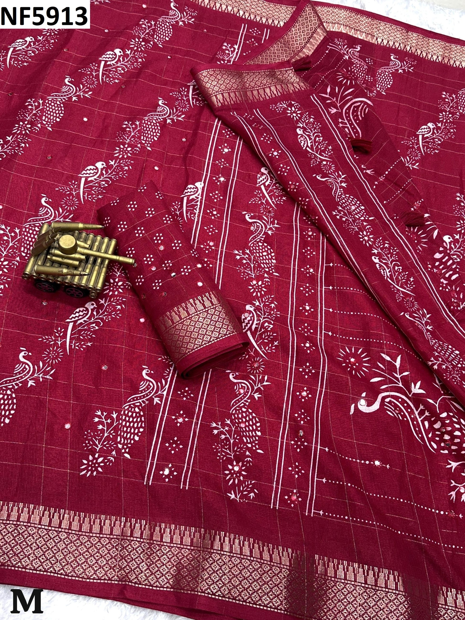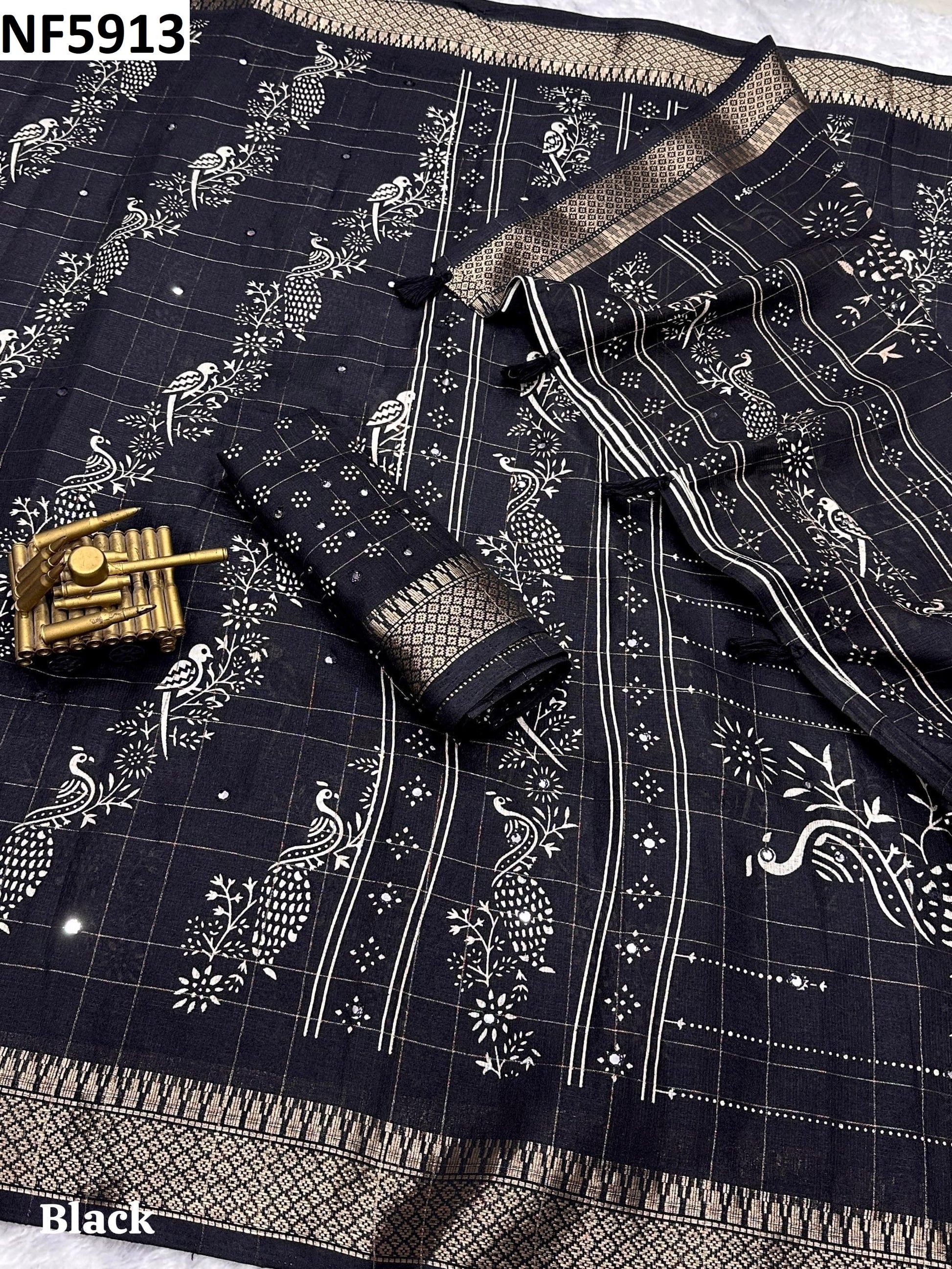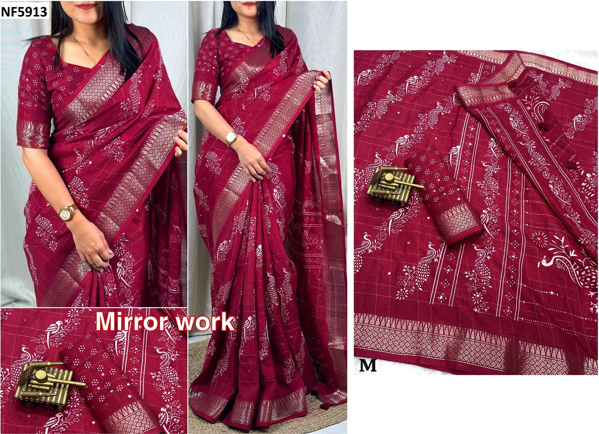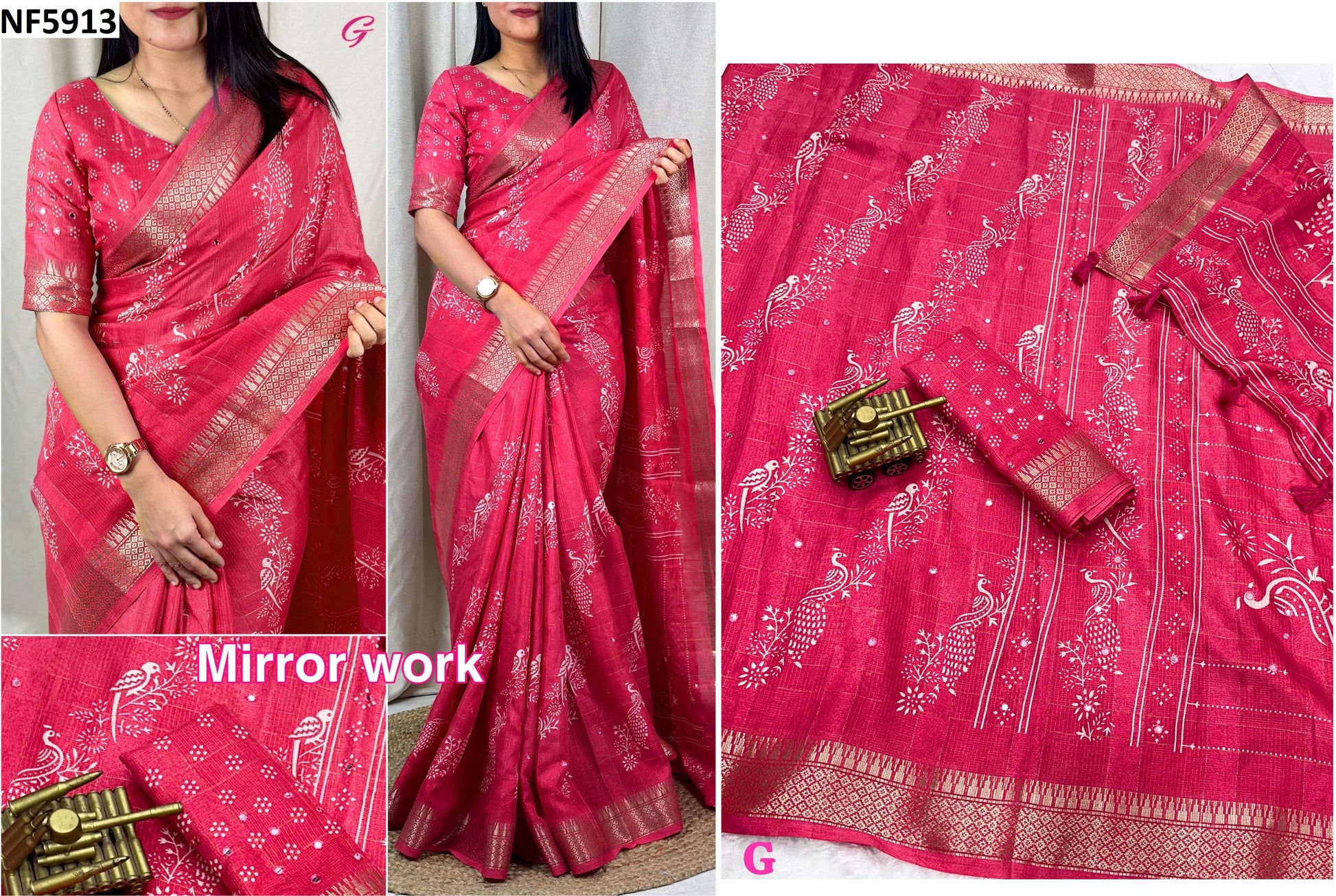 - Fabric Detail: Saree : Muslin Cotton Kalamkari Printed With Zari Weaving Paper Mirror Work And Tassels, Full Length : 6.30 Mtr , Blouse : Running, ,