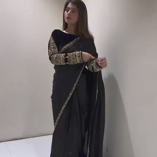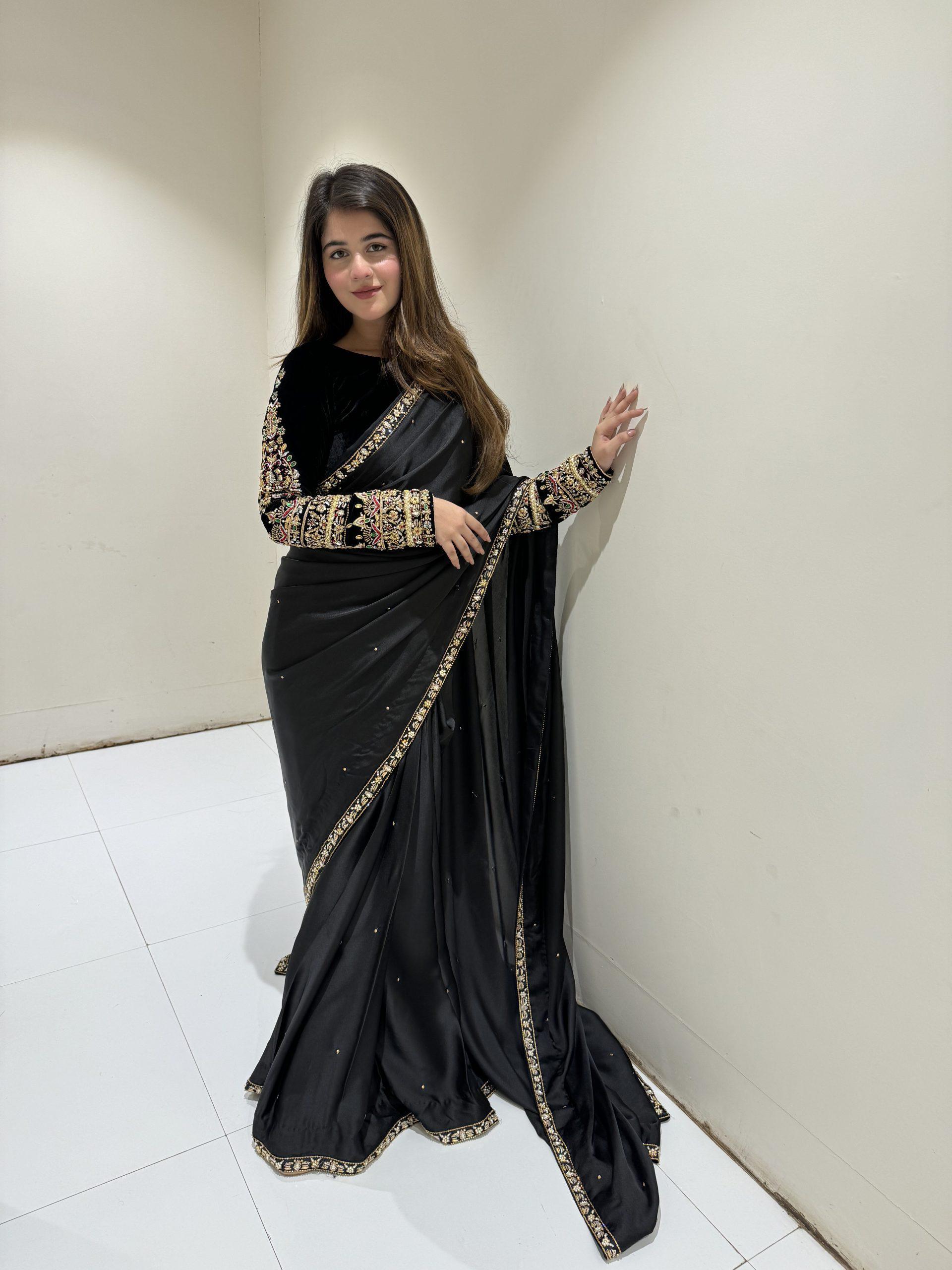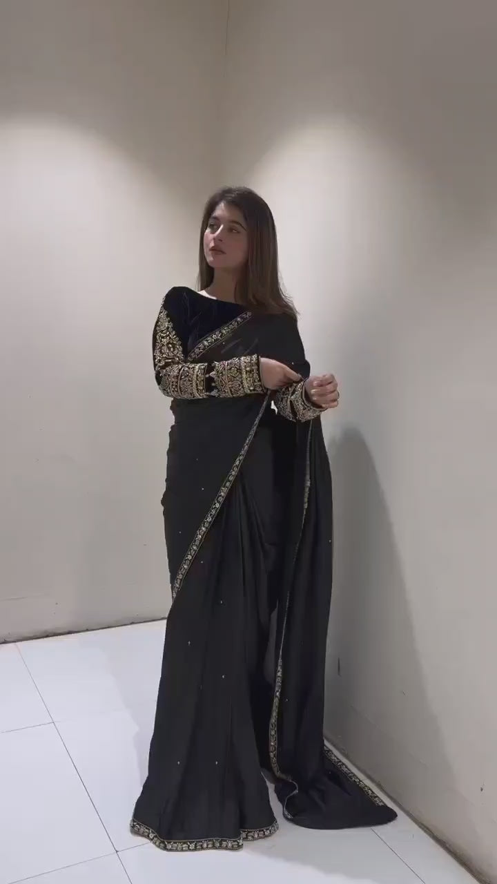 - Fabric Detail: Saree : Fancy Rangoli Cording Lace And Moti Work, Cut : 5.5 Mtr , Blouse : Velvet Cording Embroidery With Moti Work Sleeve, Cut : 1.20 Mtr Unstitched , ,