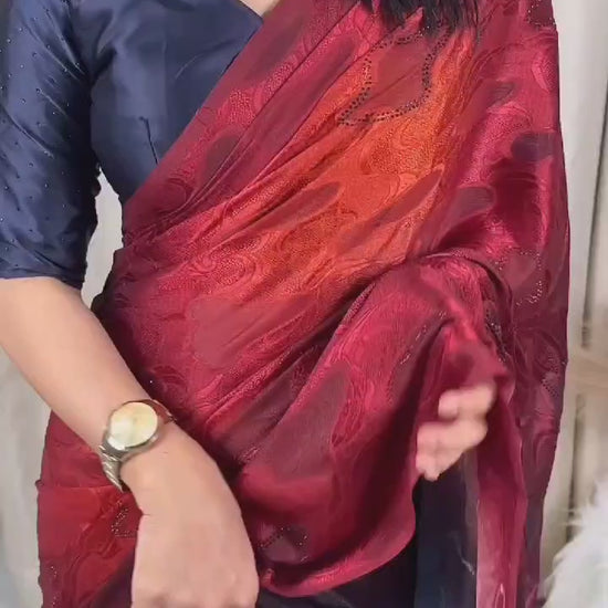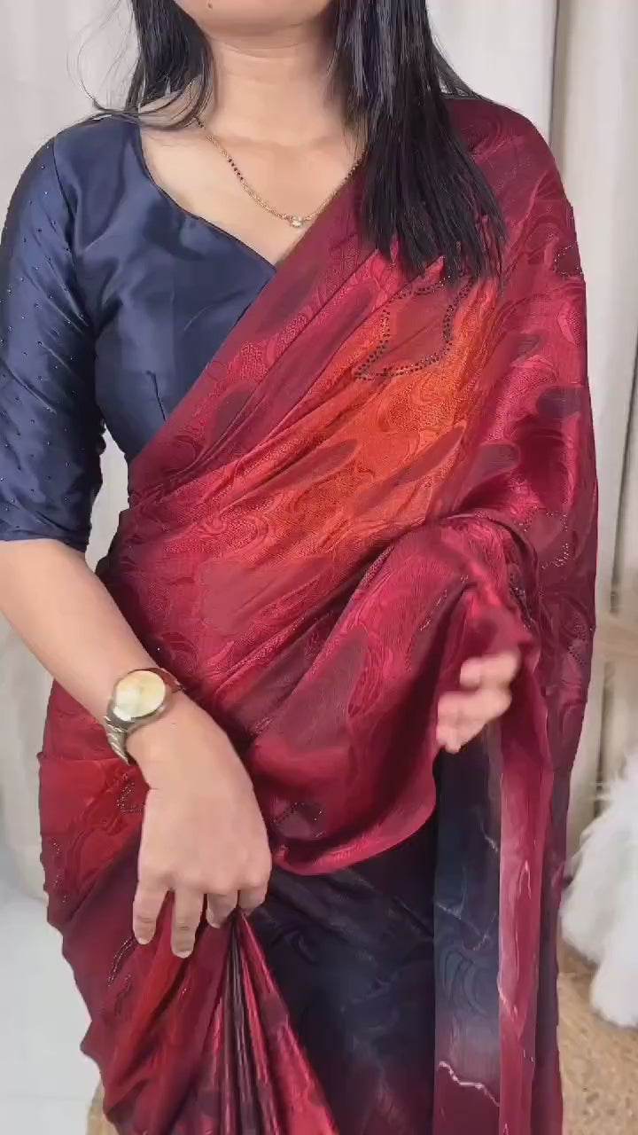 - Fabric Detail: Saree : Georgette Brasso Spray Print Effect With Two Colors Of Swarovski Work, Cut : 5.5 Mtr , Blouse : Pure Japan Satin Swarovski Work, Cut : 1 Mtr Unstitched , ,