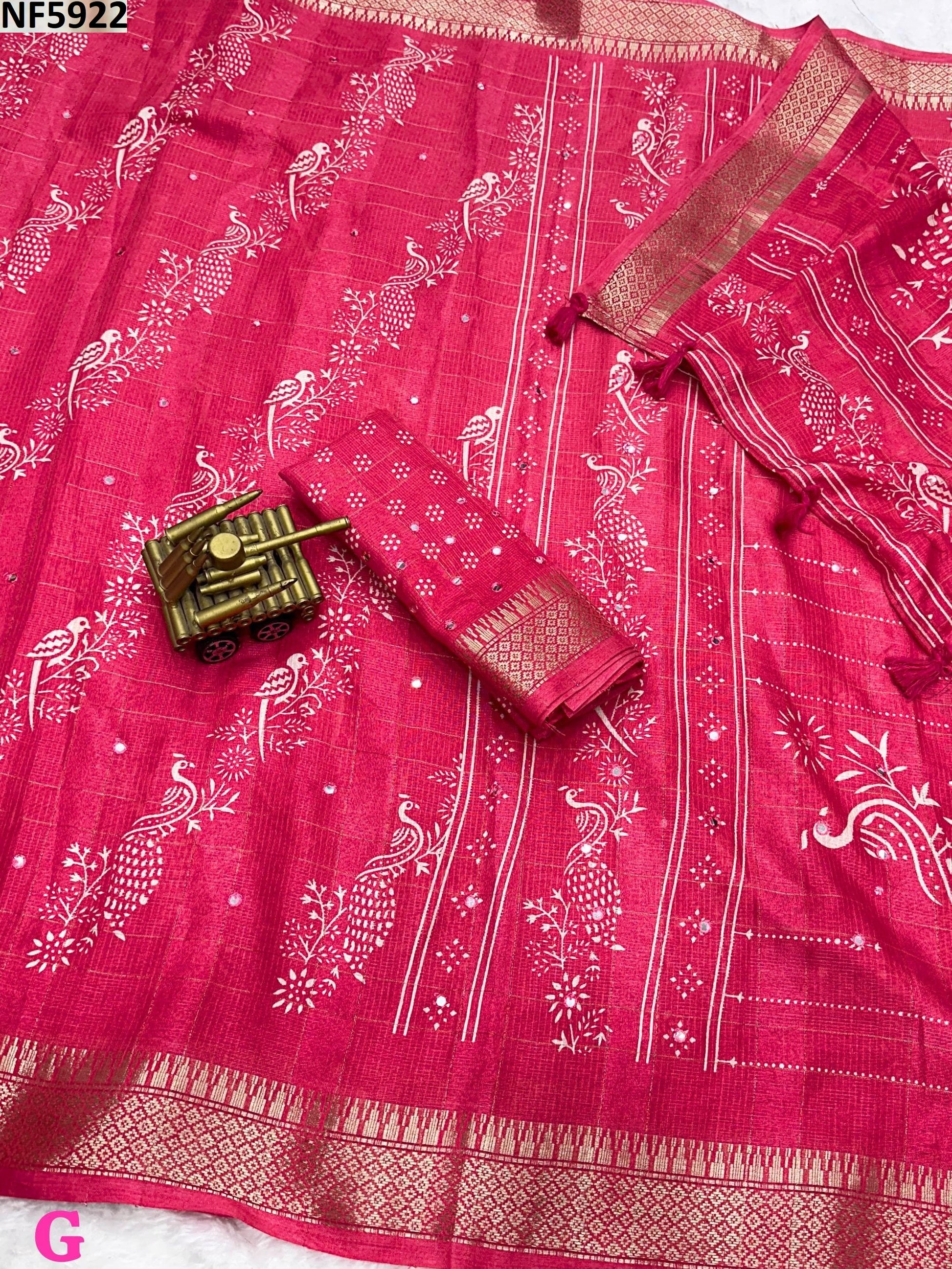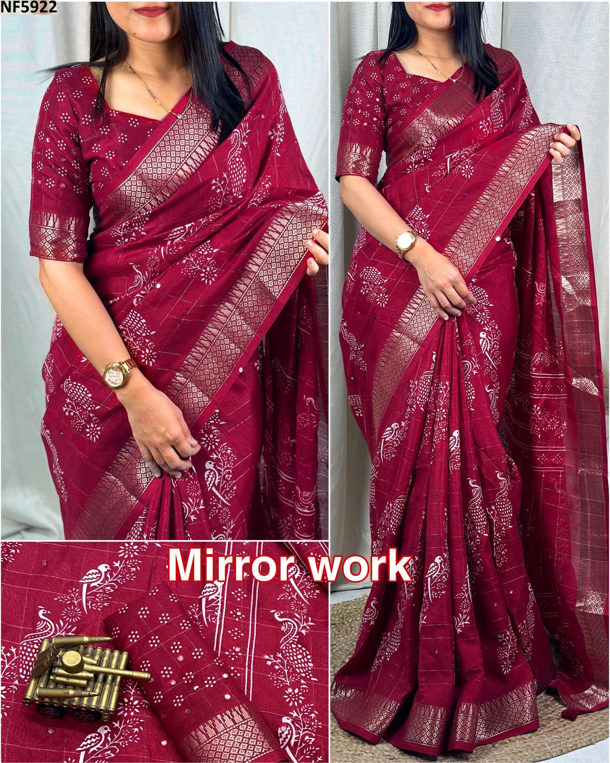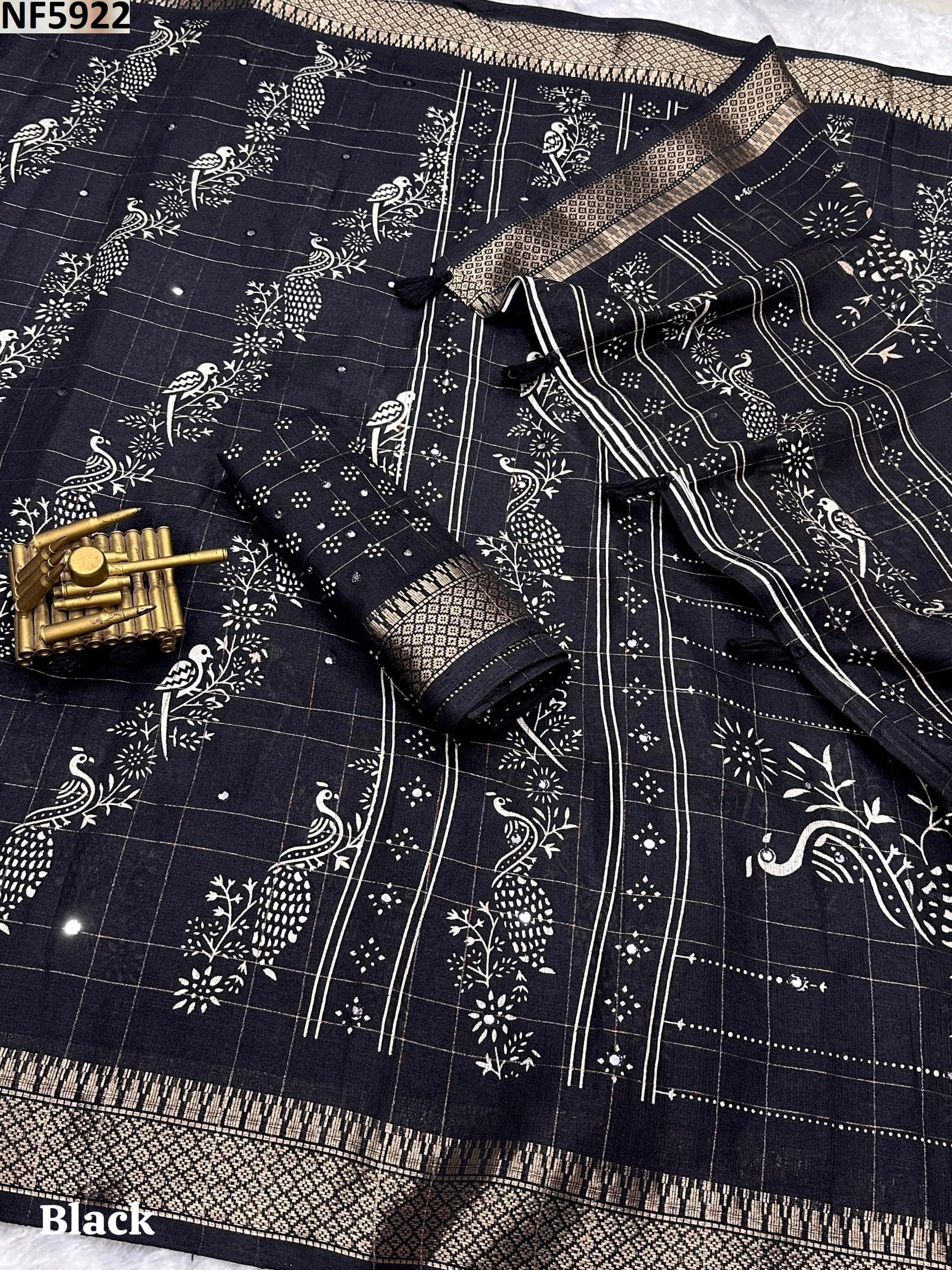 - Fabric Detail: Saree : Muslin Soft Cotton Printed With Zari Border And Tassels Pallu, Full Length : 6.3 Mtr , Blouse : Running , ,