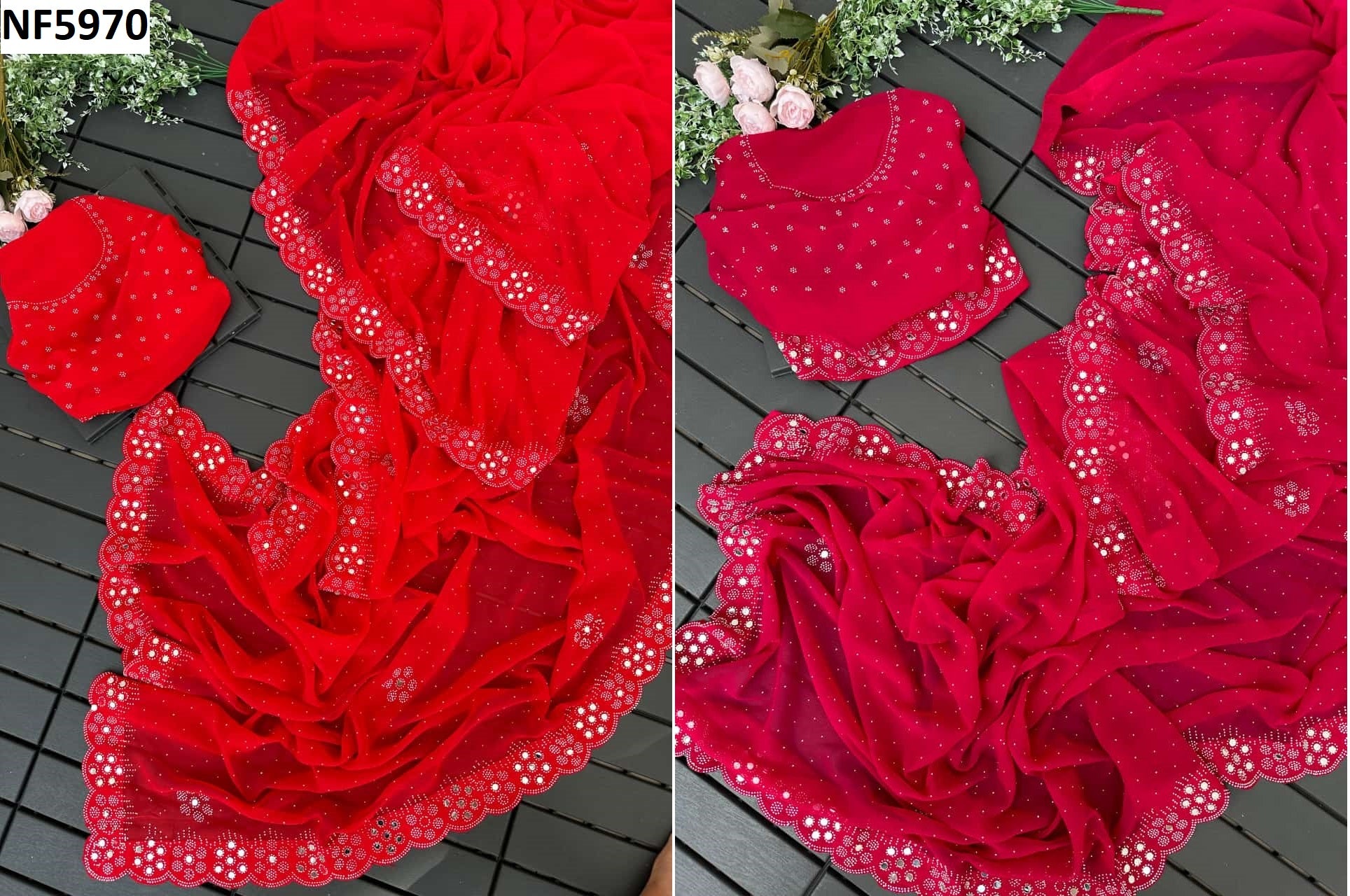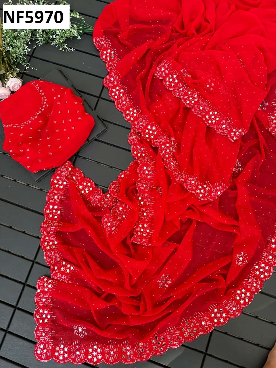 - Fabric Detail: Saree : Georgette With Heavy Swarovski Diamond Work And Mirror Work, Blouse : Georgette With Mirror Work And Swarovski Diamond Work, ,