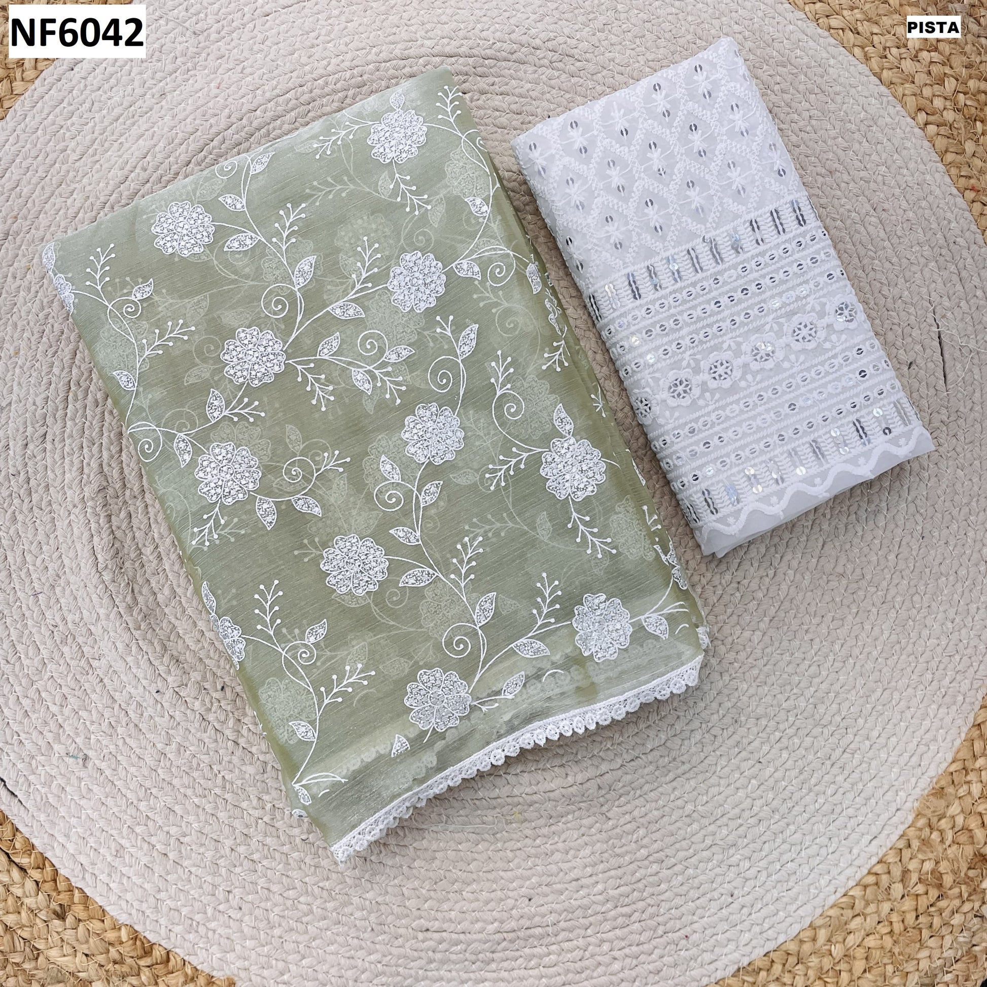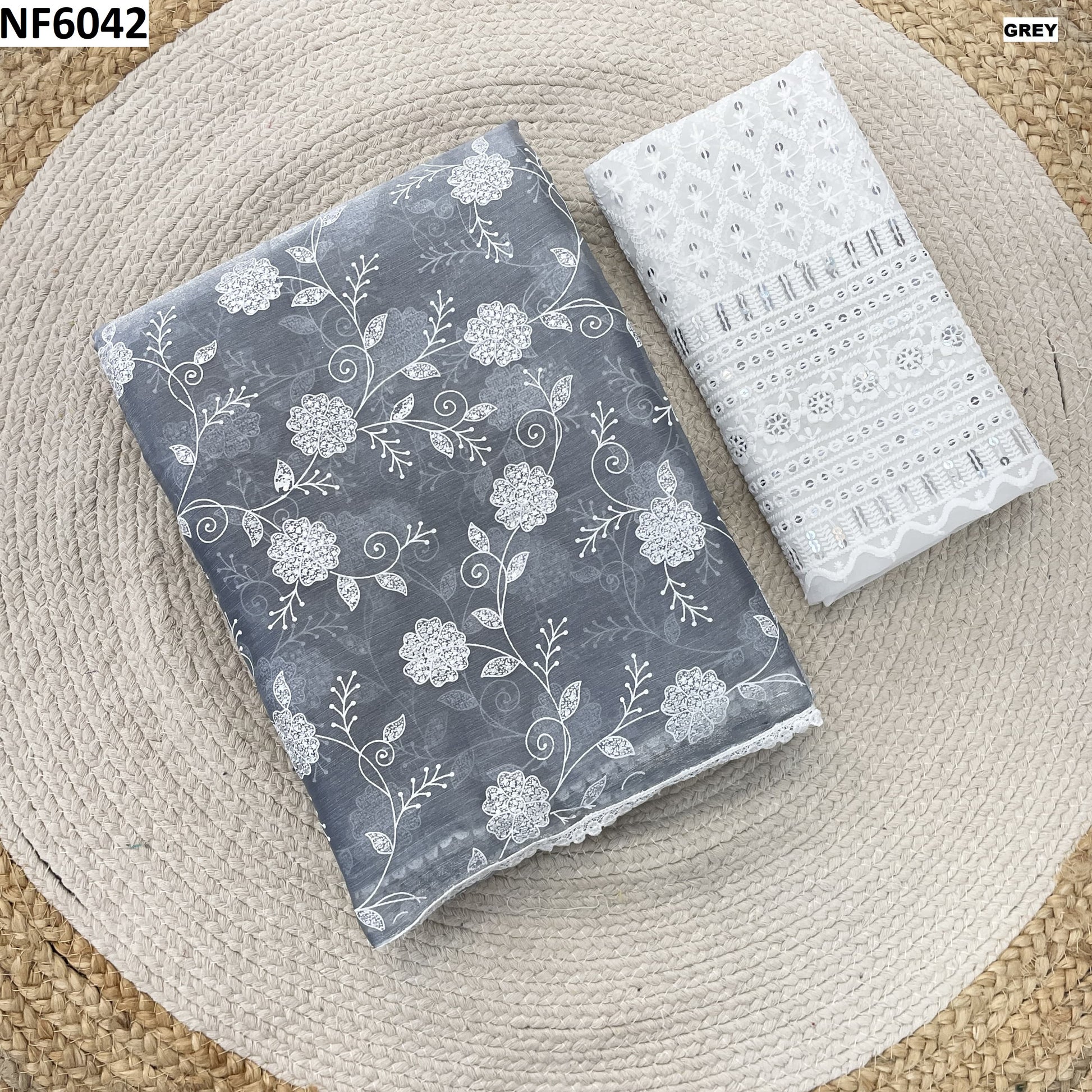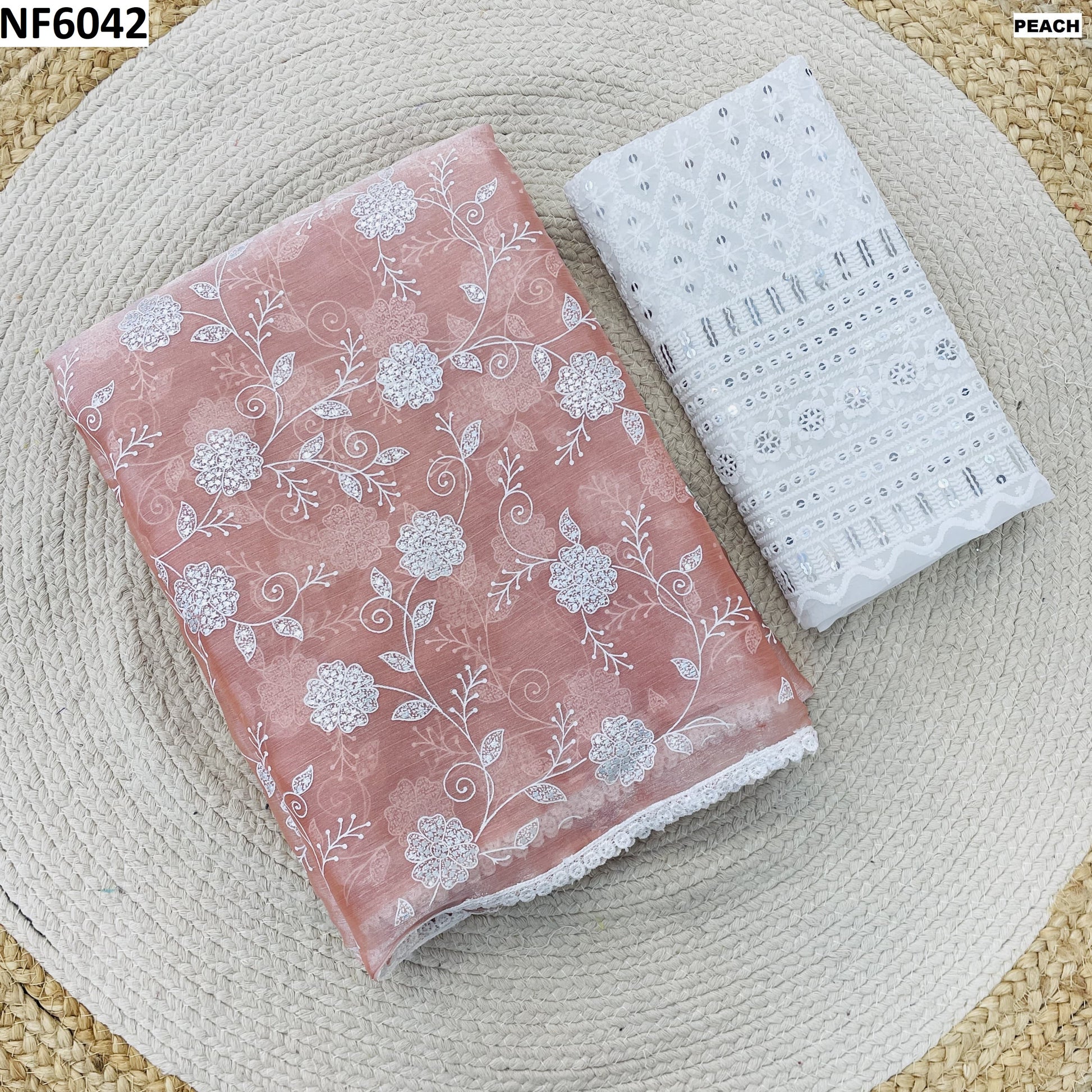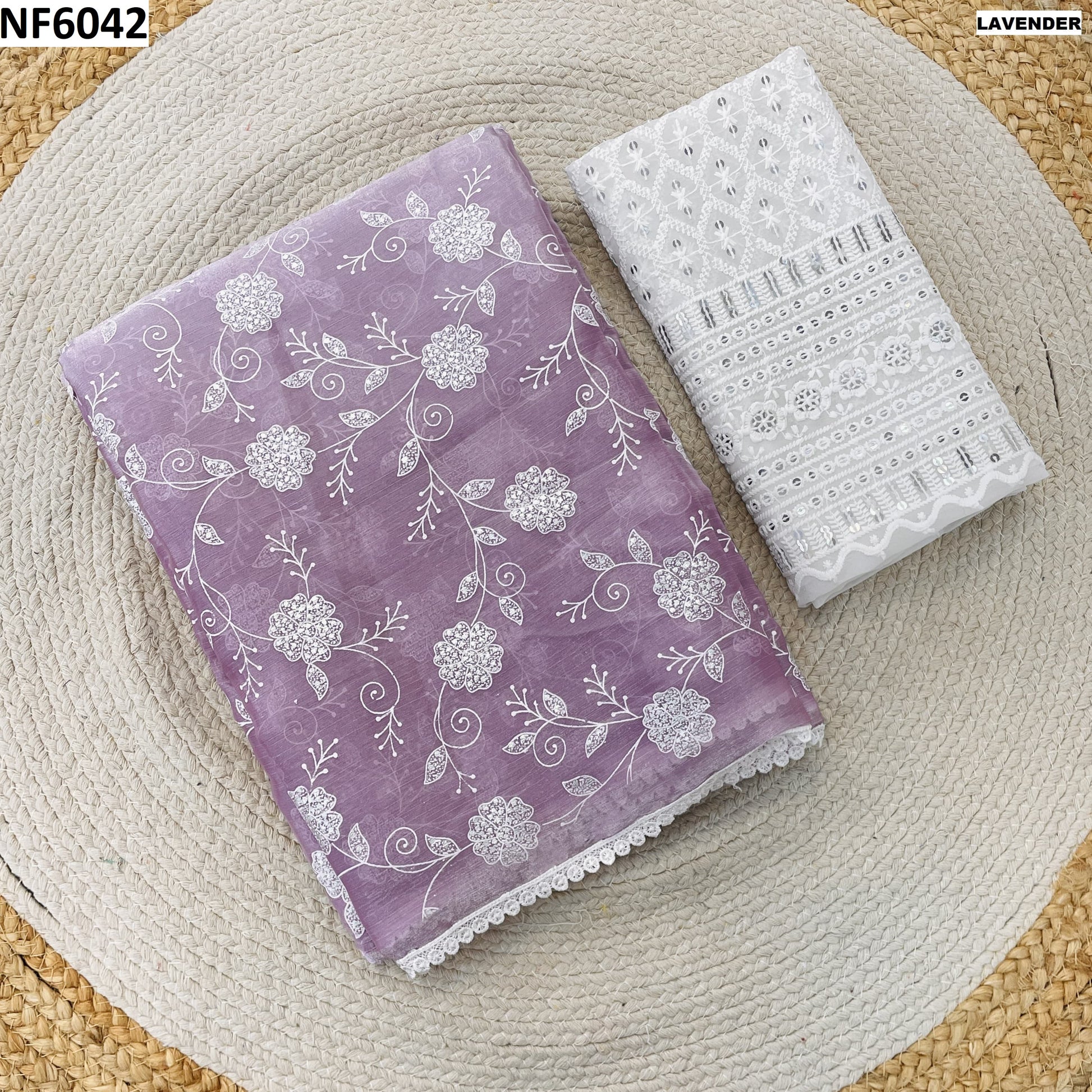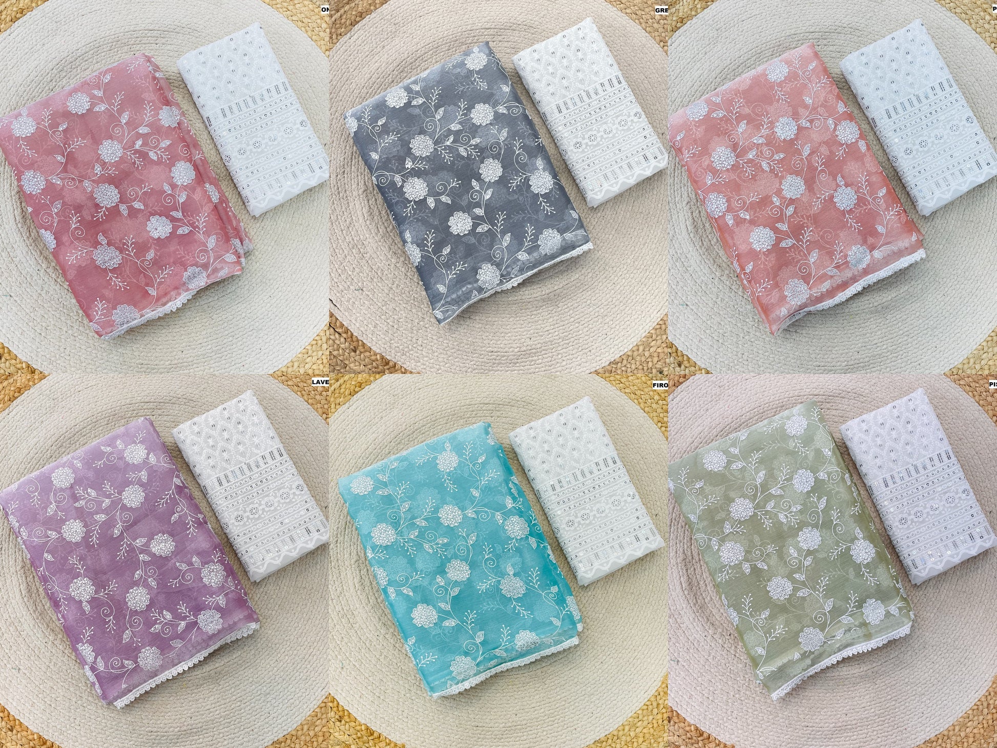 - Fabric Detail: Saree : Heavy Quality Jimmy Cho With Heavy Foil And Pulpy Print Beautiful Gpo Lace Border, Blouse : 60 Gram With Heavy Embroidery Sequence Chikankari Work , ,