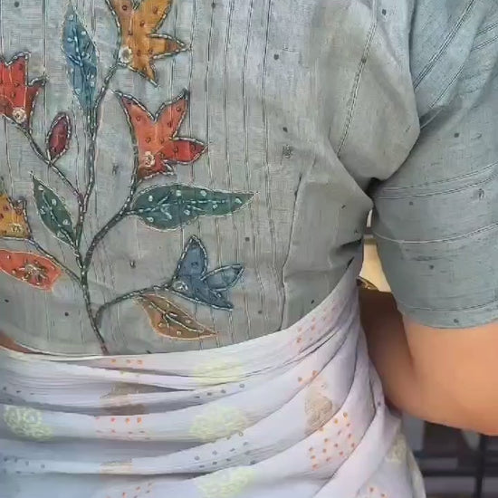 - Fabric Detail: Saree : Chinnon Silk 3D Printed With A Touch Of Ivory Work And Tussels In Pallu, Cut : 5.5 Mtr , Blouse : Air Silk Printed With Multi Color Bids Handwork, Cut : 1 Mtr Unstitched , ,