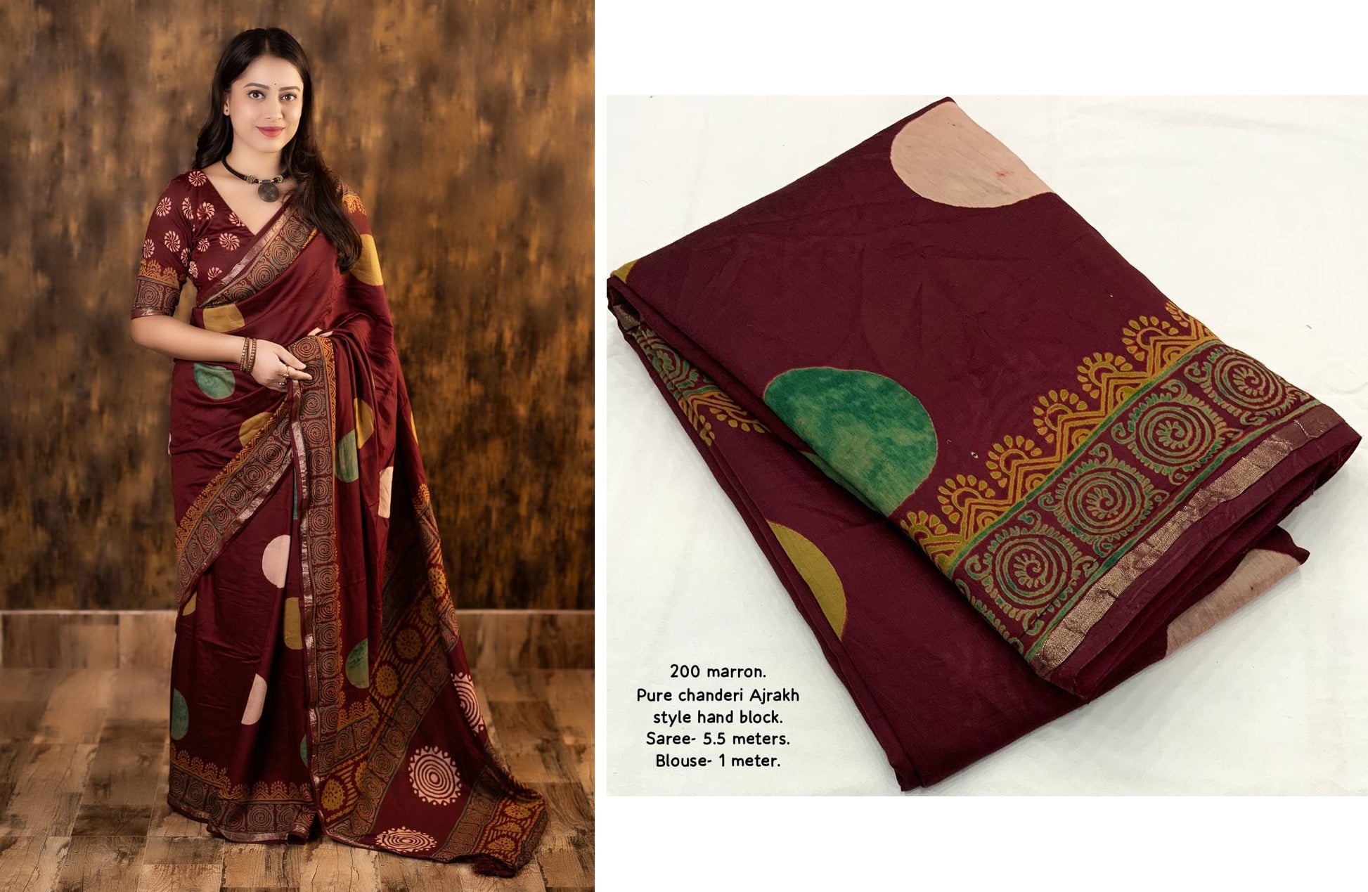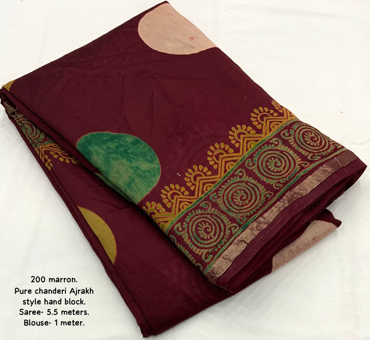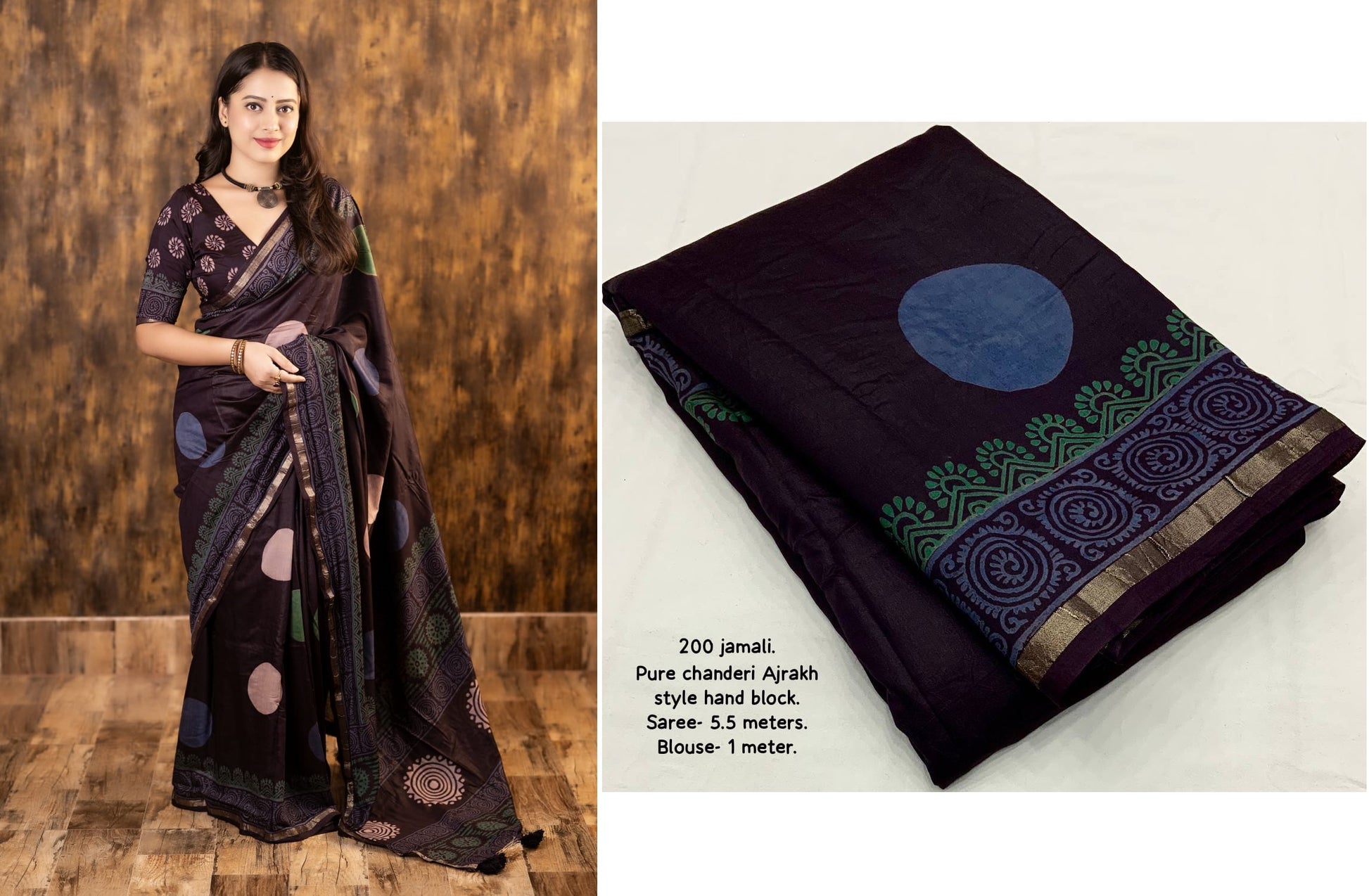 - Fabric Detail: Saree : Pure Chanderi Cotton With Ajrakh Style Hand Block Prints Cotton Tassels Pallu, Cut : 5.5 Mtr , Blouse : Pure Chanderi Block Printed, Cut : 1 Mtr Untitched , ,