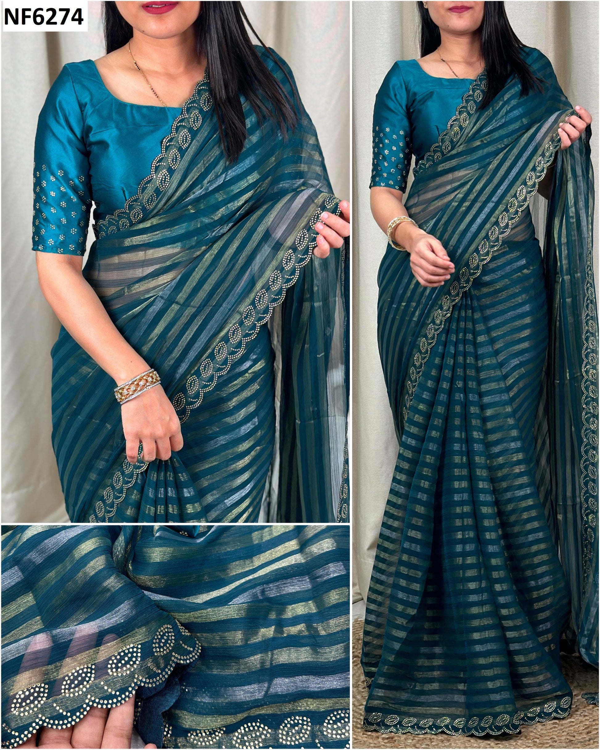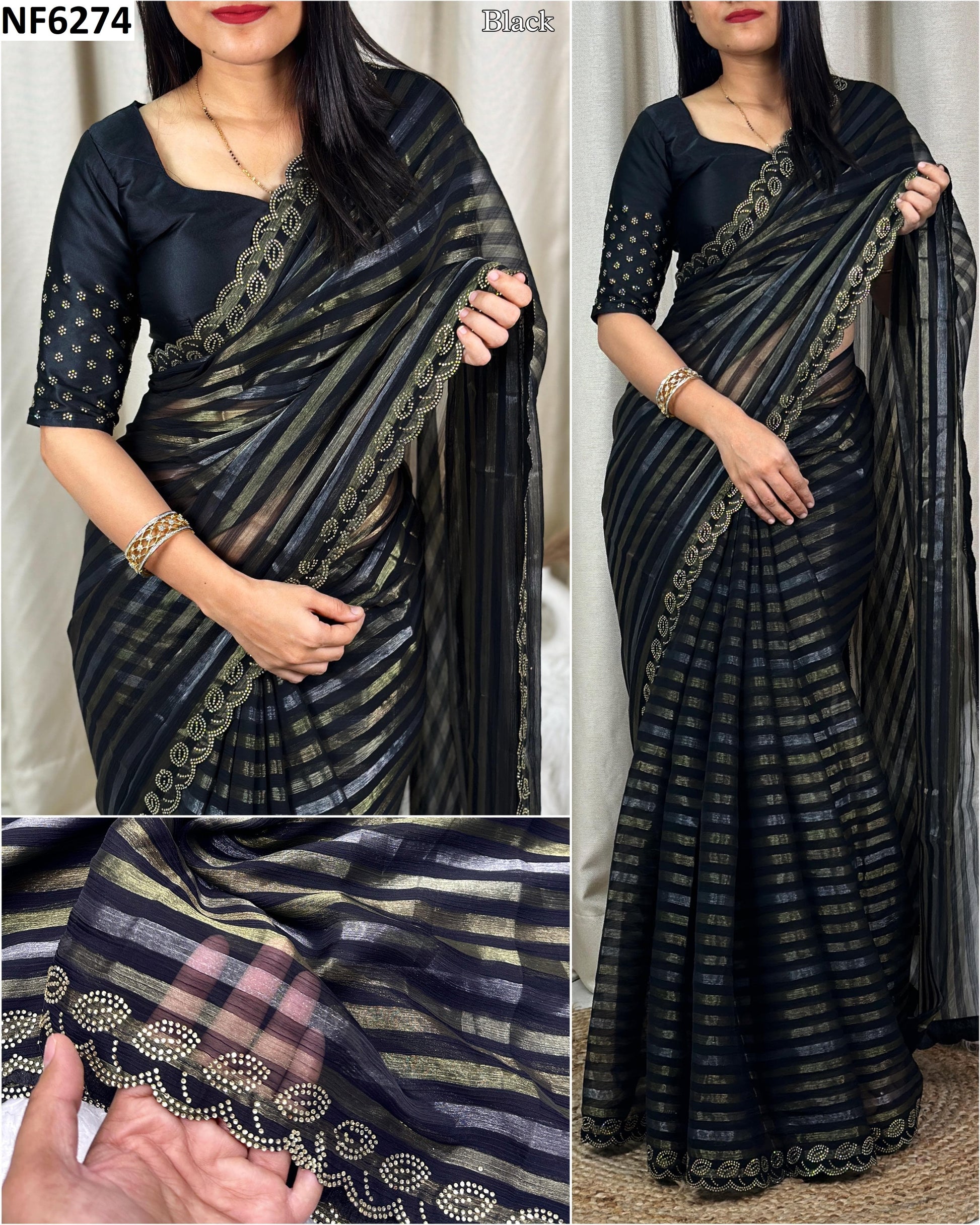 - Fabric Detail: Saree : Chiffon Gold And Silver Zari Weaving Strips In Full Swarovski Diamond Work Border, Cut : 5.5 Mtr , Blouse : Japan Satin Solid Colur Swarovski Work In Sleeves, Cut : 1 Mtr Unstitched , ,