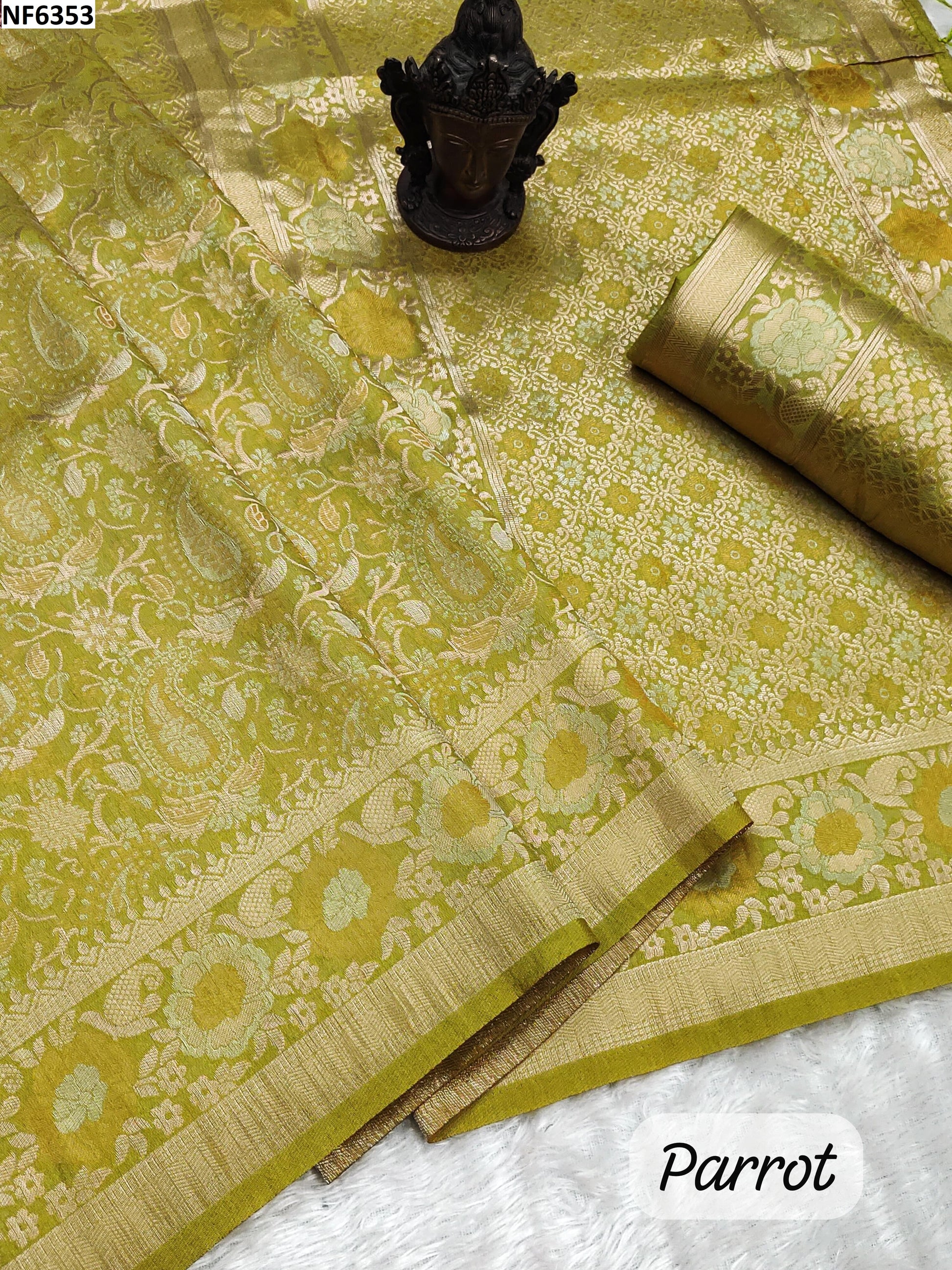- Fabric Detail: Saree : Soft Kanjivaram Silk Beautiful Rich Pallu Jacquard Work On All Over, Cut : 6.3 Mtr , Blouse : Woven With Exclusive Jacquard Border , ,