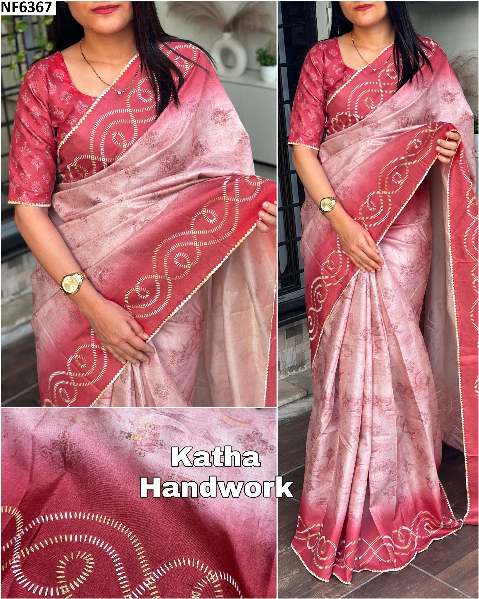 - Fabric Detail: Saree : Tusser Cotton Designer Hand Katha Work With Digital Print, Cut : 5.5 Mtr , Blouse : Tusser Cotton, Cut : 1 Mtr Unstitched , ,