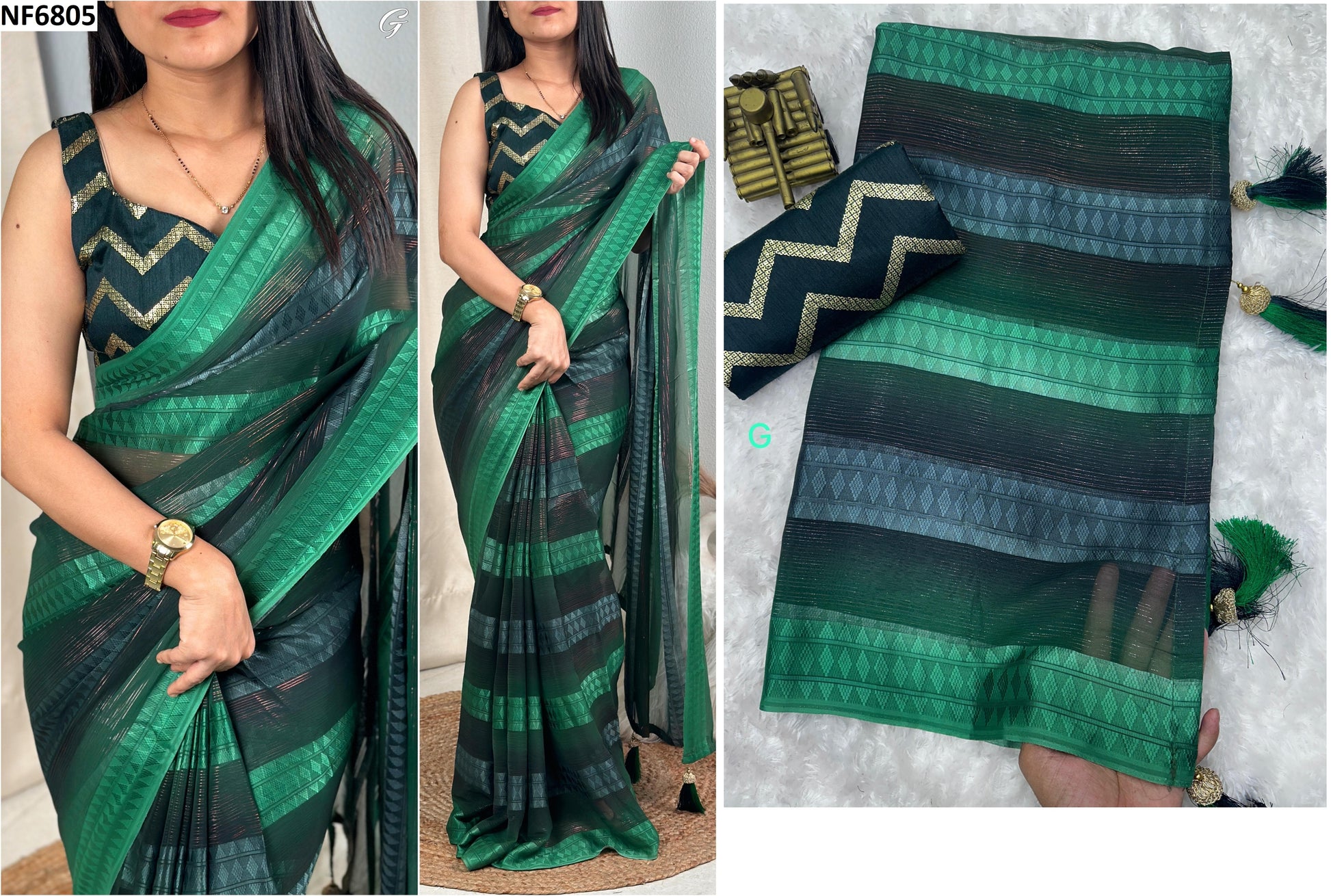 - Fabric Detail: Saree : Georgette Self Jacquard With Contrast Colour Combination Tassles In Pallu, Cut : 5.50 Mtr , Blouse : Sequin, Cut : 1 Mtr Unstitched , ,