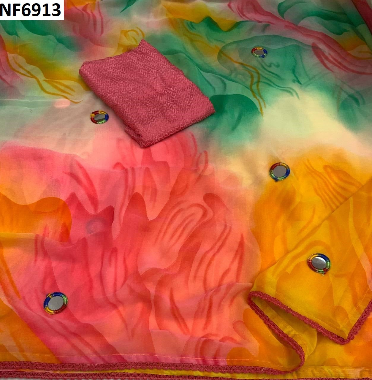 - Fabric Detail: Saree : Soft Georgette Multicolor Printed Tye Dye Border All Over Mirror With Threads Rings, Full Length : 6.30 Mtr , Blouse : Tye Dye Crepe , ,