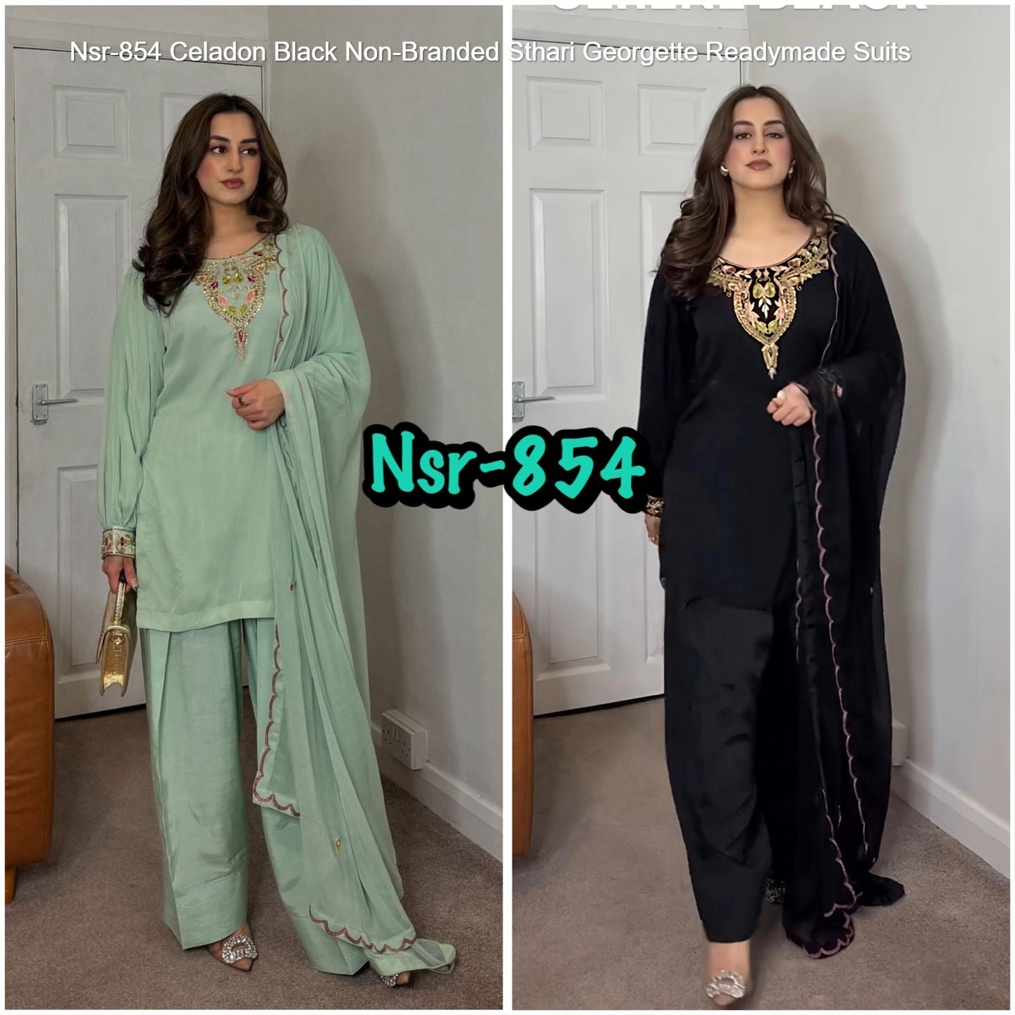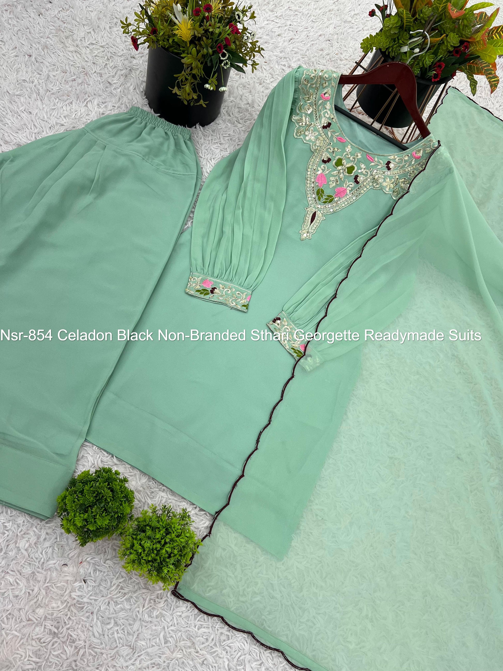 Nsr-854 Celadon Black Non-Branded Sthari Georgette Readymade Suits