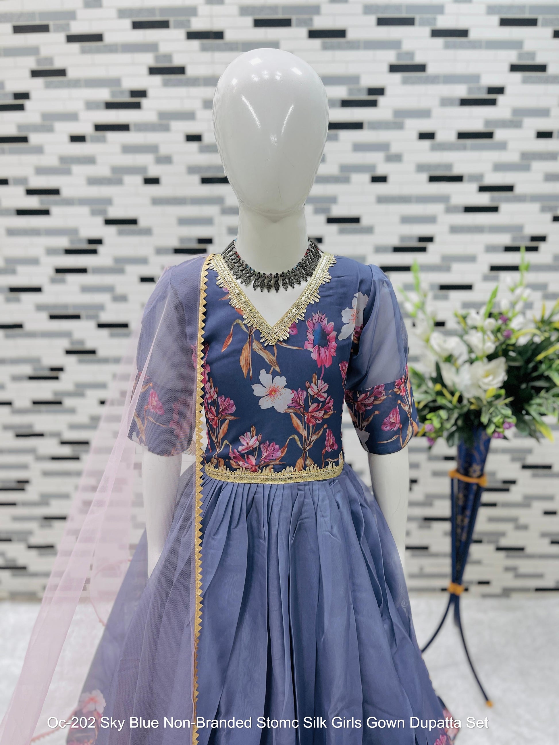 Oc-202 Sky Blue Non-Branded Stomc Silk Girls Gown Dupatta Set