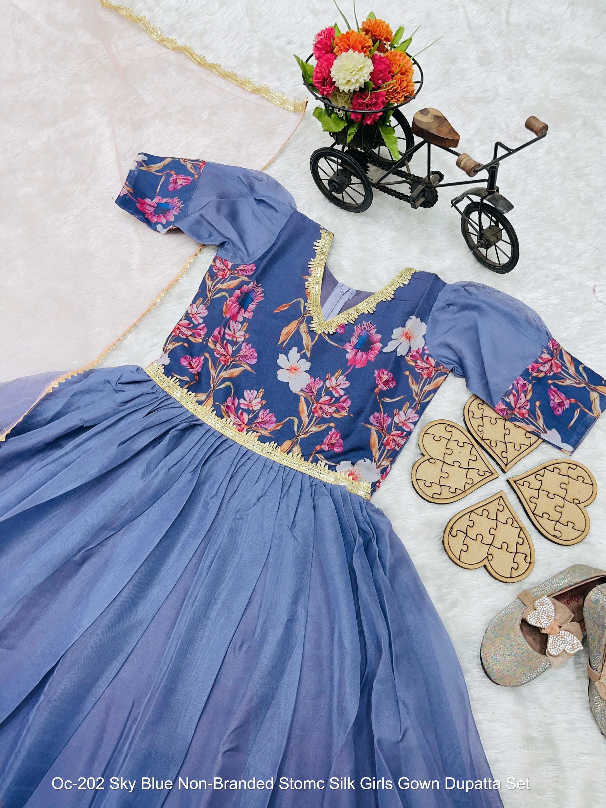 - Oc-202 Sky Blue Non-Branded Stomc Silk Girls Gown Dupatta Set Dealer Ahmedabad Surat Wholesale Gujarat India Lowest Price Best Quality Buy Purchase Shipping Kurta Salwaar Kameez Also free Cash on delivery