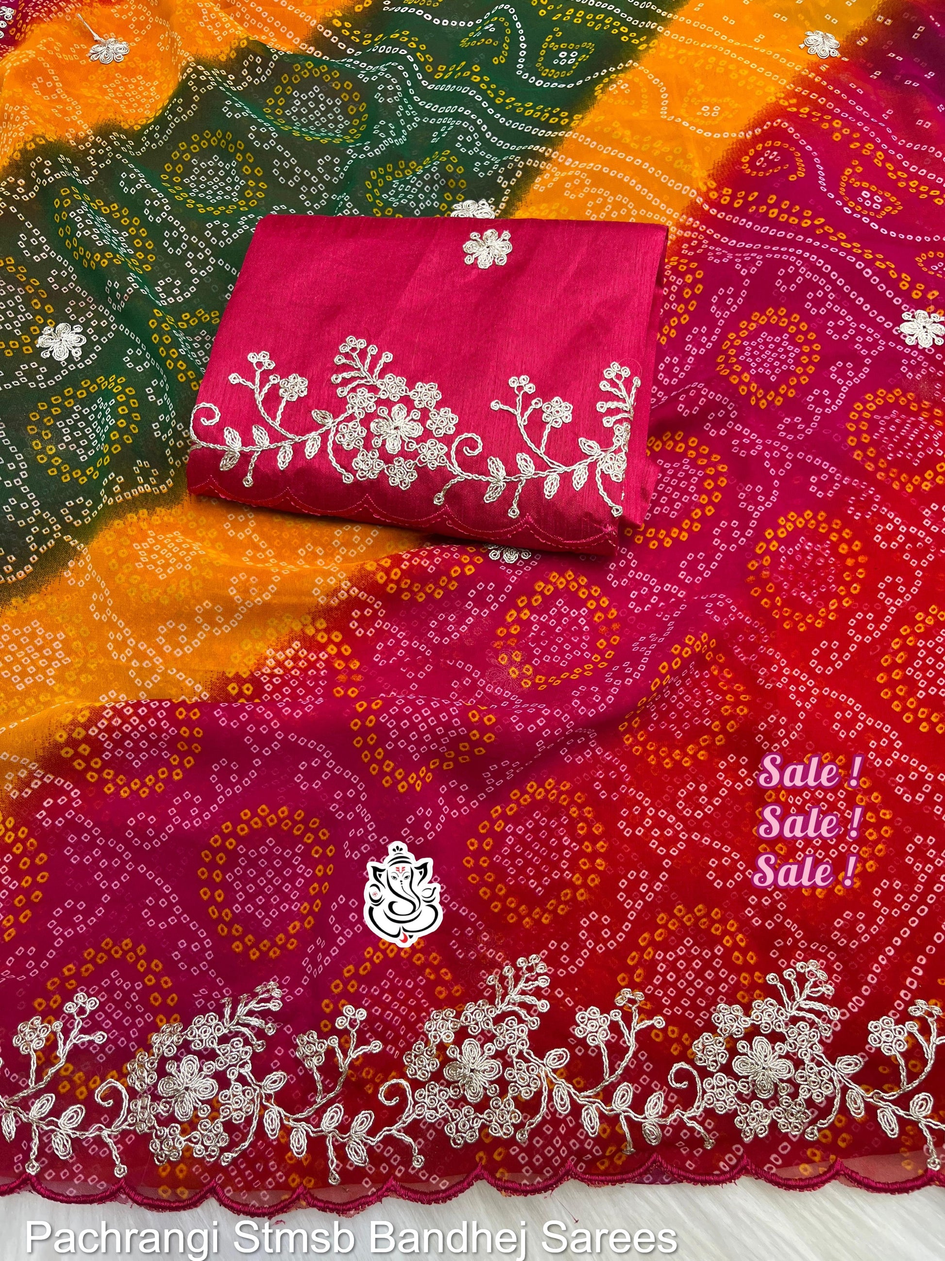 - Fabric Detail: Saree : Soft Cc Georgette Pachrangi Bandej With Beautiful C Pallu Pitta Work Whole Butti With Rich Look Cut Work Border, Blouse : Heavy Mono With Pitta Work Unstitched , ,