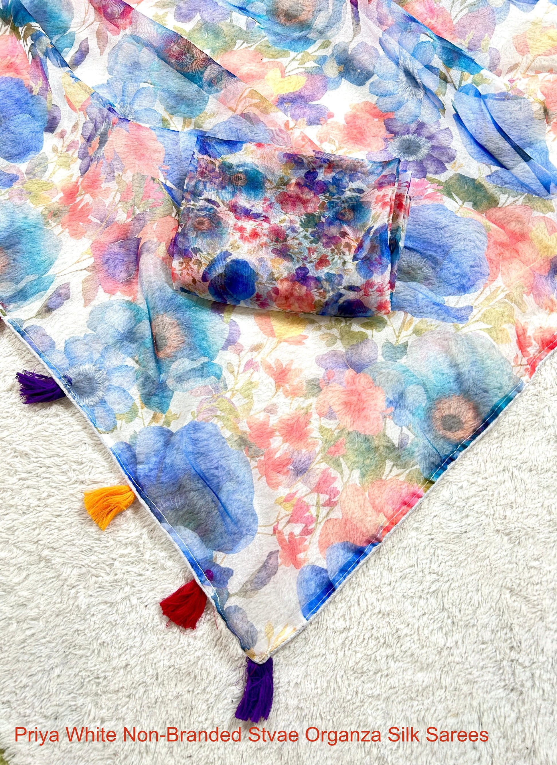 - Fabric Detail: Saree : Soft Pure Shiny Organza Silk With Fancy Floral Print Pallu With Multi Colour Fancy Style Thread Work Piping, Blouse : Heavy Tassels And Floral Print , ,