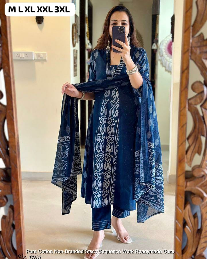 - Fabric Detail: Top : Pure Cotton Beautiful Heavy Anarkali Sequence Work, Length : 45 Apx, Bottom : Cotton, Length : 38 Apx, Dupatta : Mal Mal Cotton, Size : M, L, Xl, 2Xl, 3Xl