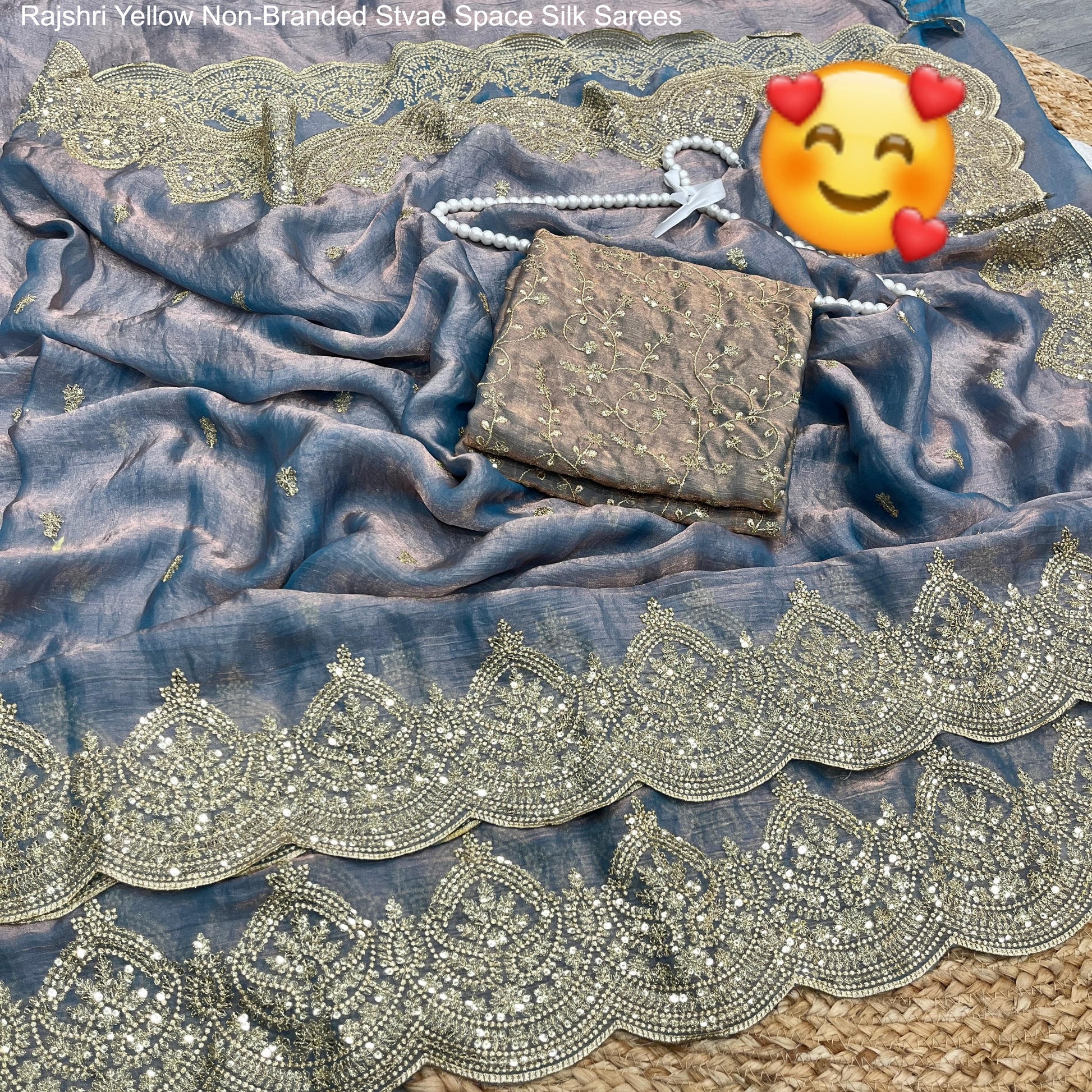 - Fabric Detail: Saree : Soft Space Silk Along With Designer Zari And Sequence Work Along And Cutwork Border , Blouse : Space Silk Along With Designer Heavy Worked , Colours : Periwinkle Blue, Teal, Mustard Yellow, Mauve ,