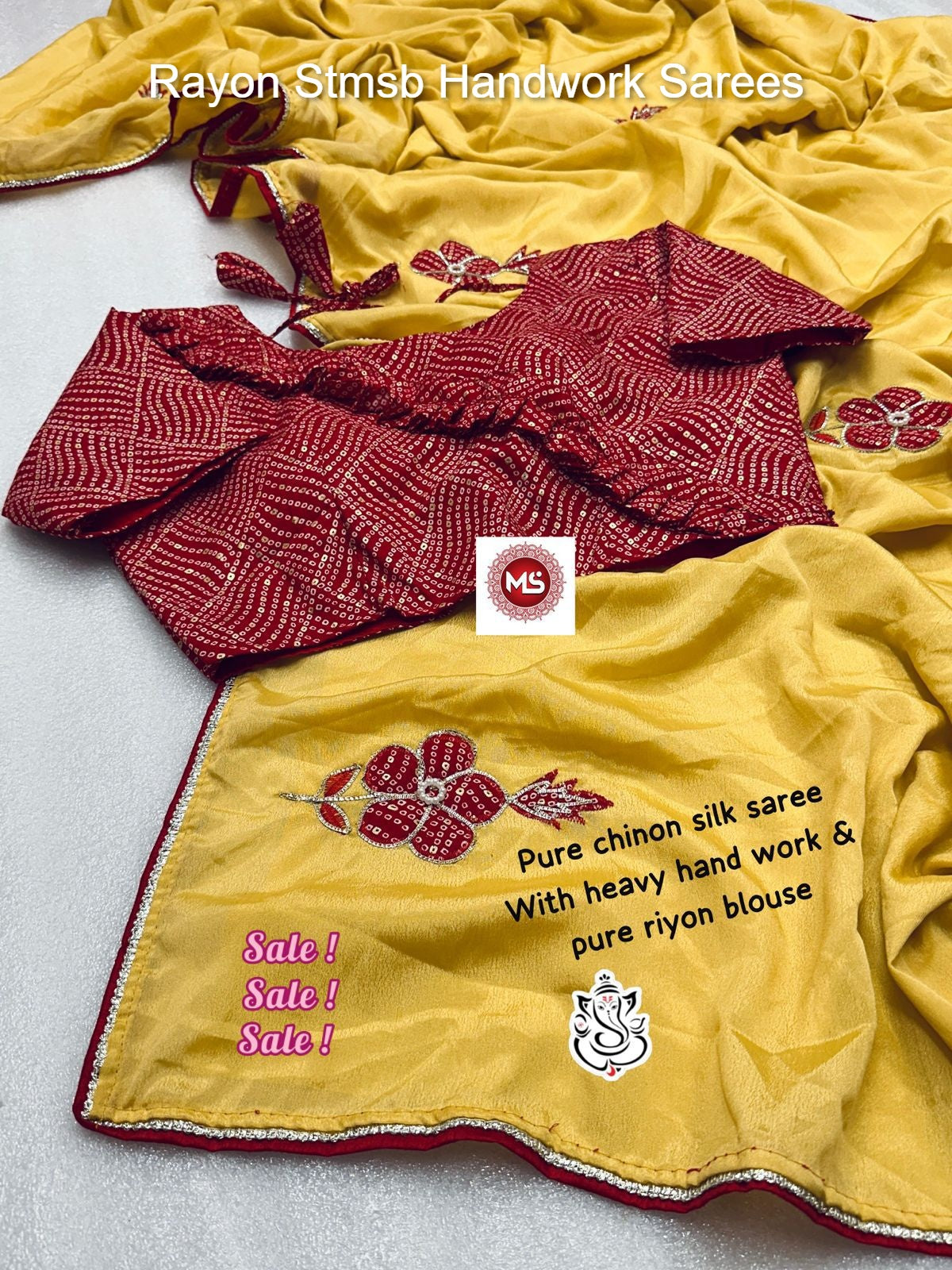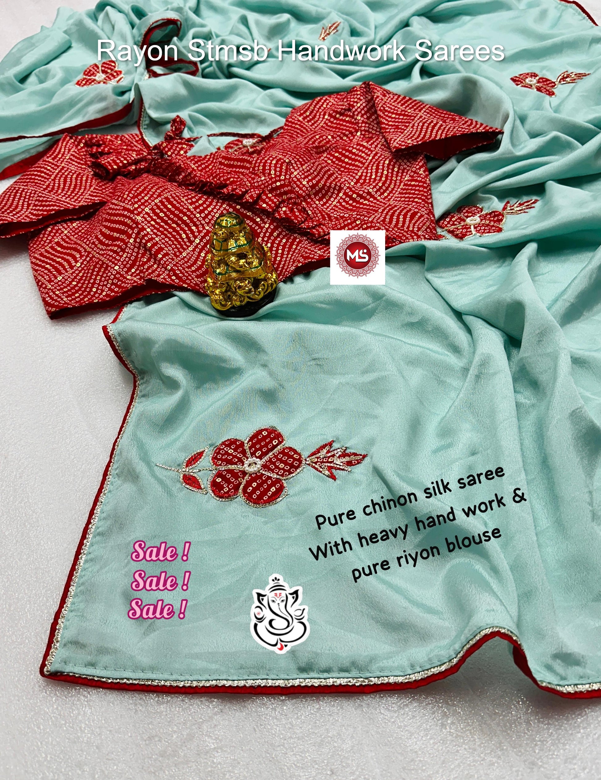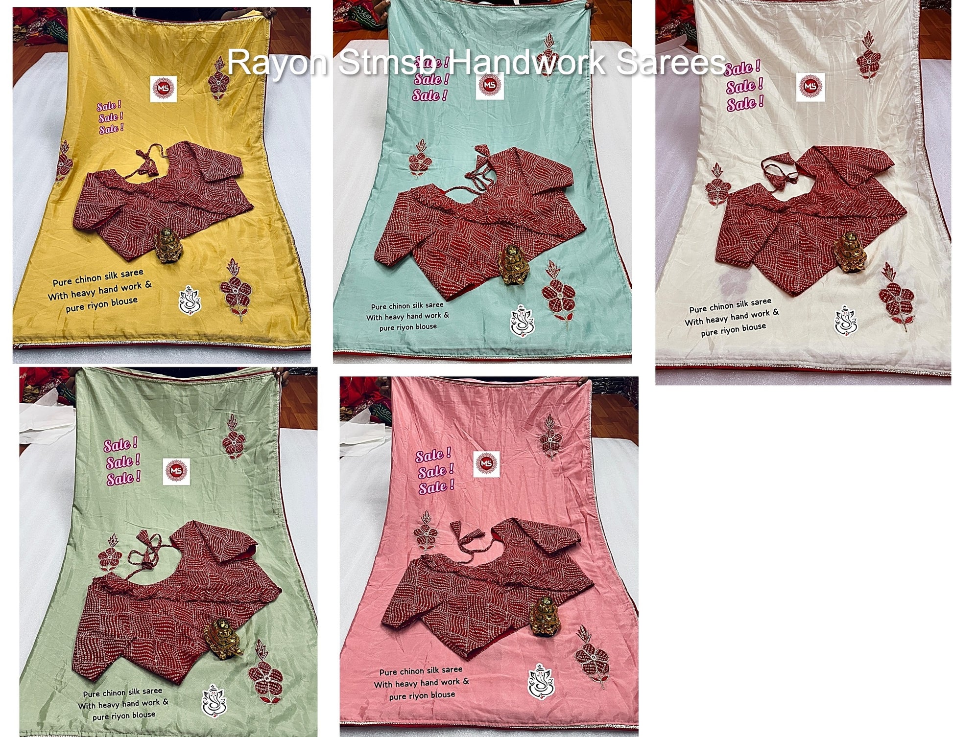 - Fabric Detail: Saree : Chinon Silk Base Heavy Embroidery Handwork Butta , Blouse : Pure Rayon Fully Stitched , , Size : 38+2 Margin