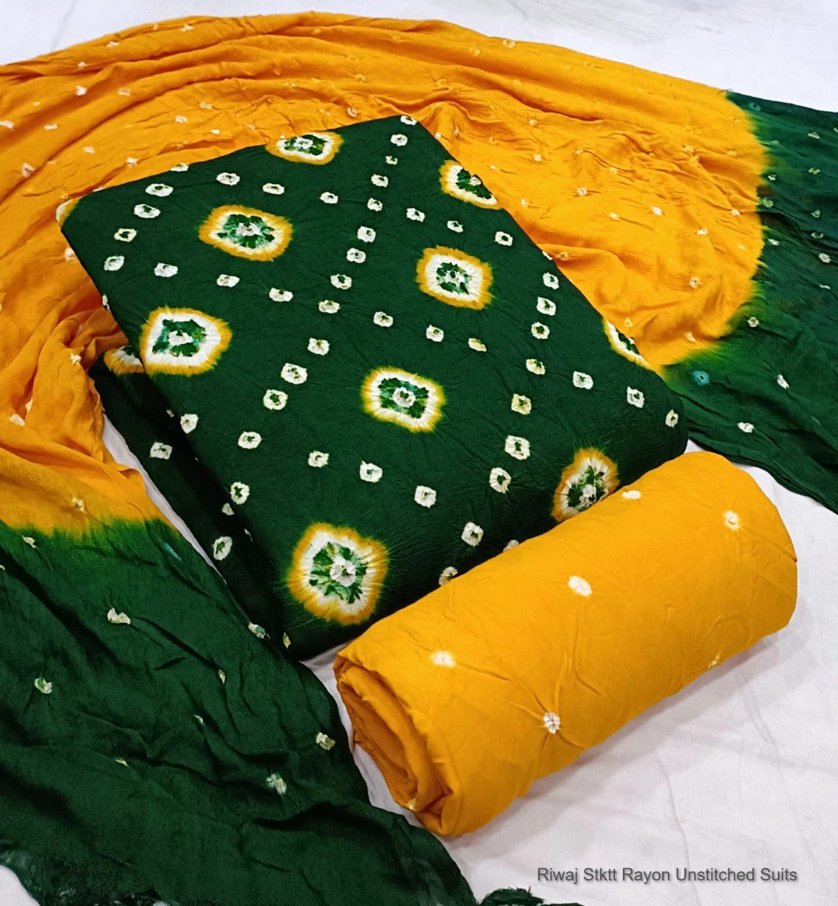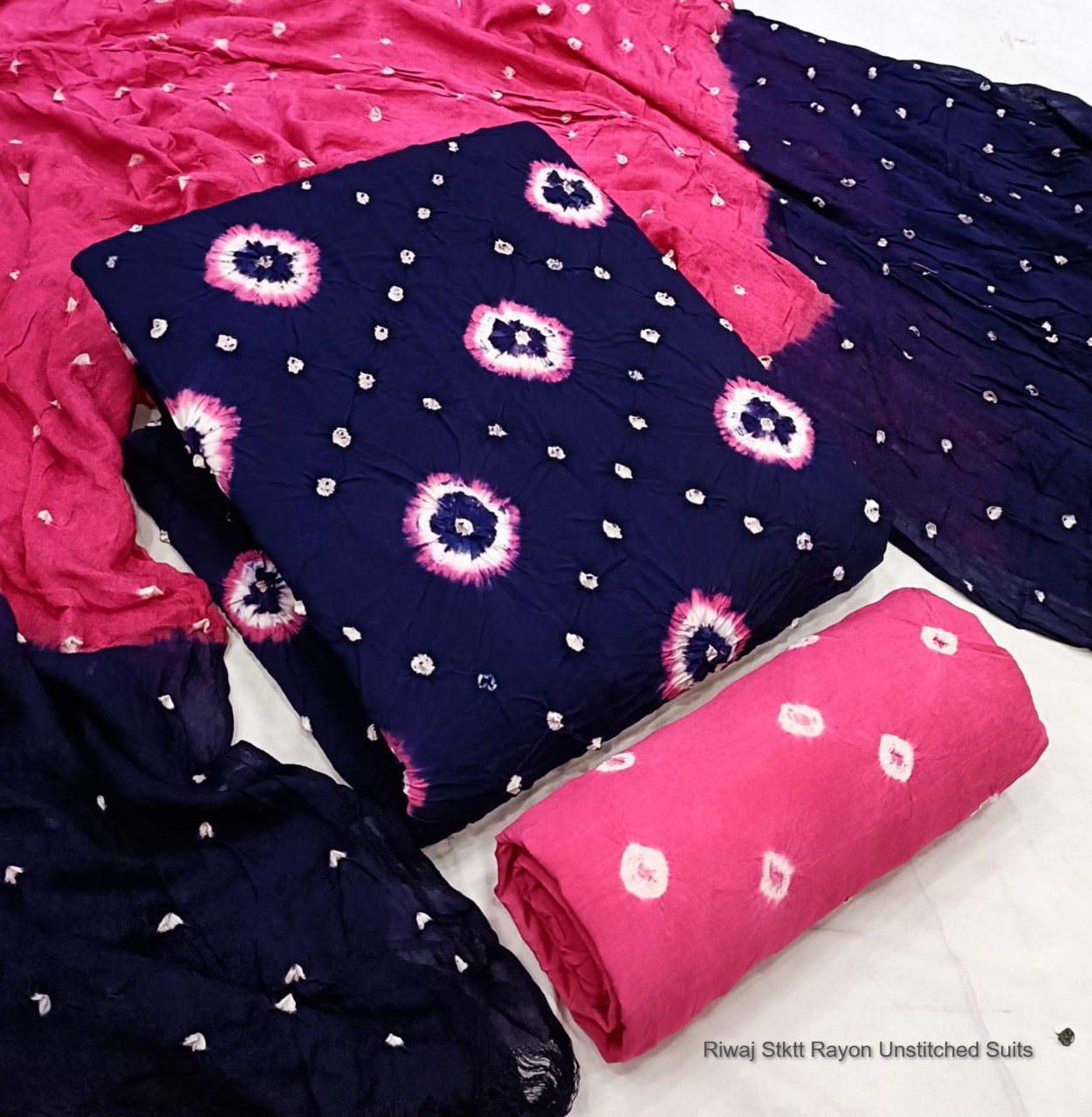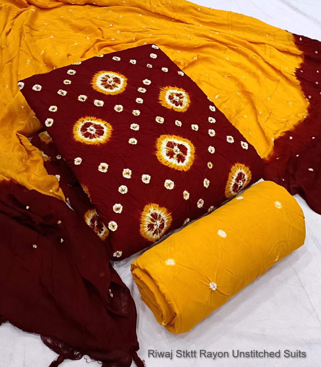 - Fabric Detail: Top : Original Potli Heavy Rayon Bandhani , Bottom : Rayon With Hand Bandhej Print , Dupatta : Rayon With Hand Bandhej Print ,