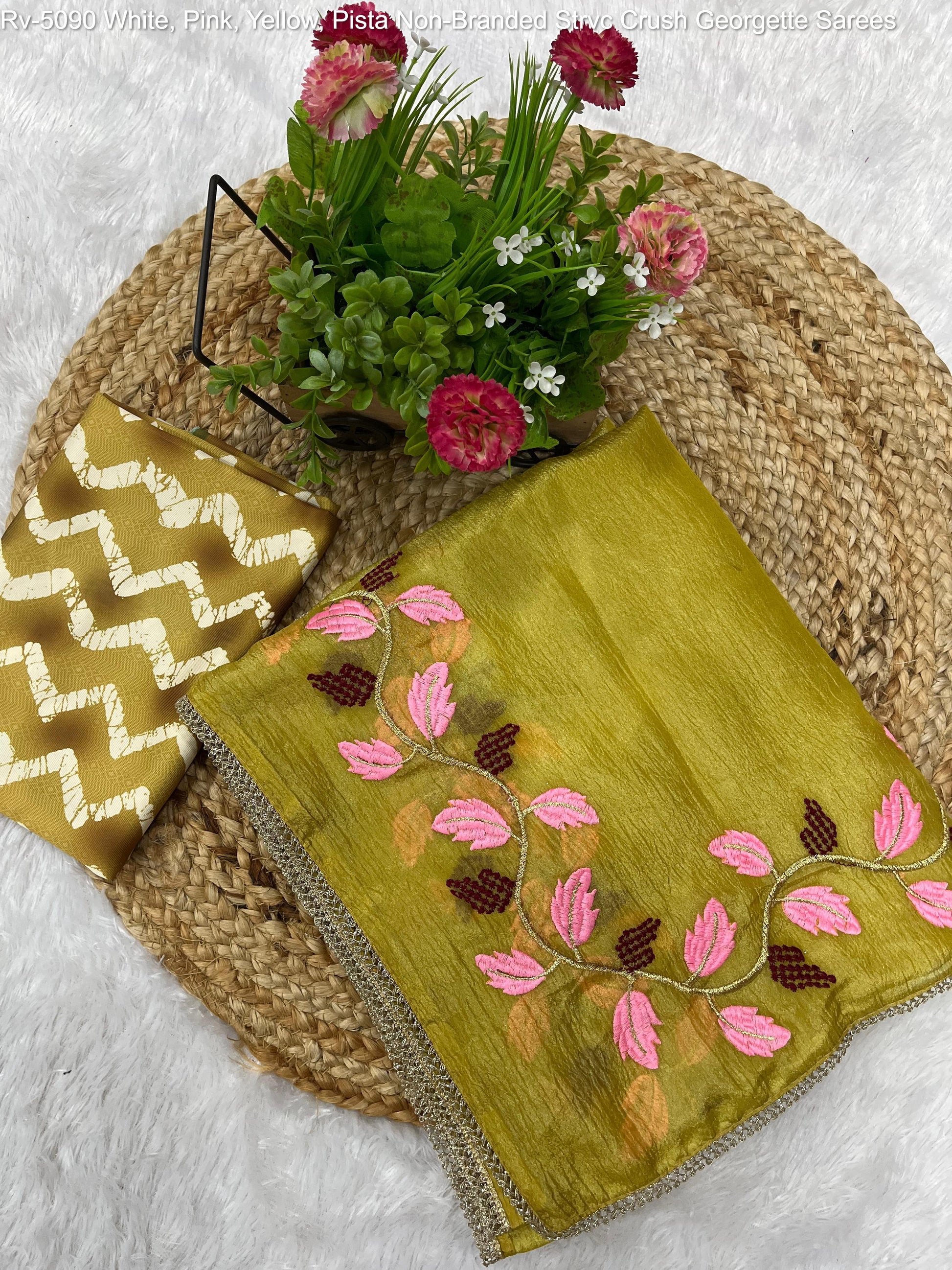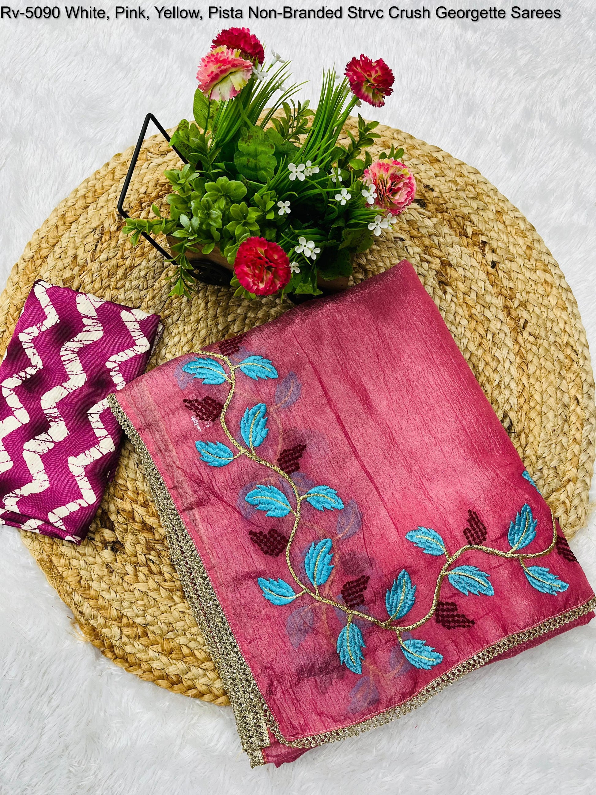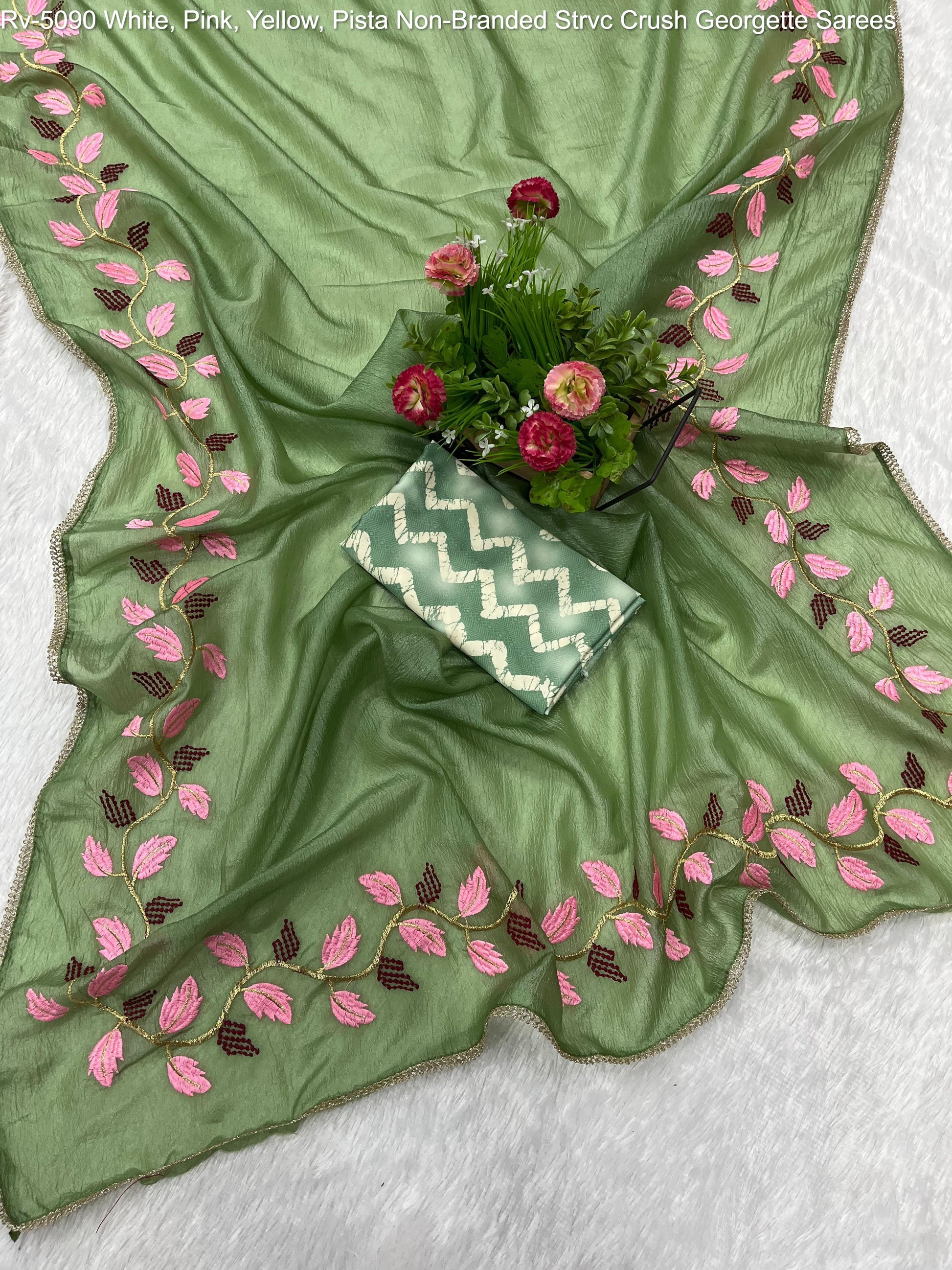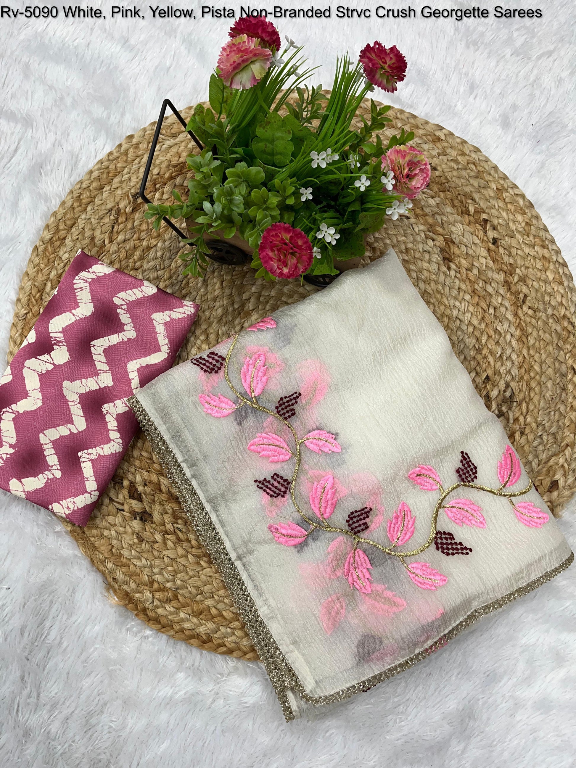 Rv-5090 White, Pink, Yellow, Pista Non-Branded Strvc Crush Georgette Sarees