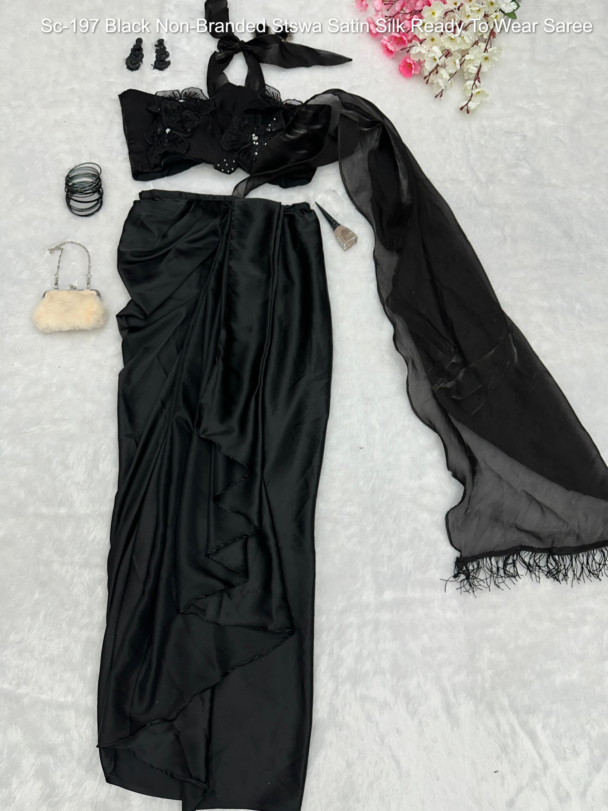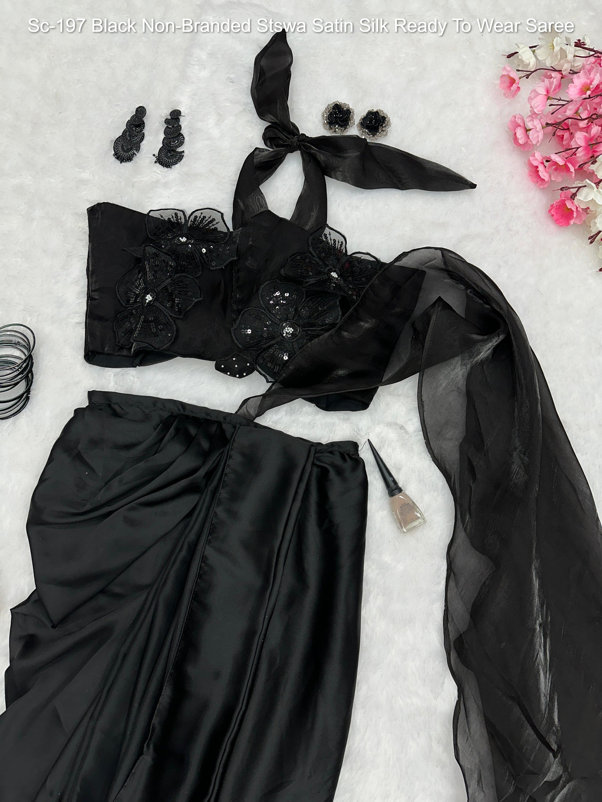 Sc-197 Black Non-Branded Stswa Satin Silk Ready To Wear Saree
