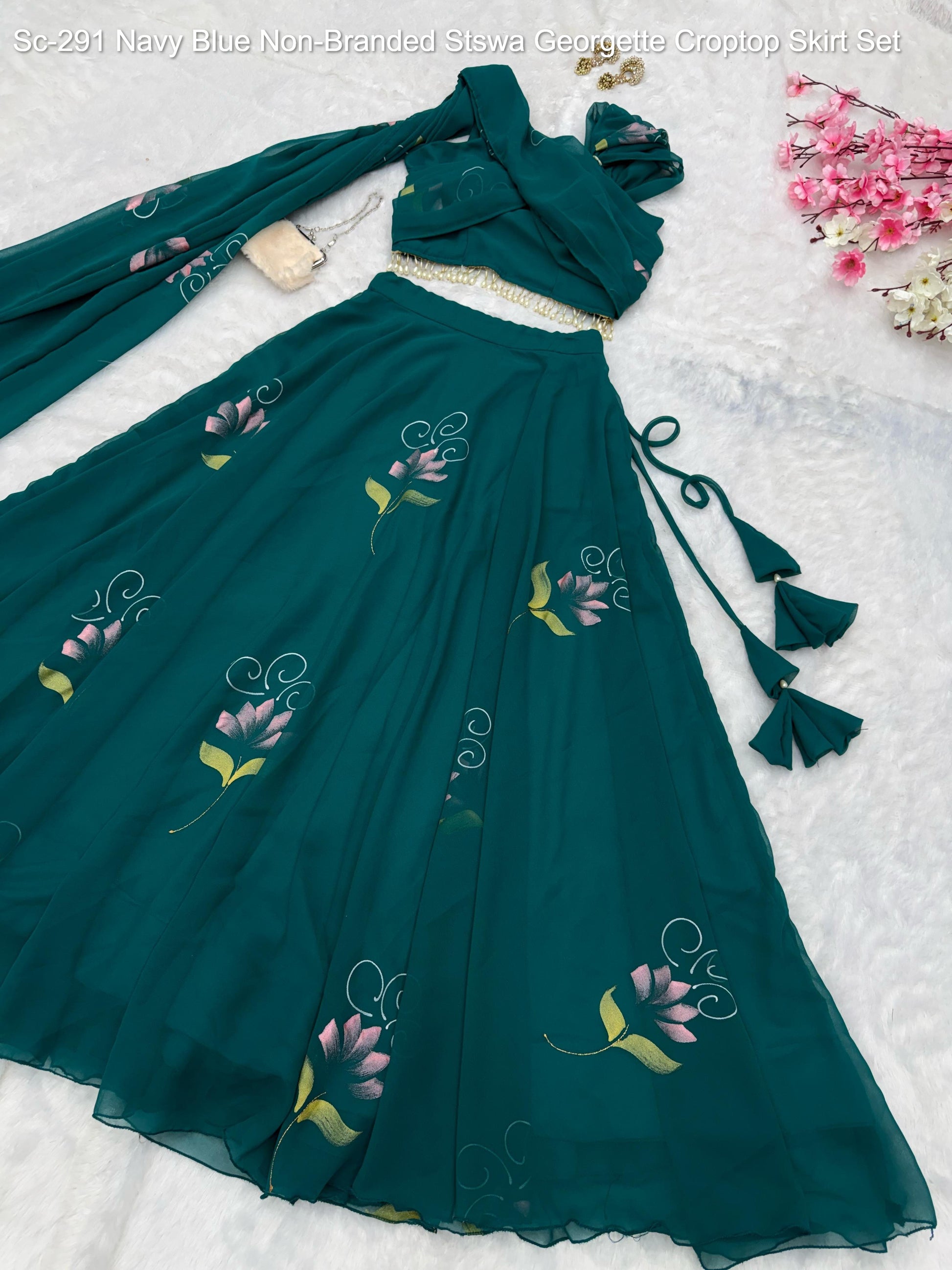 - Sc-291 Navy Blue Non-Branded Stswa Georgette Croptop Skirt Set Dealer Ahmedabad Surat Wholesale Gujarat India Lowest Price Best Quality Buy Purchase Shipping Kurta Salwaar Kameez Also free Cash on delivery