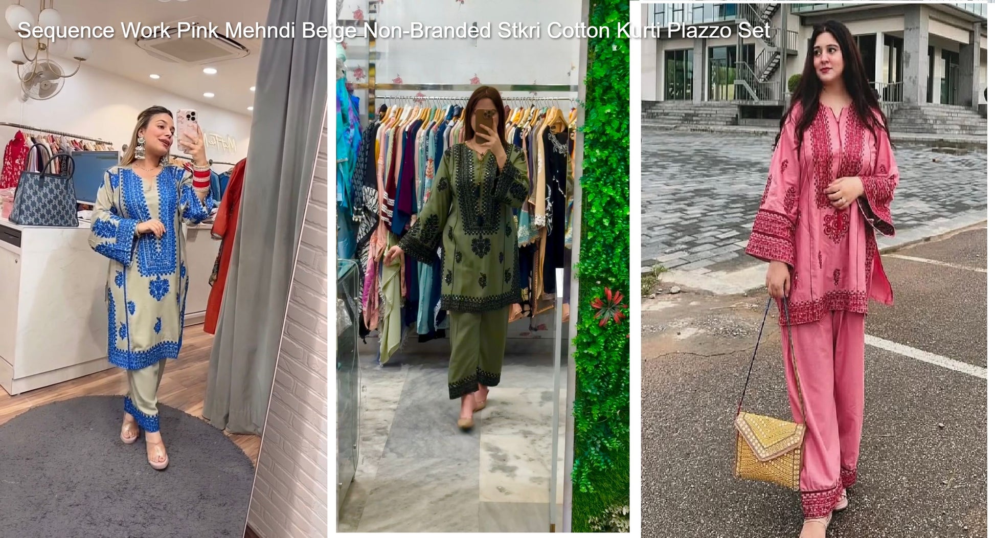 - Sequence Work Pink Mehndi Beige Non-Branded Stkri Cotton Kurti Plazzo Set Dealer Ahmedabad Surat Wholesale Gujarat India Lowest Price Best Quality Buy Purchase Shipping Kurta Salwaar Kameez Also free Cash on delivery