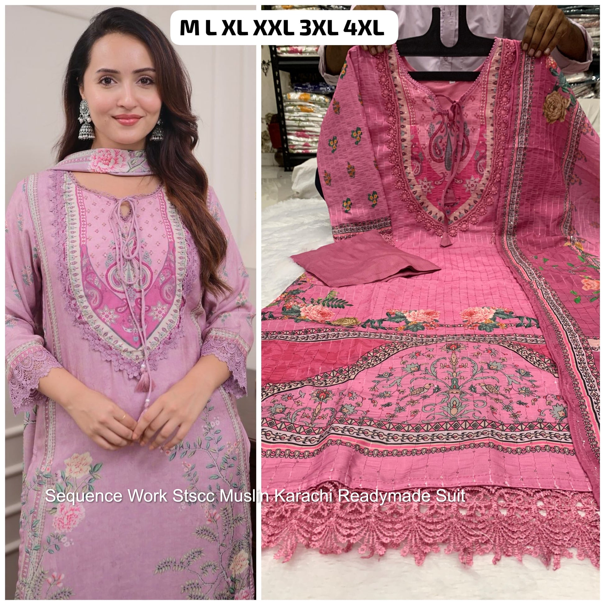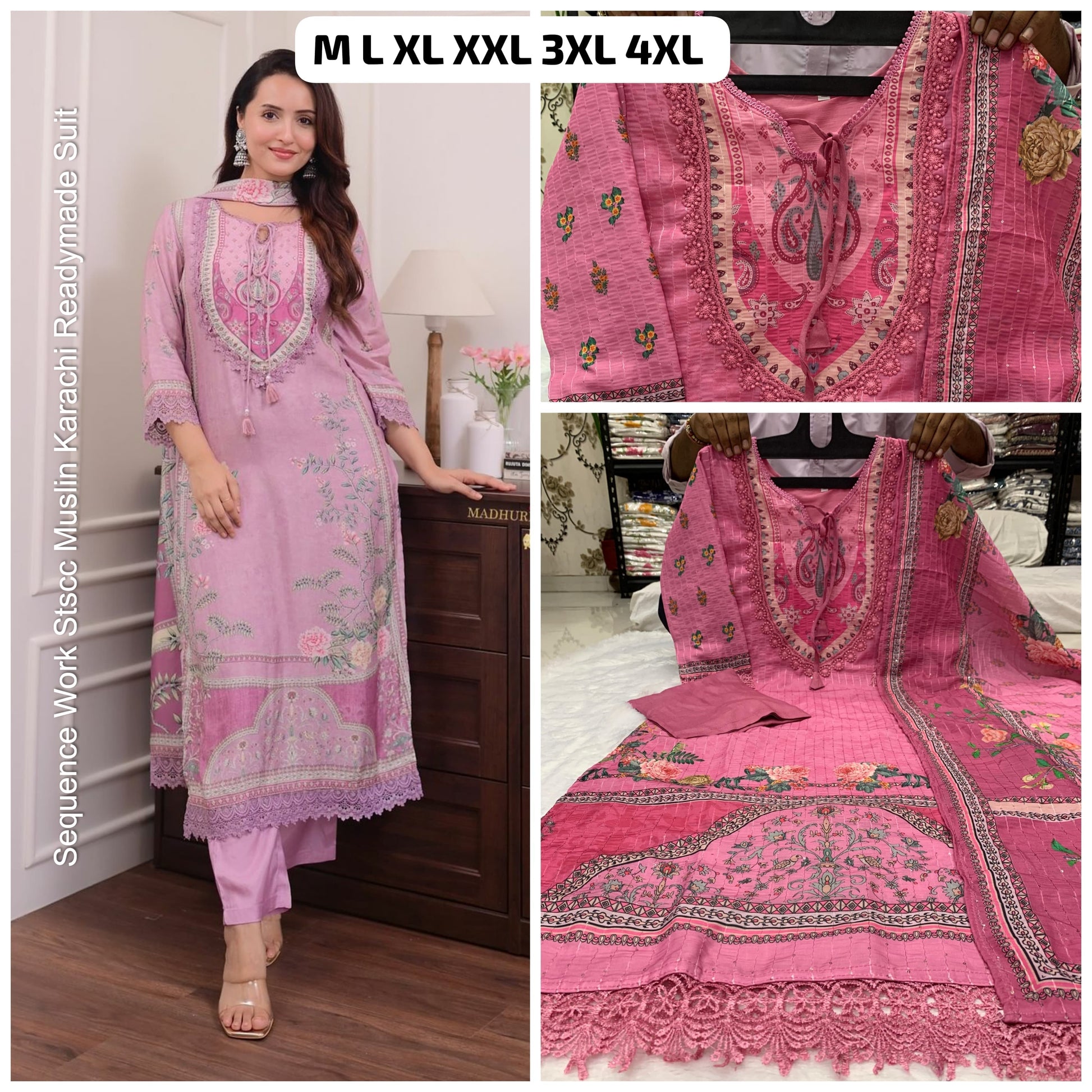 - Fabric Detail: Top : Pure Muslin With Sequence Work Digital Print , Bottom : Pure Muslin , Dupatta : Pure Muslin With Print , Size : M, L, Xl, 2Xl, 3Xl, 4Xl