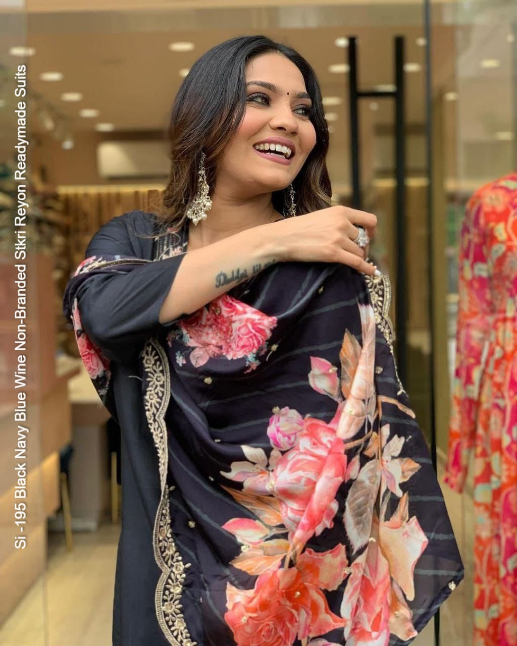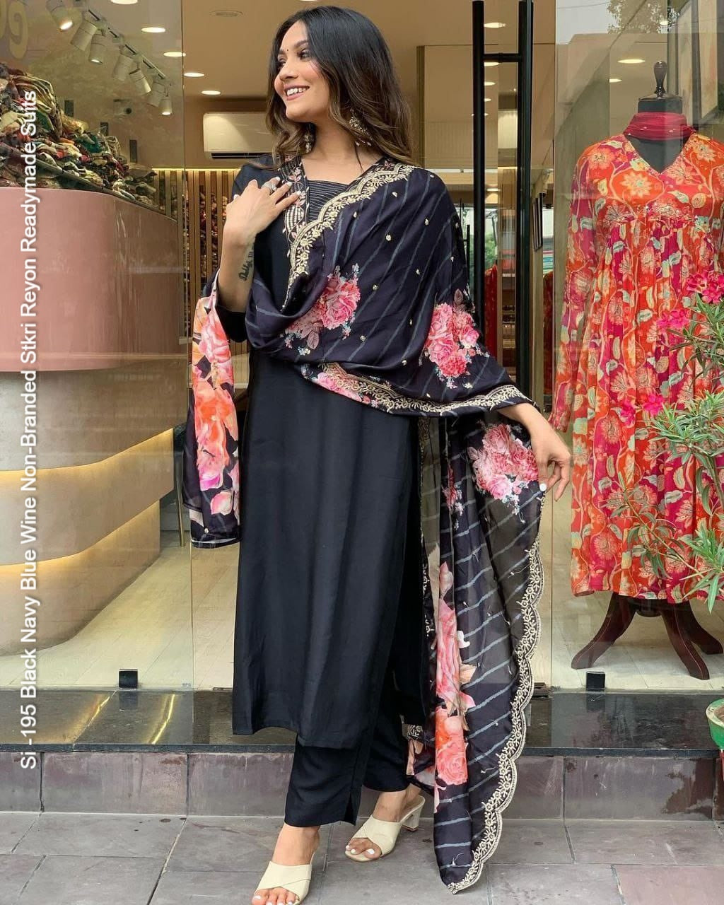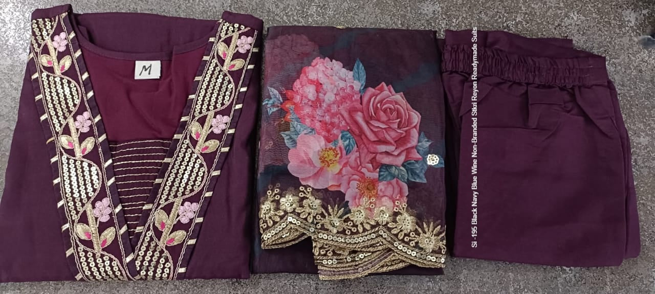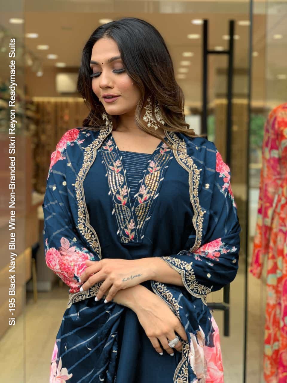 Si -195 Black Navy Blue Wine Non-Branded Stkri Reyon Readymade Suits