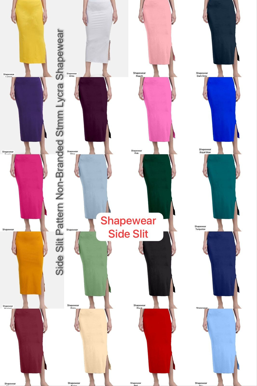 - Fabric Detail: Heavy Stretchable Lycra Waist Band Shapewear With Side Slit Length : 37 Apx , Colour : Beige, Rani, Wine, Mustard, Maroon, Pista, Black, Blue, Dark Grey, Yellow, Purple, Grey, Royal Blue, Pink, Green, Peach, Sky, White, Turquoise, Red , , Size : M, L, Xl, 2Xl Plus Size Upt To 40, ( 20 Rs ) Extra