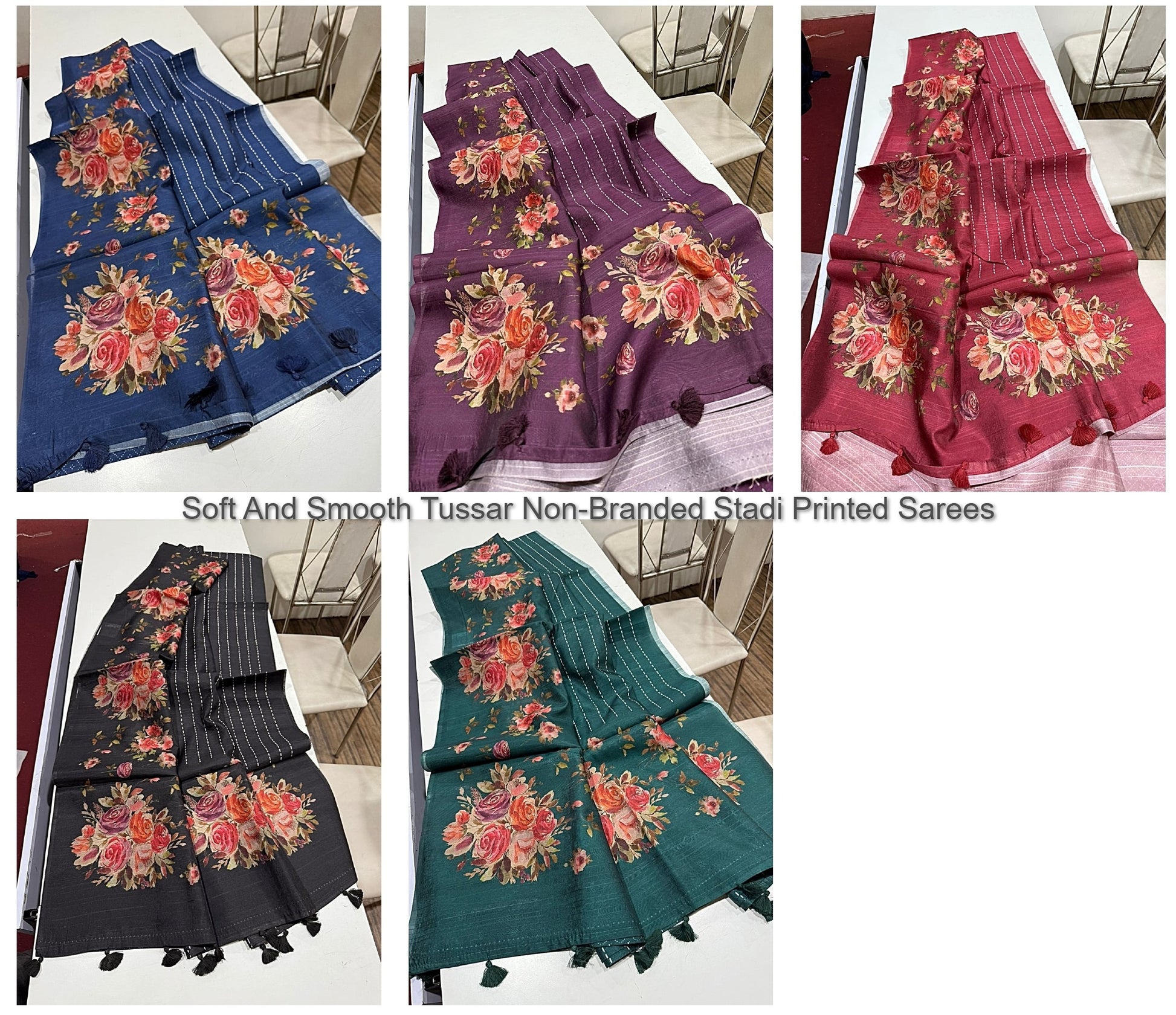 - Fabric Detail: Saree : Premium And Superior Semi Desi Soft And Smooth Tussar With Indeed Digital Print Floral Design All Over Pallu Floral And Tassels Finish , Blouse : Pairs With Beautiful Running Printed , Colour : Dark Blue, Wine, Black, Dark Peach, Rama ,