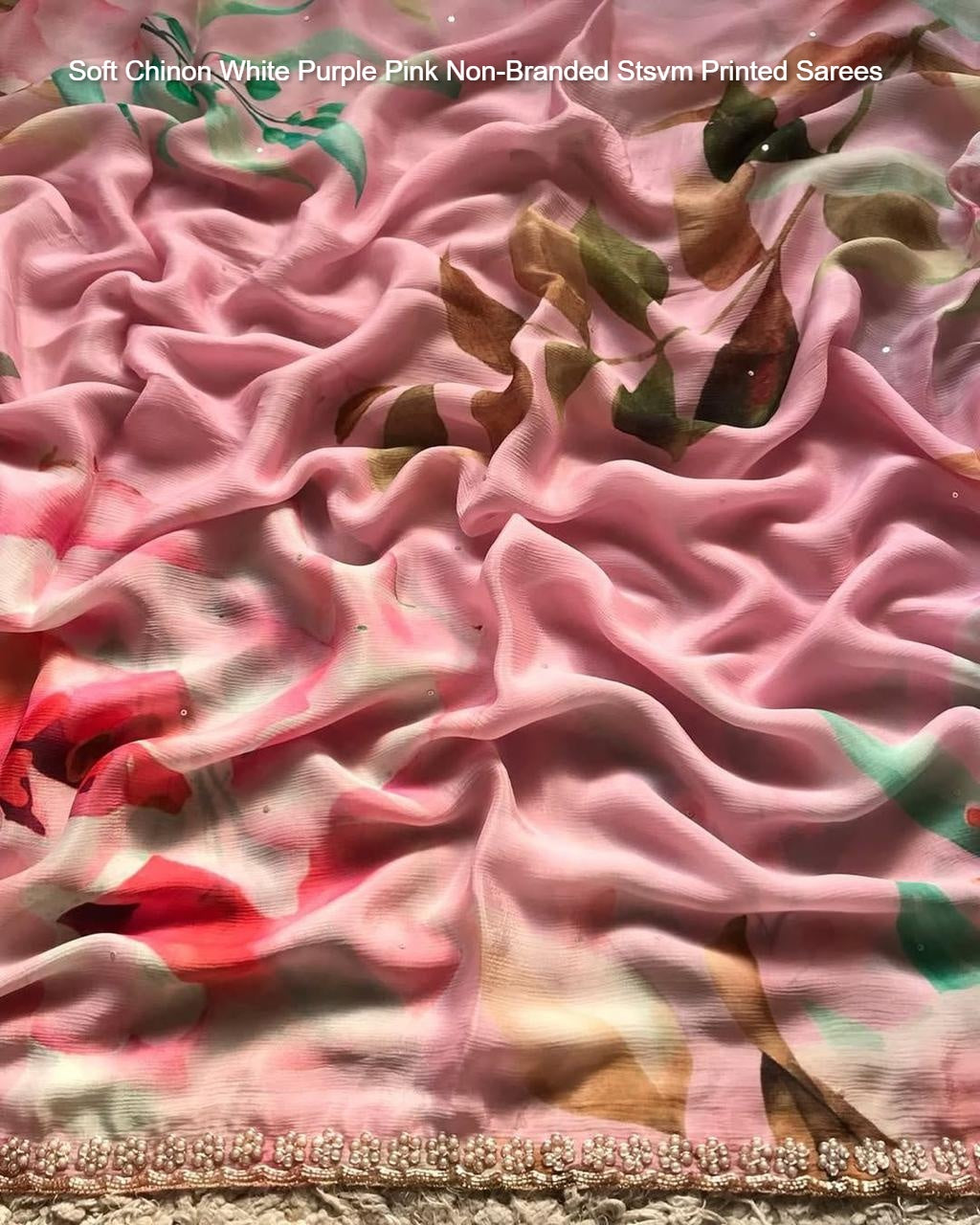 Soft Chinon White Purple Pink Non-Branded Stsvm Printed Sarees
