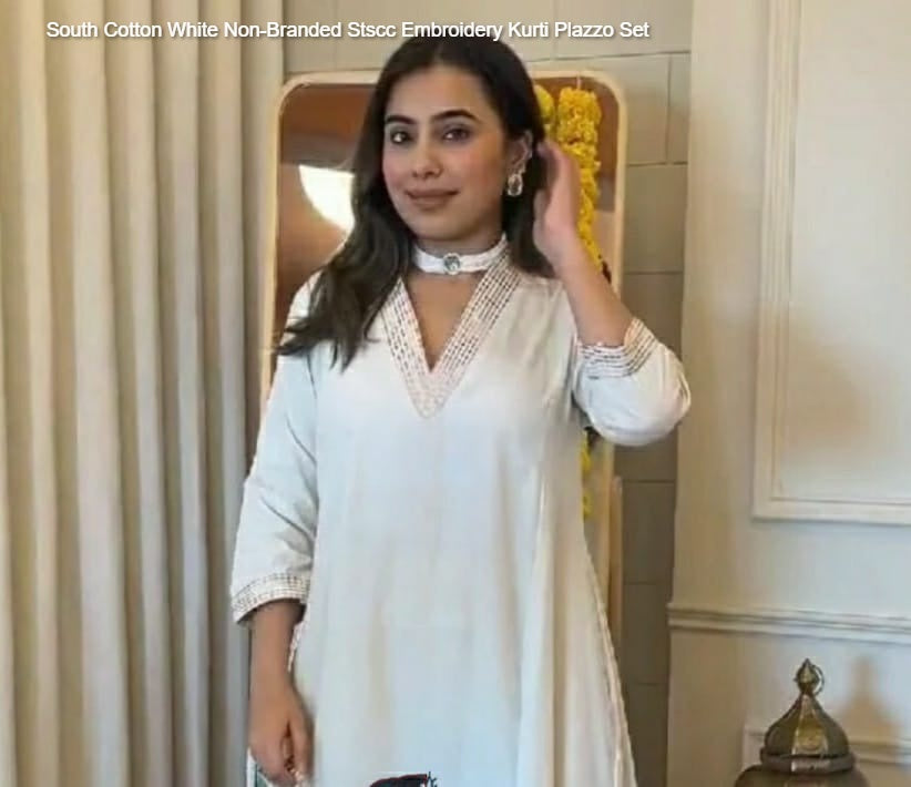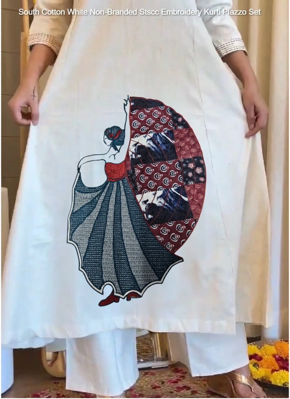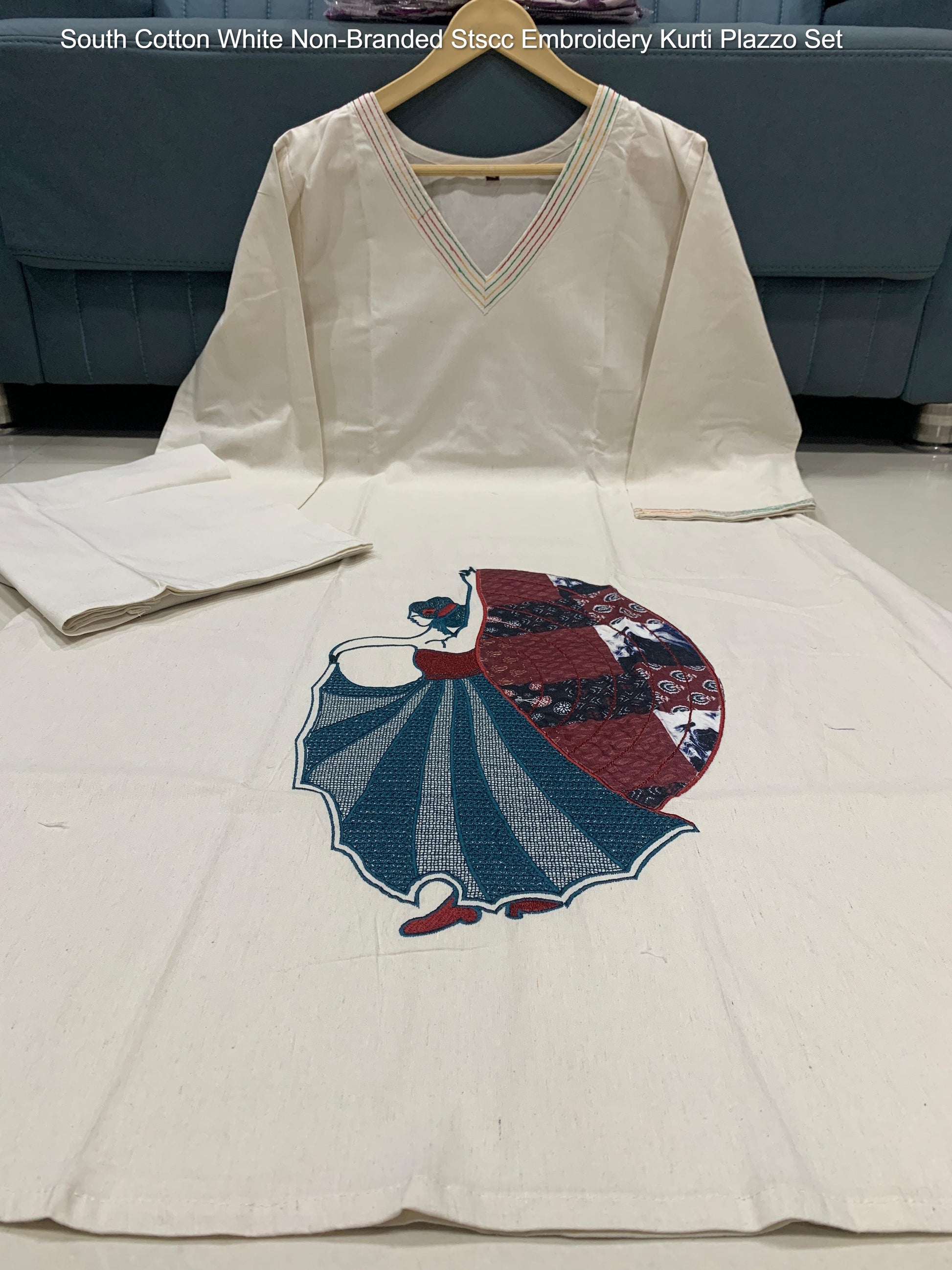 - South Cotton White Non-Branded Stscc Embroidery Kurti Plazzo Set Dealer Ahmedabad Surat Wholesale Gujarat India Lowest Price Best Quality Buy Purchase Shipping Kurta Salwaar Kameez Also free Cash on delivery