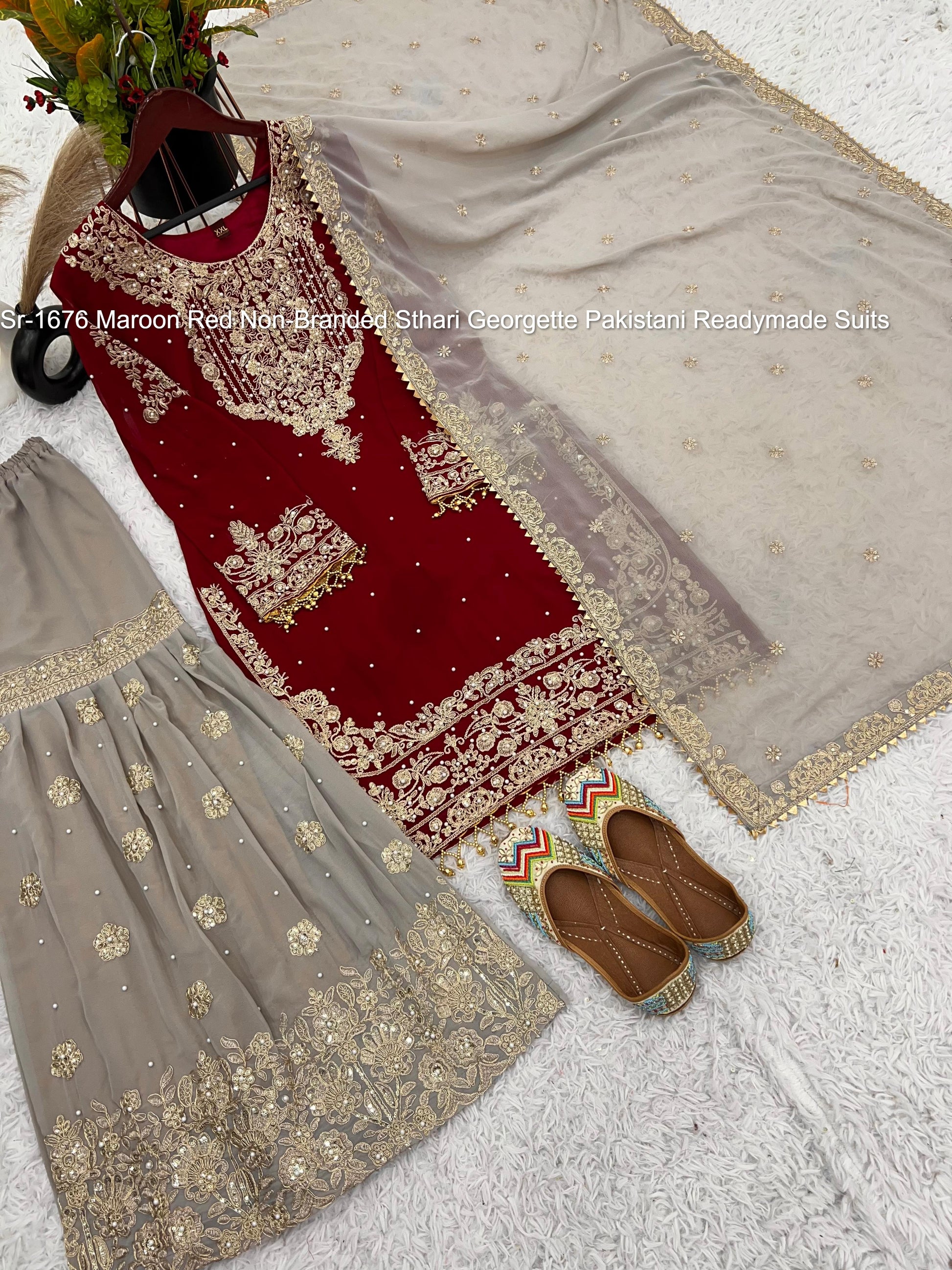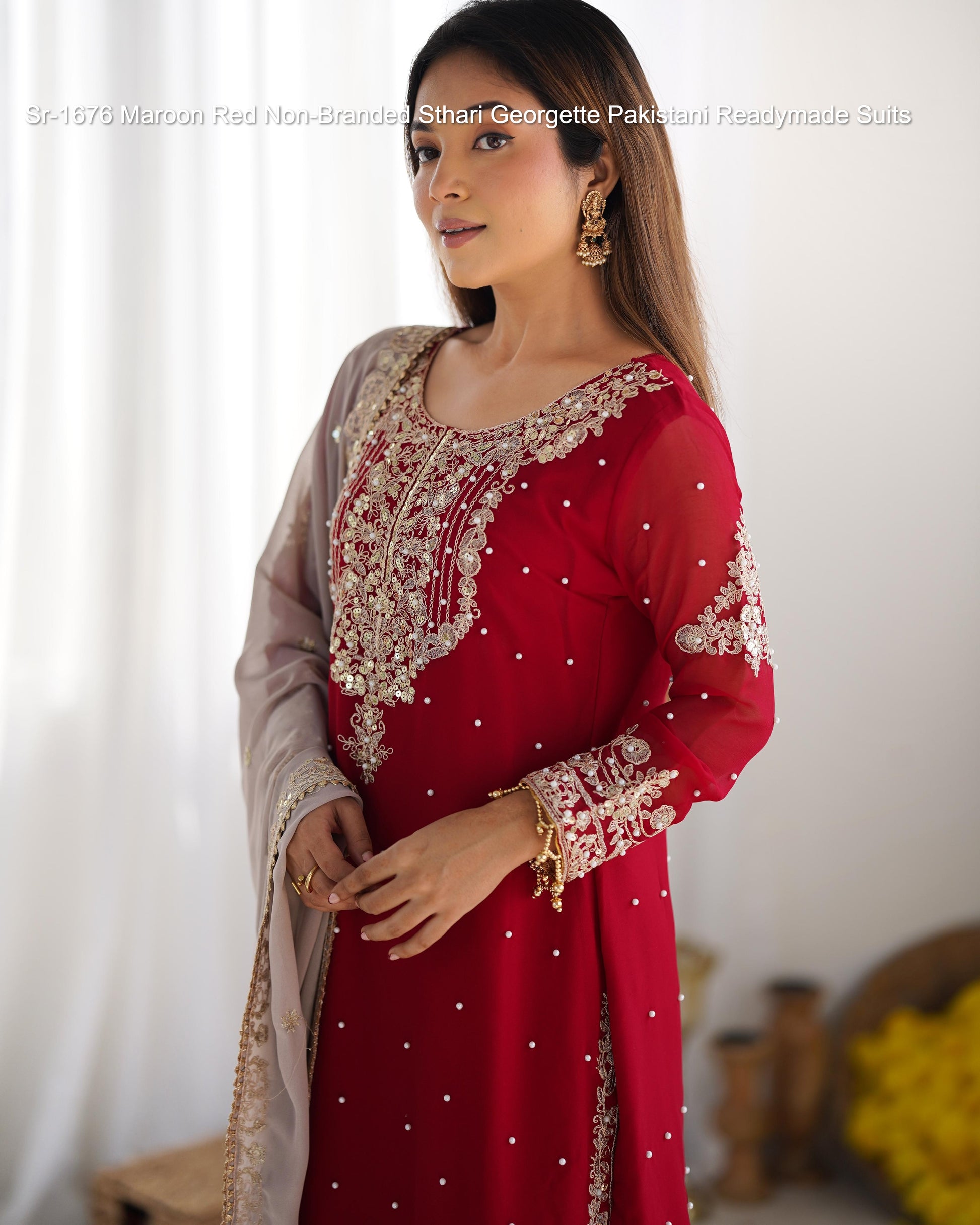 Sr-1676 Maroon Red Non-Branded Sthari Georgette Pakistani Readymade Suits