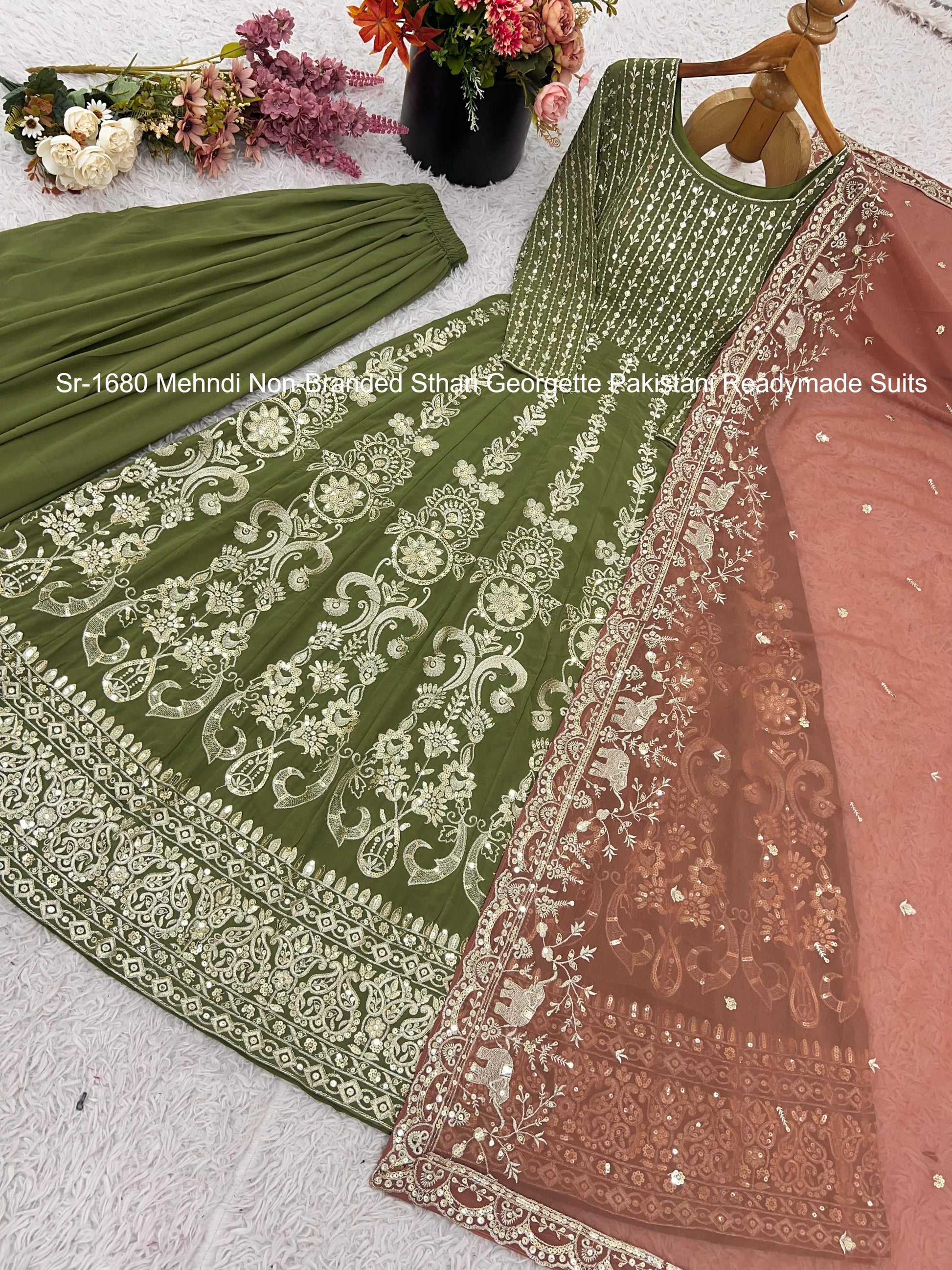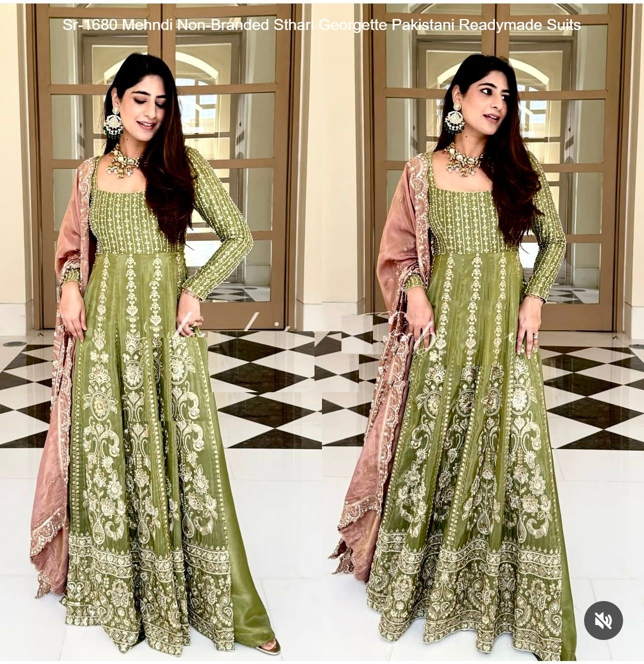 Sr-1680 Mehndi Non-Branded Sthari Georgette Pakistani Readymade Suits