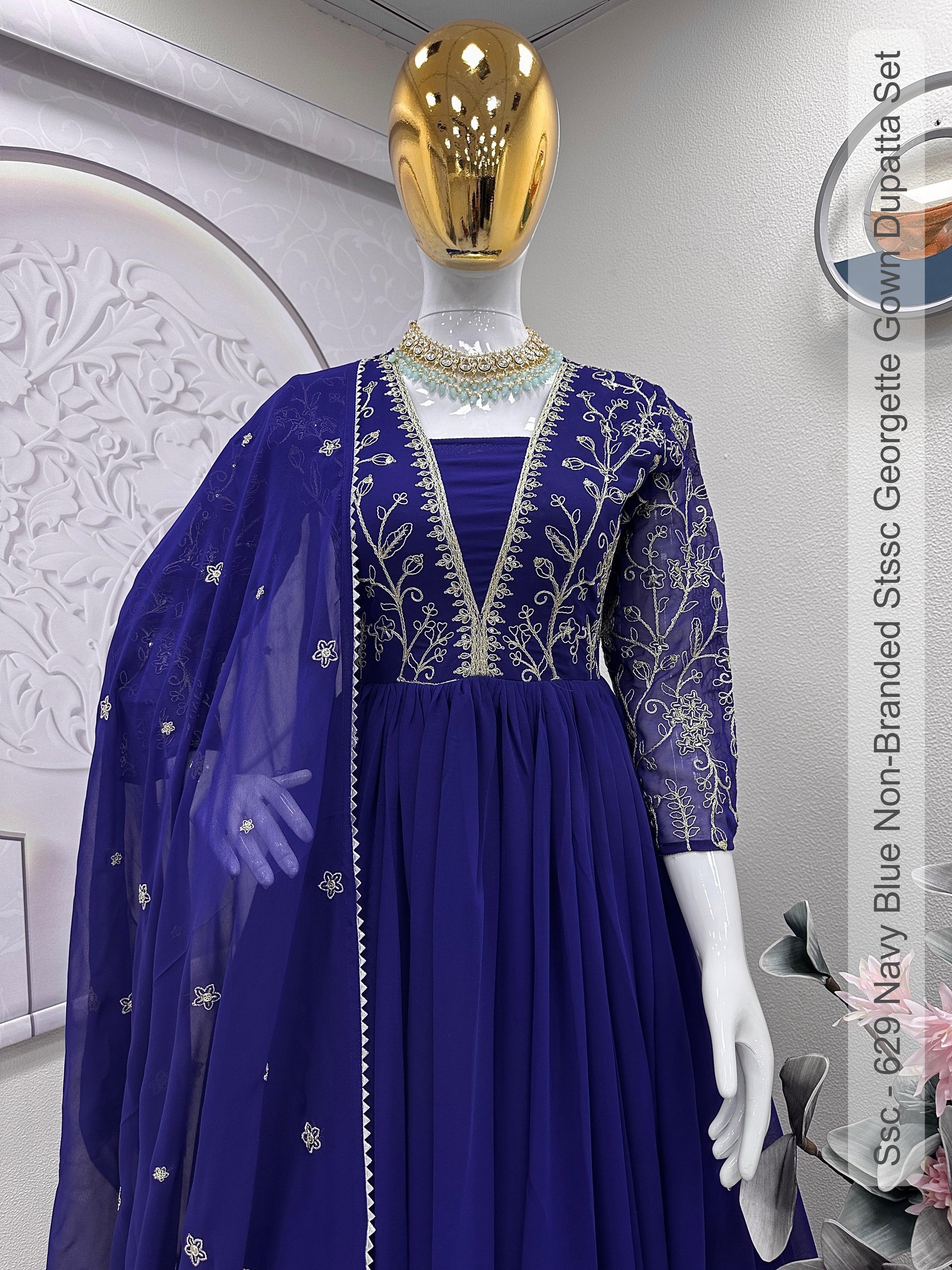 Ssc - 629 Navy Blue Non-Branded Stssc Georgette Gown Dupatta Set