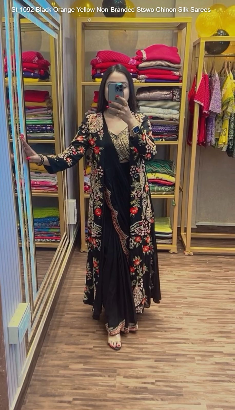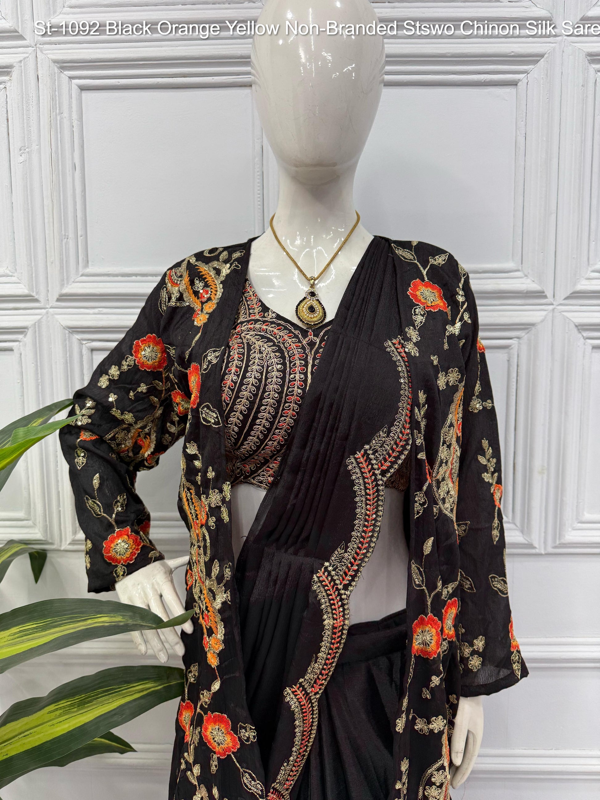 St-1092 Black Orange Yellow Non-Branded Stswo Chinon Silk Sarees