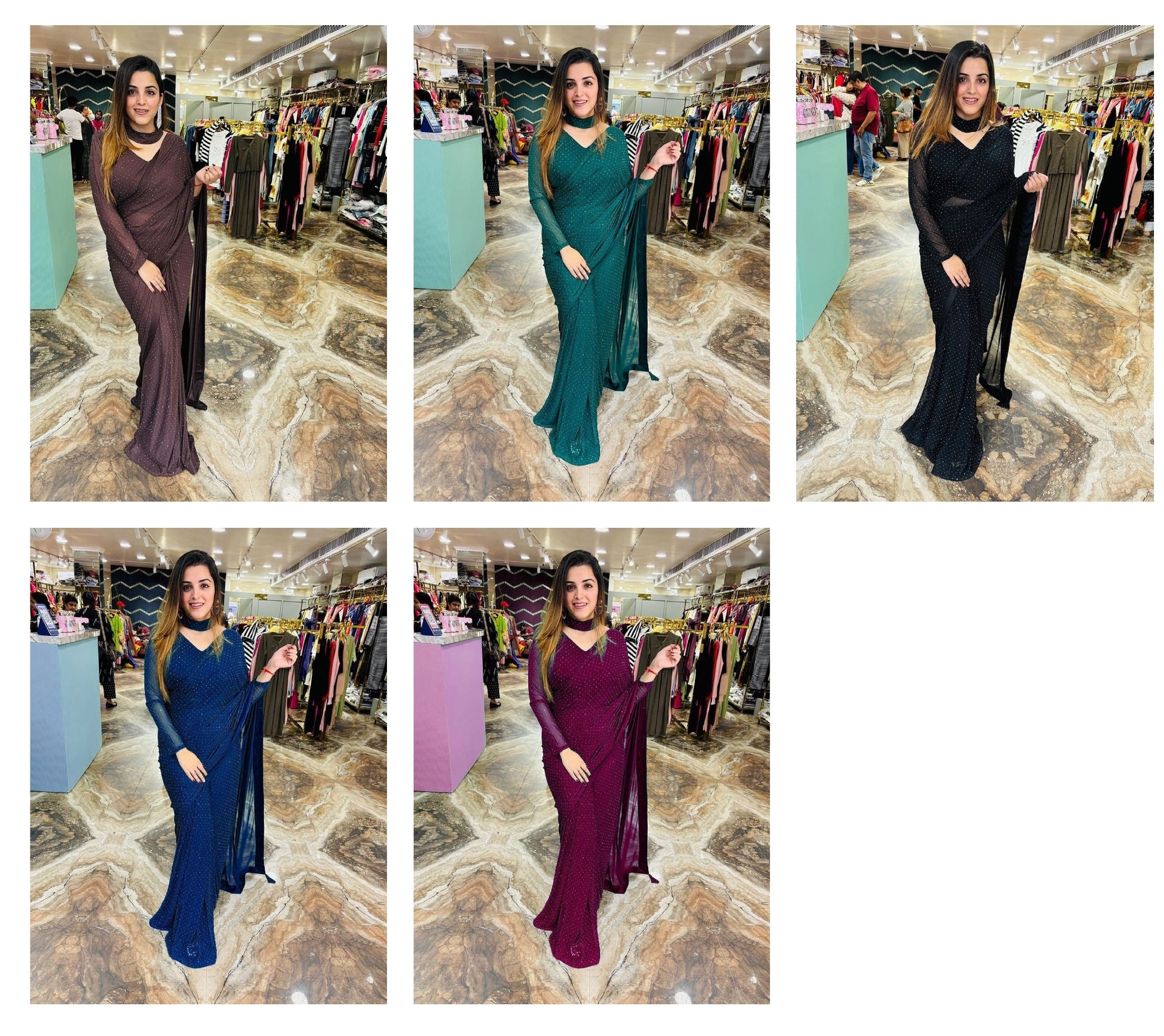 - Fabric Detail: Saree : Fux Georgette Swarovski Work,Waist Size : For All Available( 28 To 44), Blouse : Fux Georgette Swarovski Diamond Work,Fully Stitched Up To 44, Color : Black,Blue,Purple,Wine,Green,Pink,