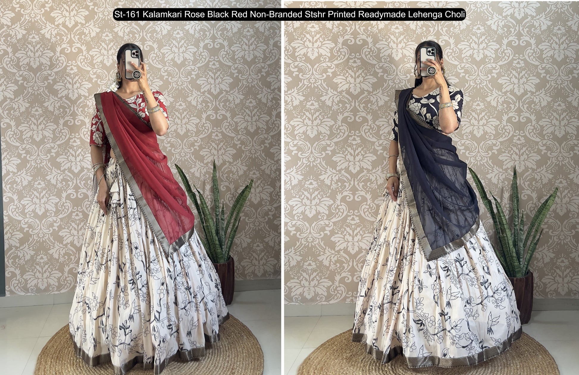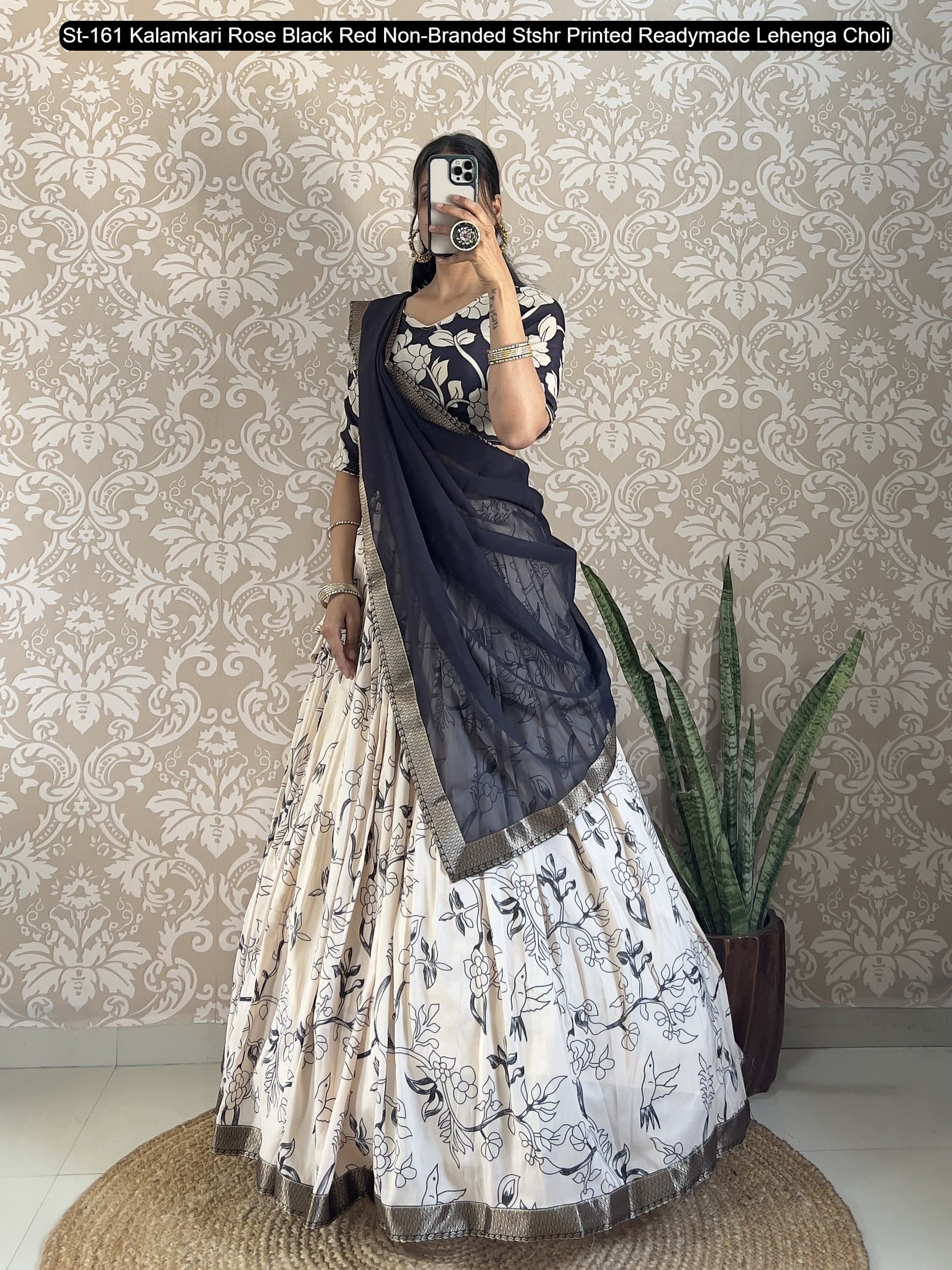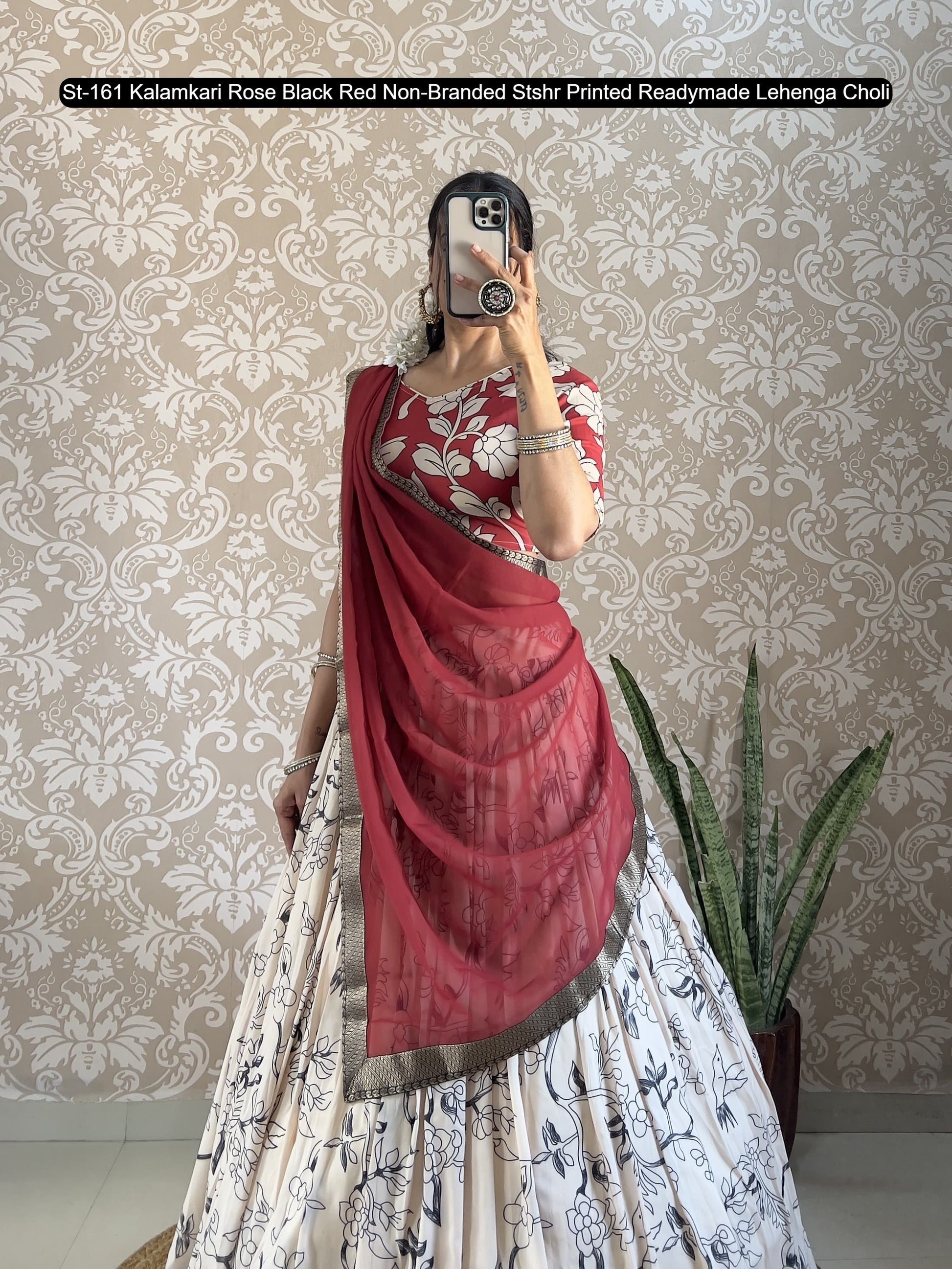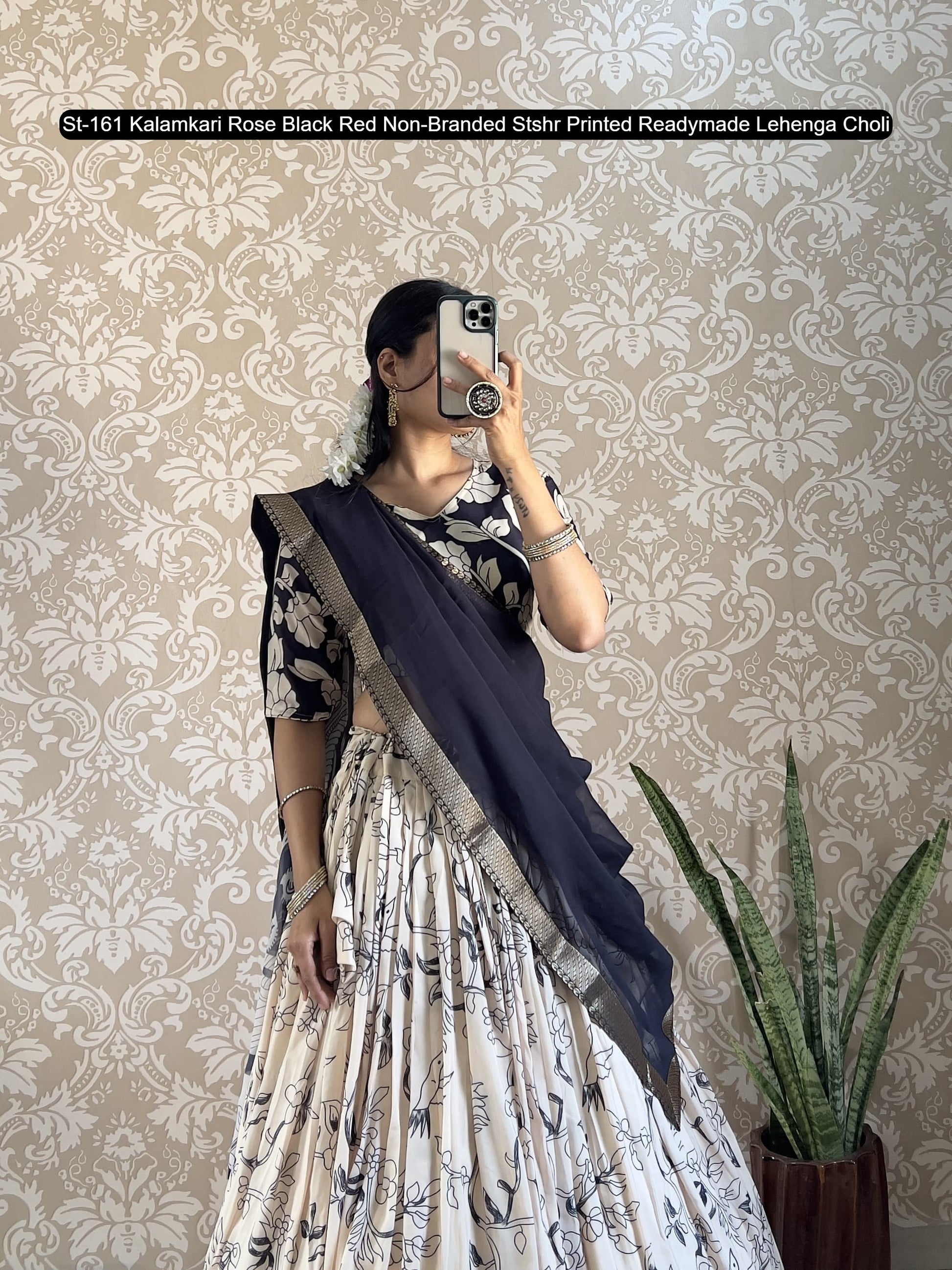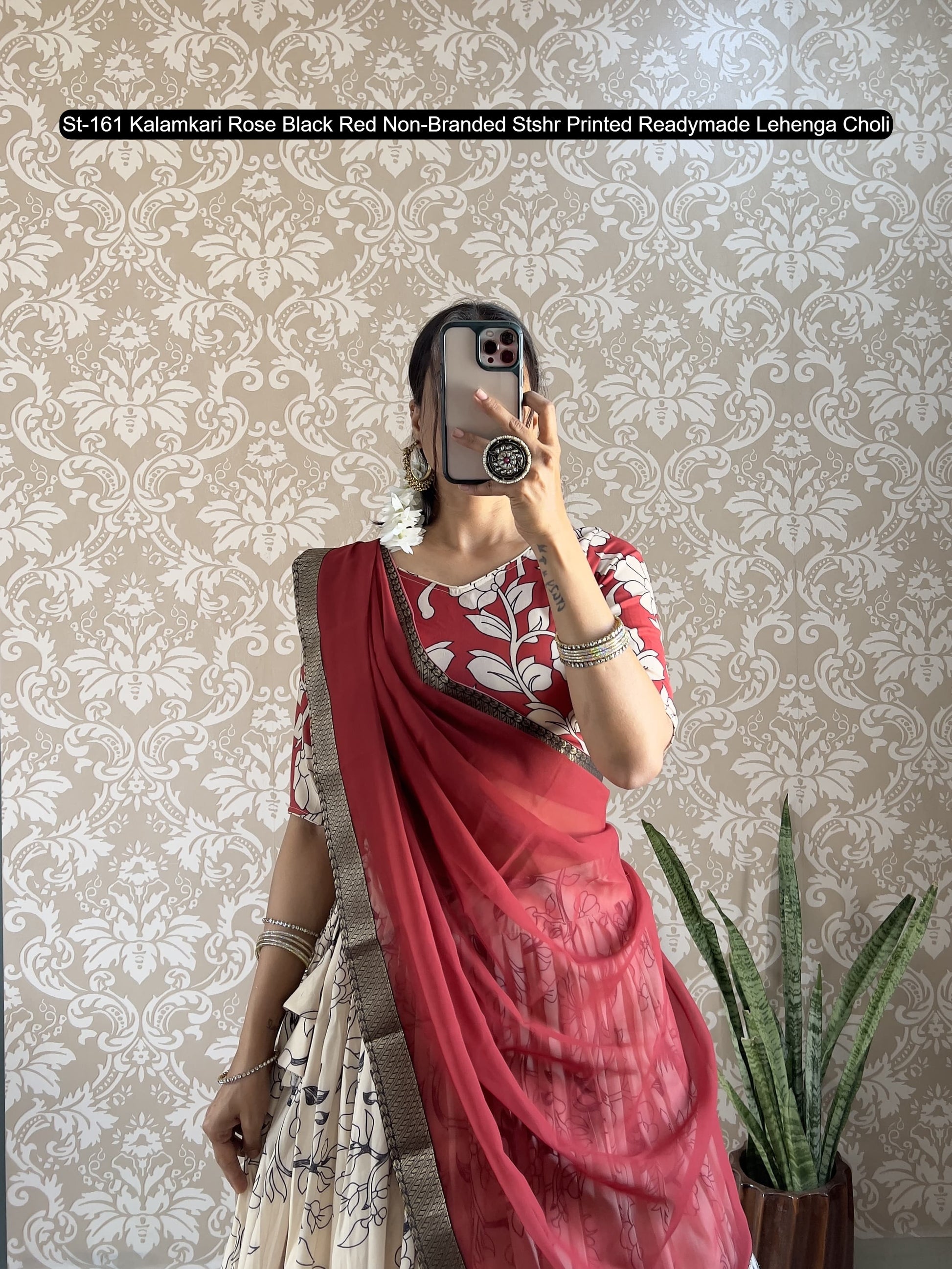 St-161 Kalamkari Rose Black Red Non-Branded Stshr Printed Readymade Lehenga Choli