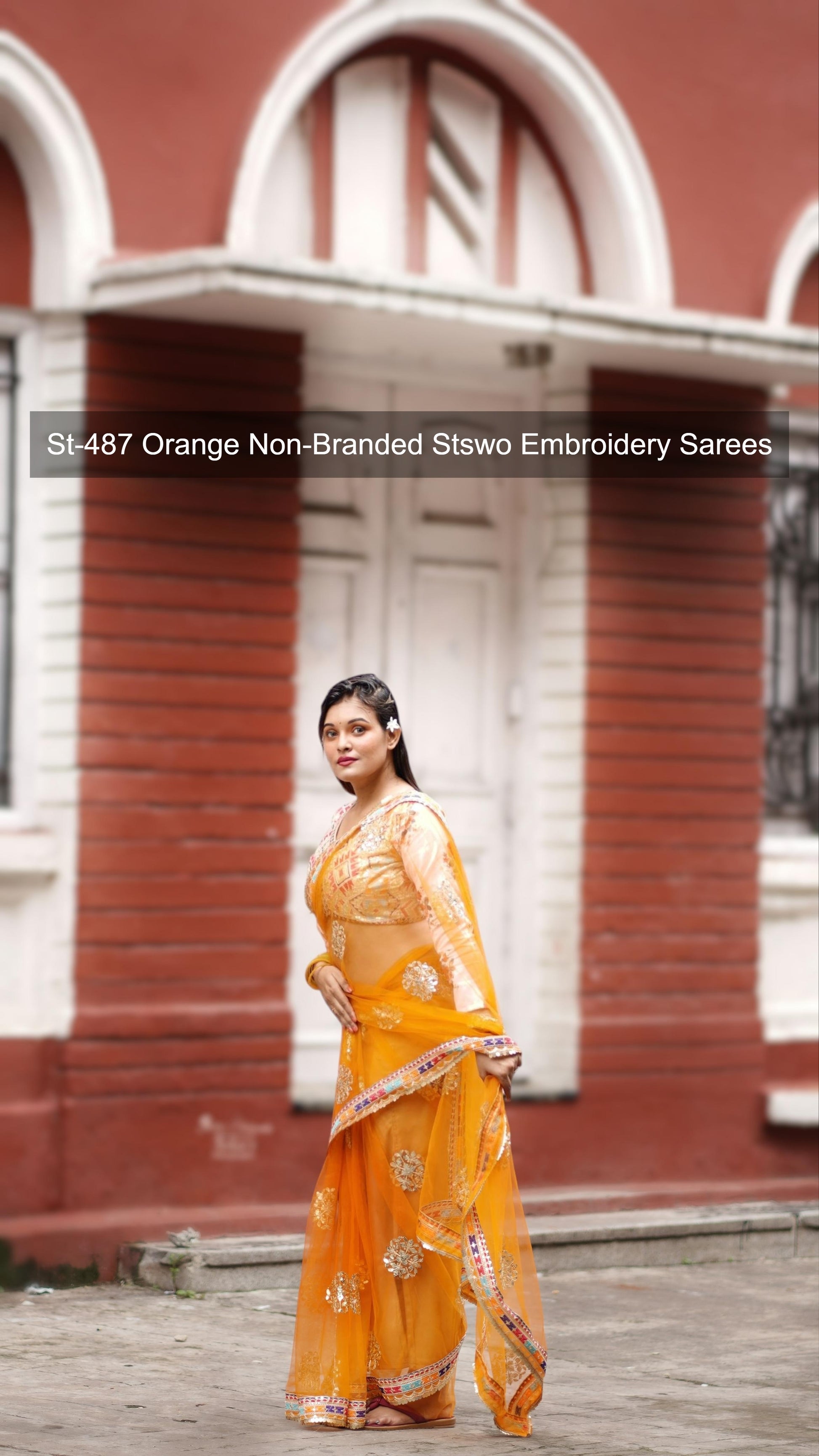 St-487 Orange Non-Branded Stswo Embroidery Sarees