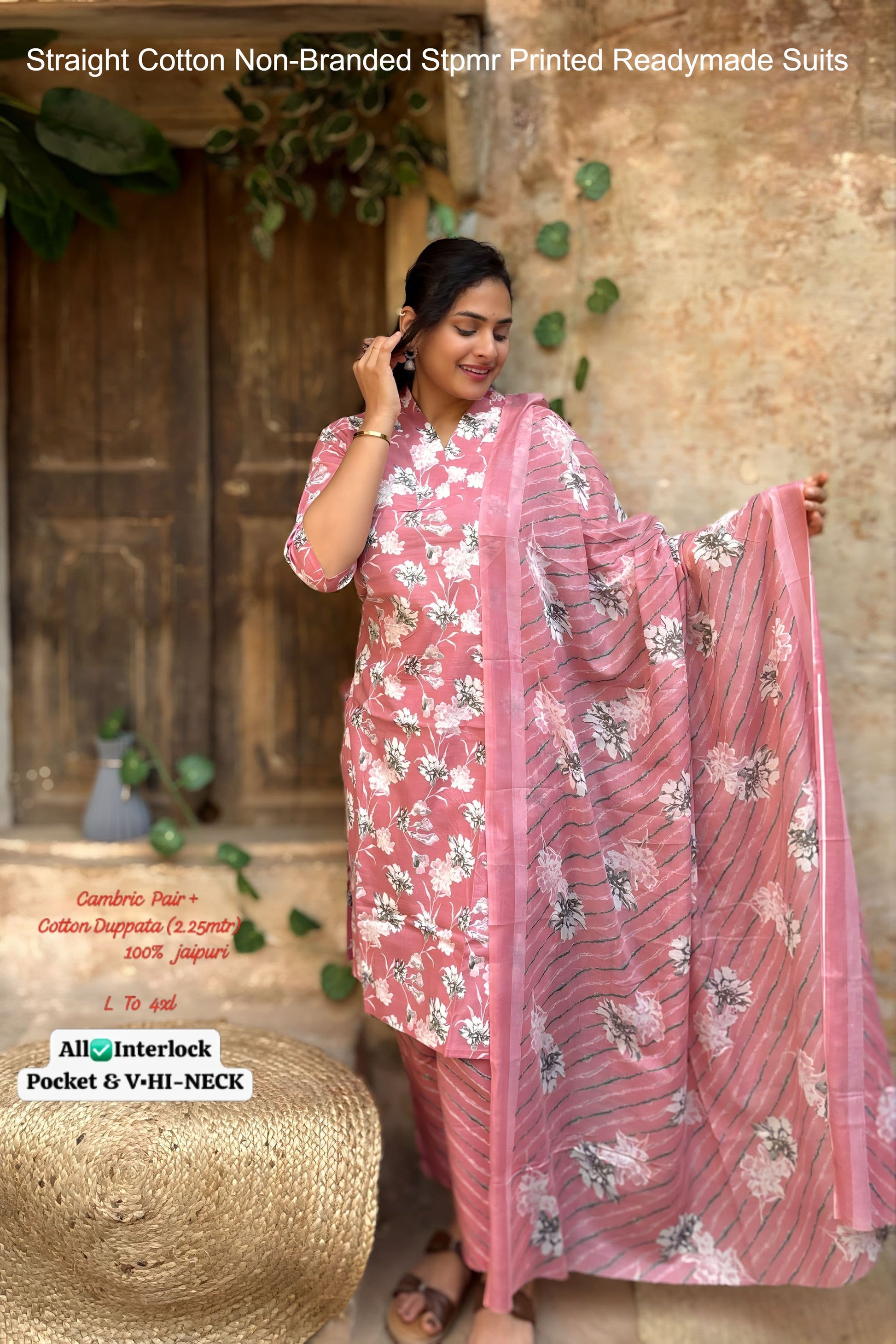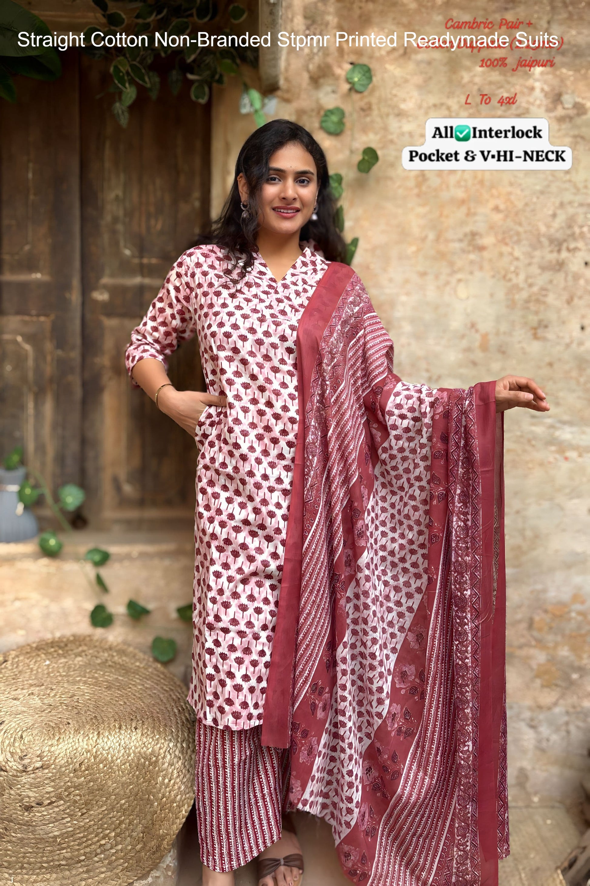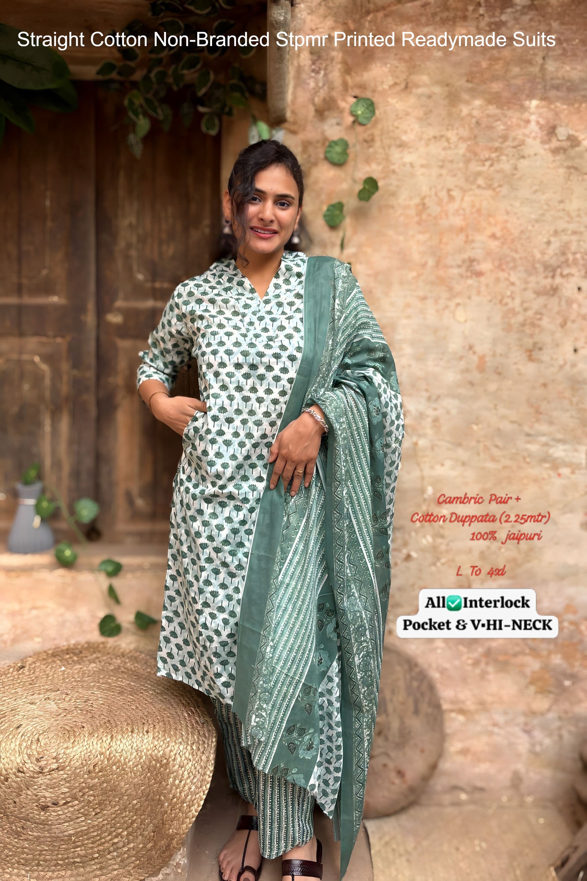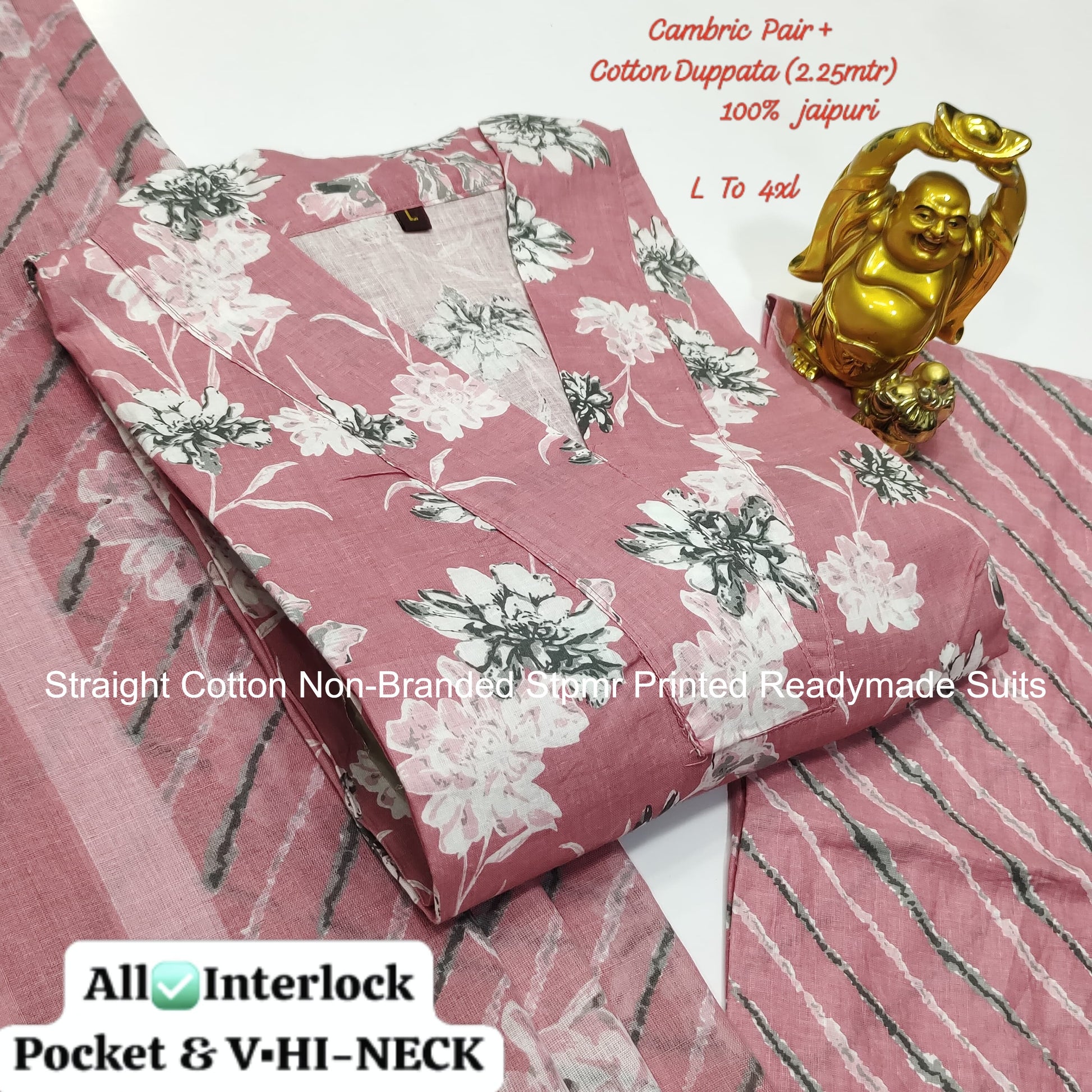 - Fabric Detail: Top : Cotton Printed Hi V Neck , Bottom : Cotton, Dupatta : Cotton , Size : L, Xl, 2Xl, 3Xl, 4Xl